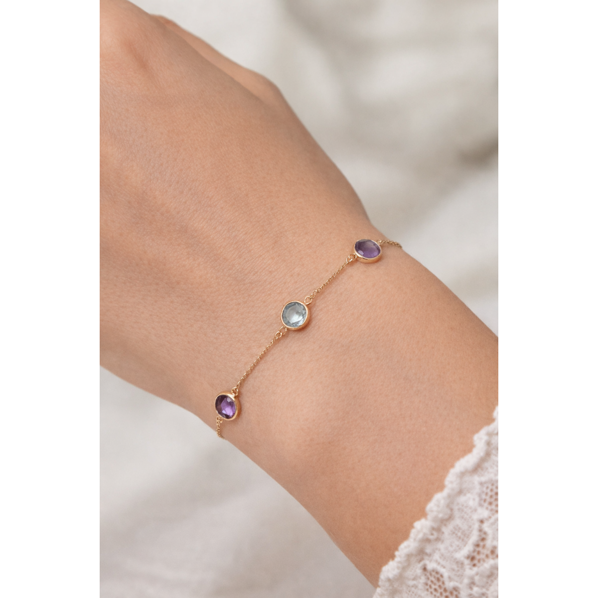 Нежна и елегантна златна гривна, украсена с изящни цветни камъни в различни нюанси. Фината верижка придава лекота и изтънченост, а блестящите камъни създават стилен акцент, който допълва всяка визия. Подходяща както за ежедневието, така и за специални поводи.
