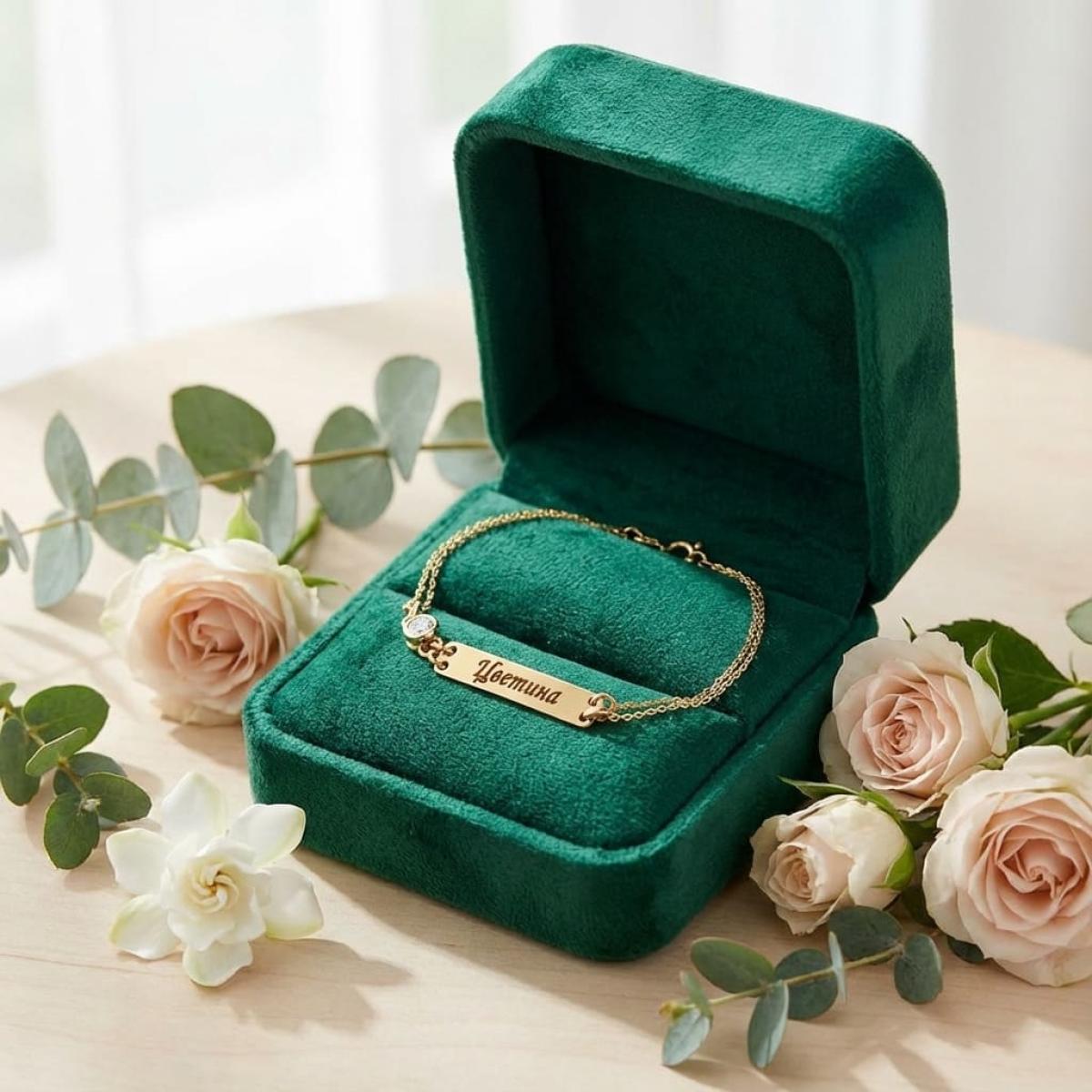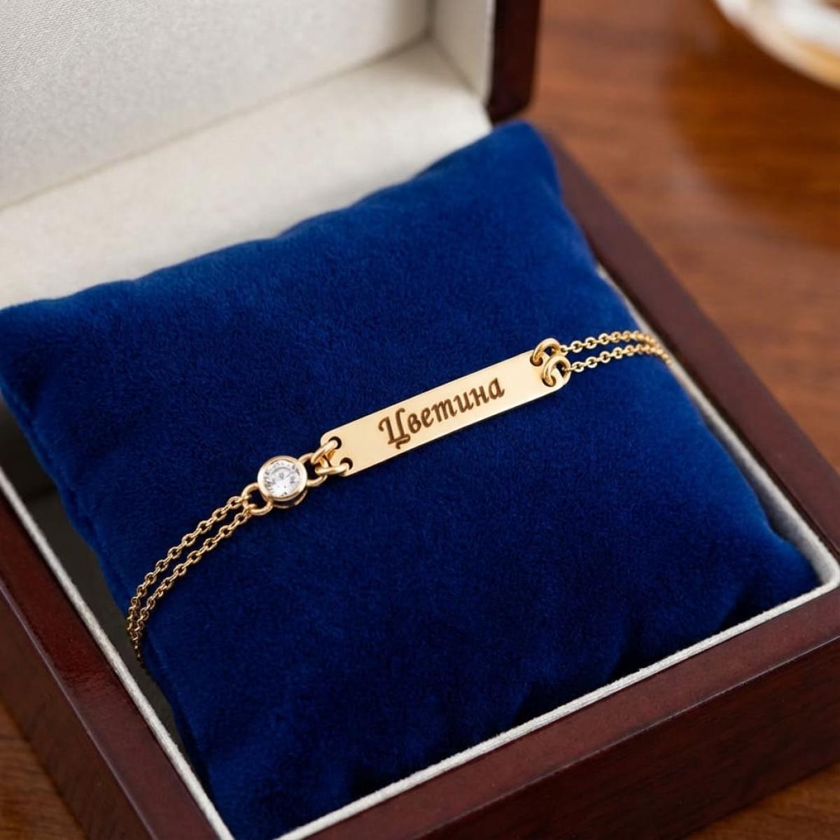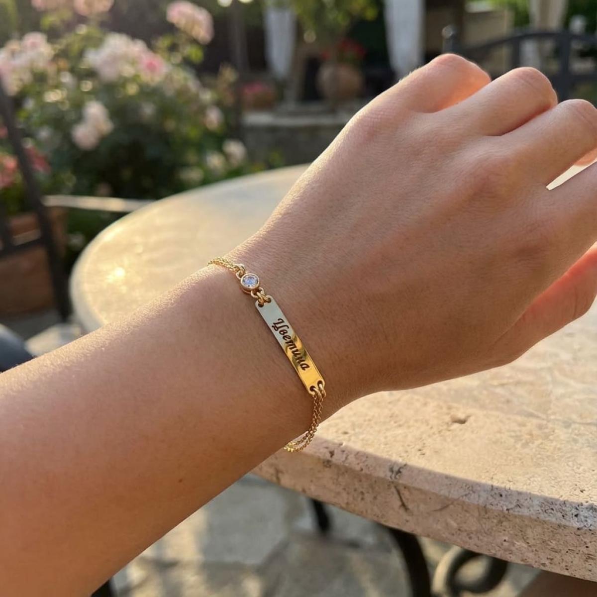 Елегантна златна гривна с двоен синджир и нежна плочка, украсена с блестящ циркон. Изработена от злато 14 карата, тя е изключително подходяща за гравиране – име, дата или специално послание.