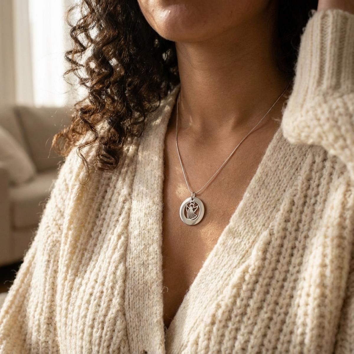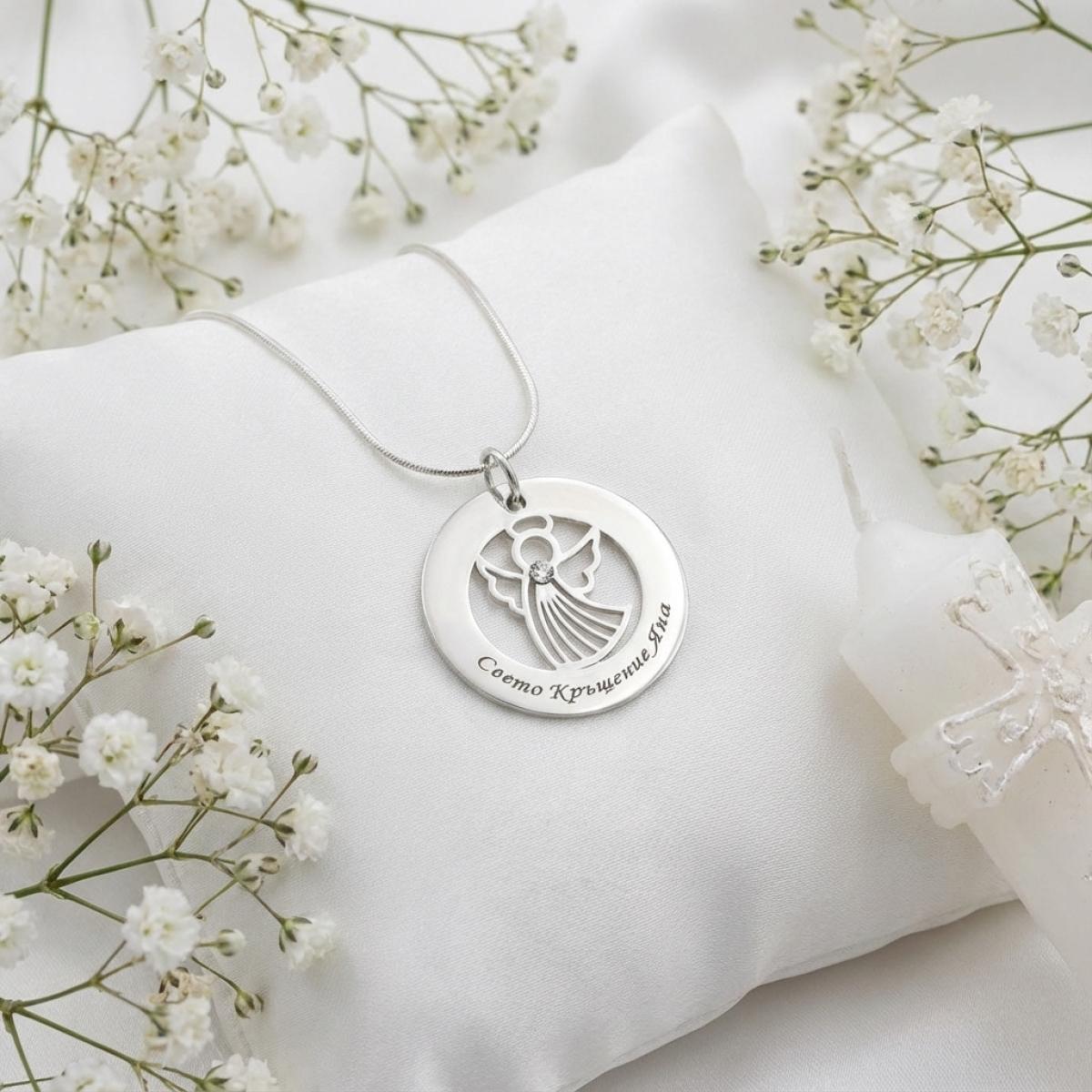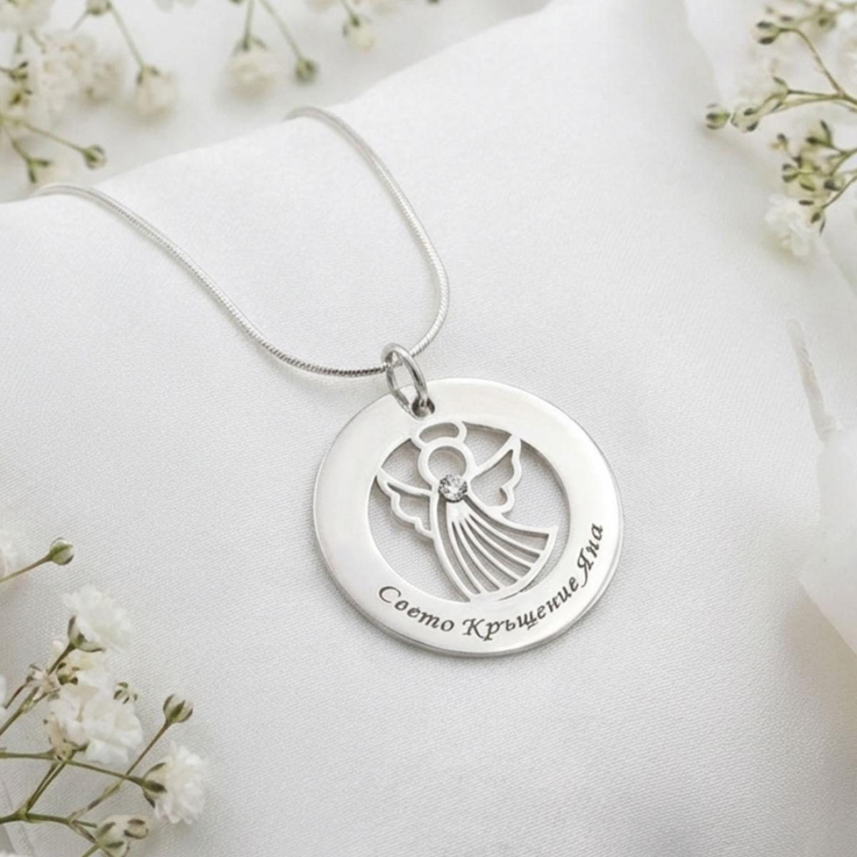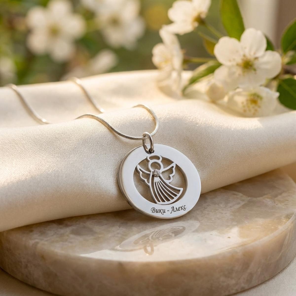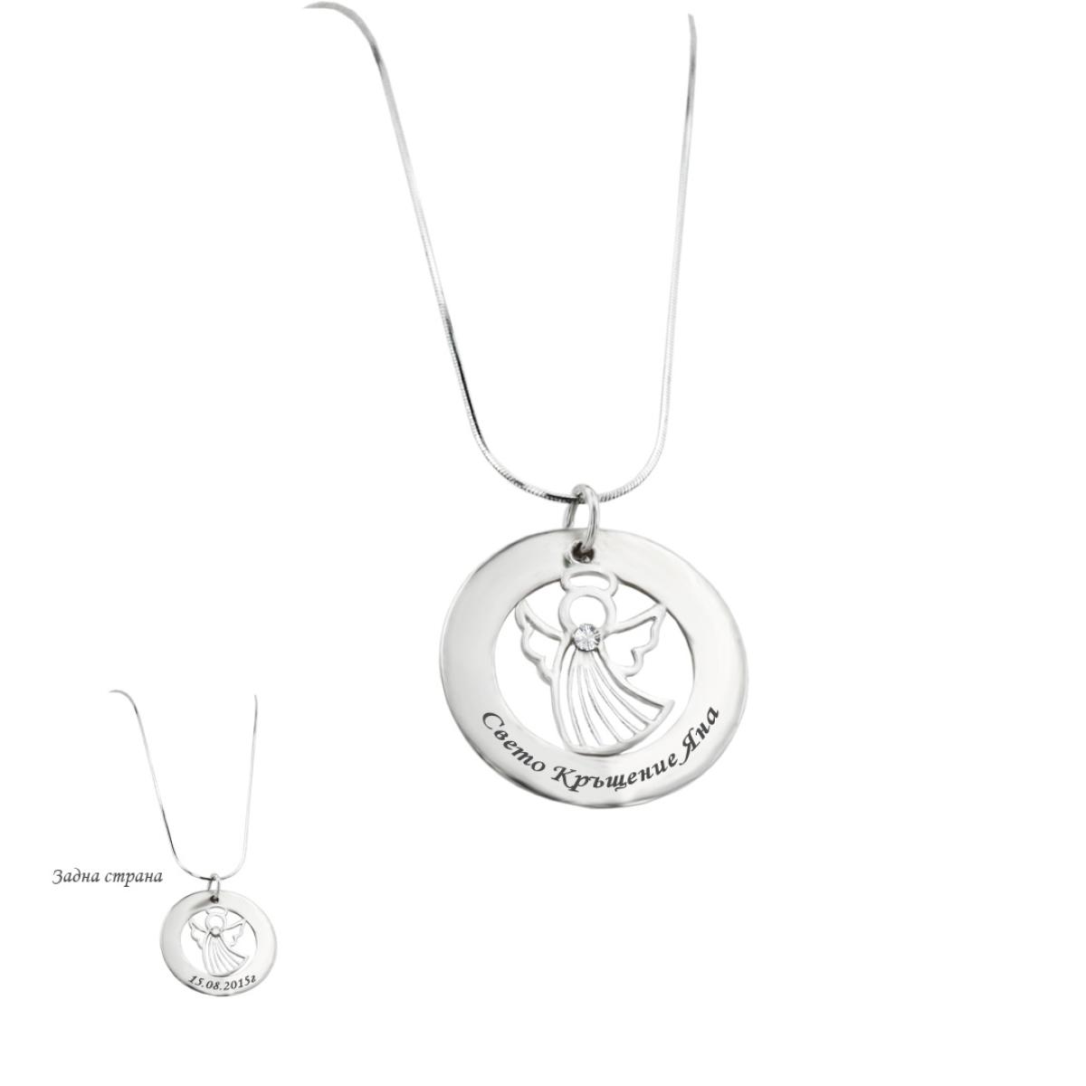 Сребърно колие Ангел с диск и гравирано послание