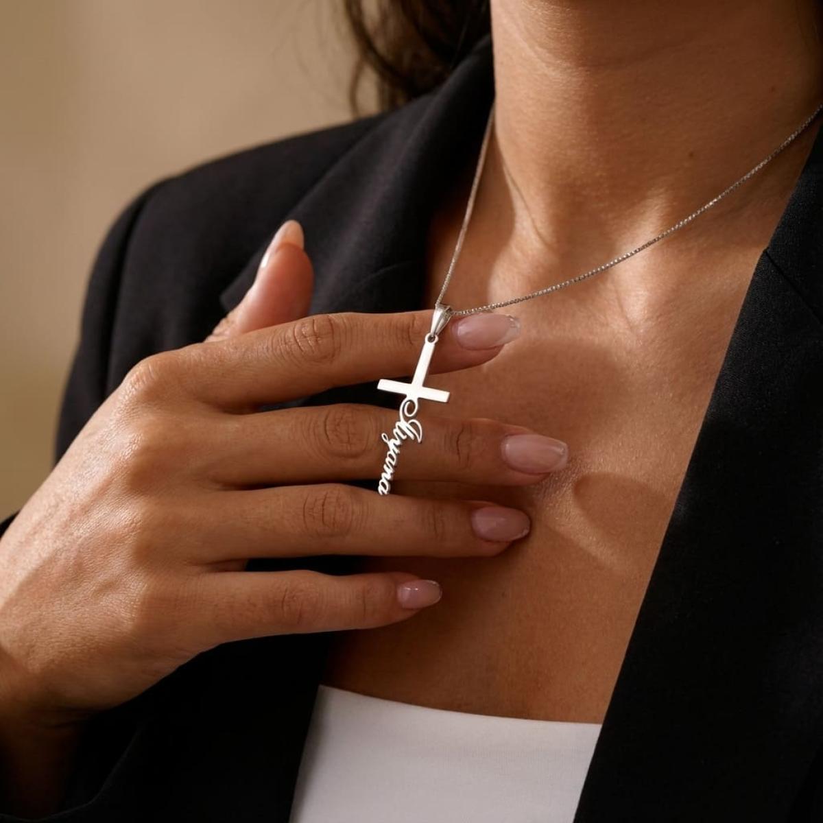 Елегантен и персонален аксесоар, изработен от сребро проба 925. Медальонът е във формата на класически кръст, върху който може да бъде изписано име по ваш избор. Символ на вяра и закрила.