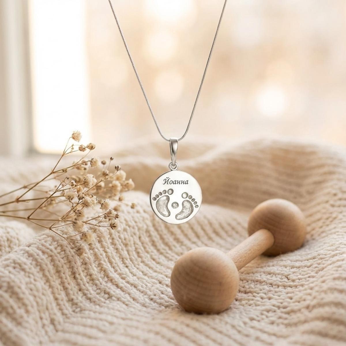 Точно над стъпките ще изпишем име по ваше желание, като това може да е името на майката (бъдещата притежателка на медальона) или на нейната скъпоценна рожба. И двата варианта са много удачни и ние имаме пълната готовност да реализираме всеки от тях. Добрата новина е, че гравирането е включено в цената на изделието и не се налага да доплащате за тази услуга.