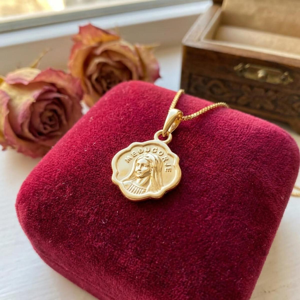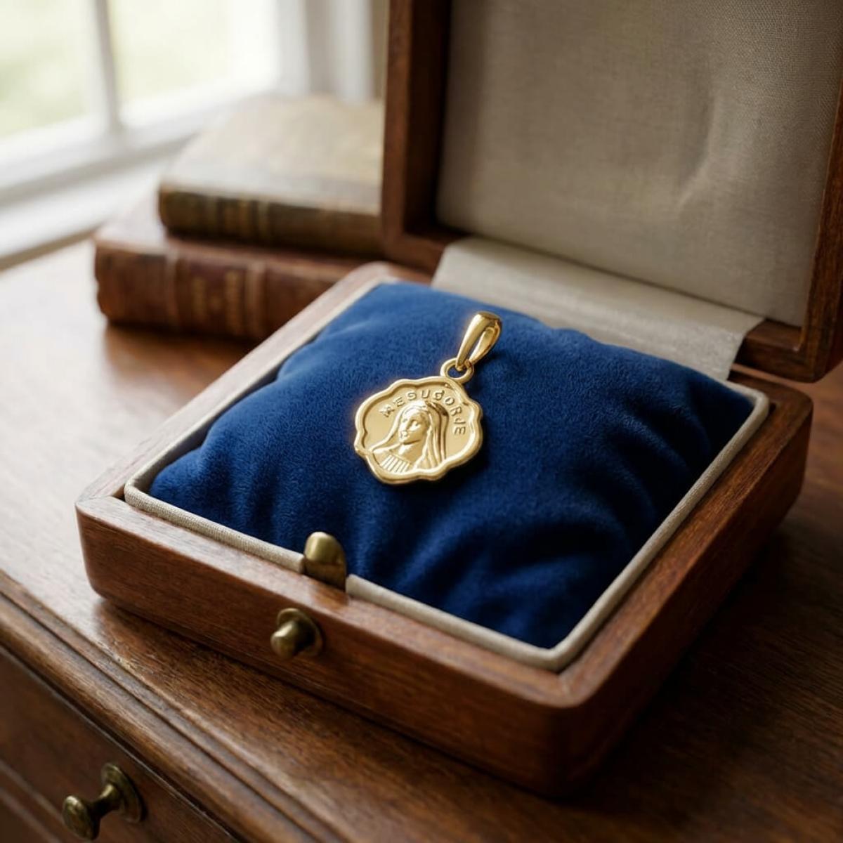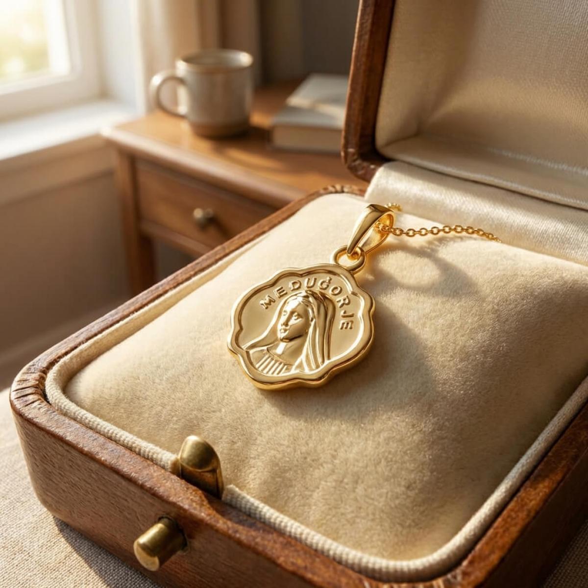 Нежен златен медальон, изобразяващ лика на Света Богородица