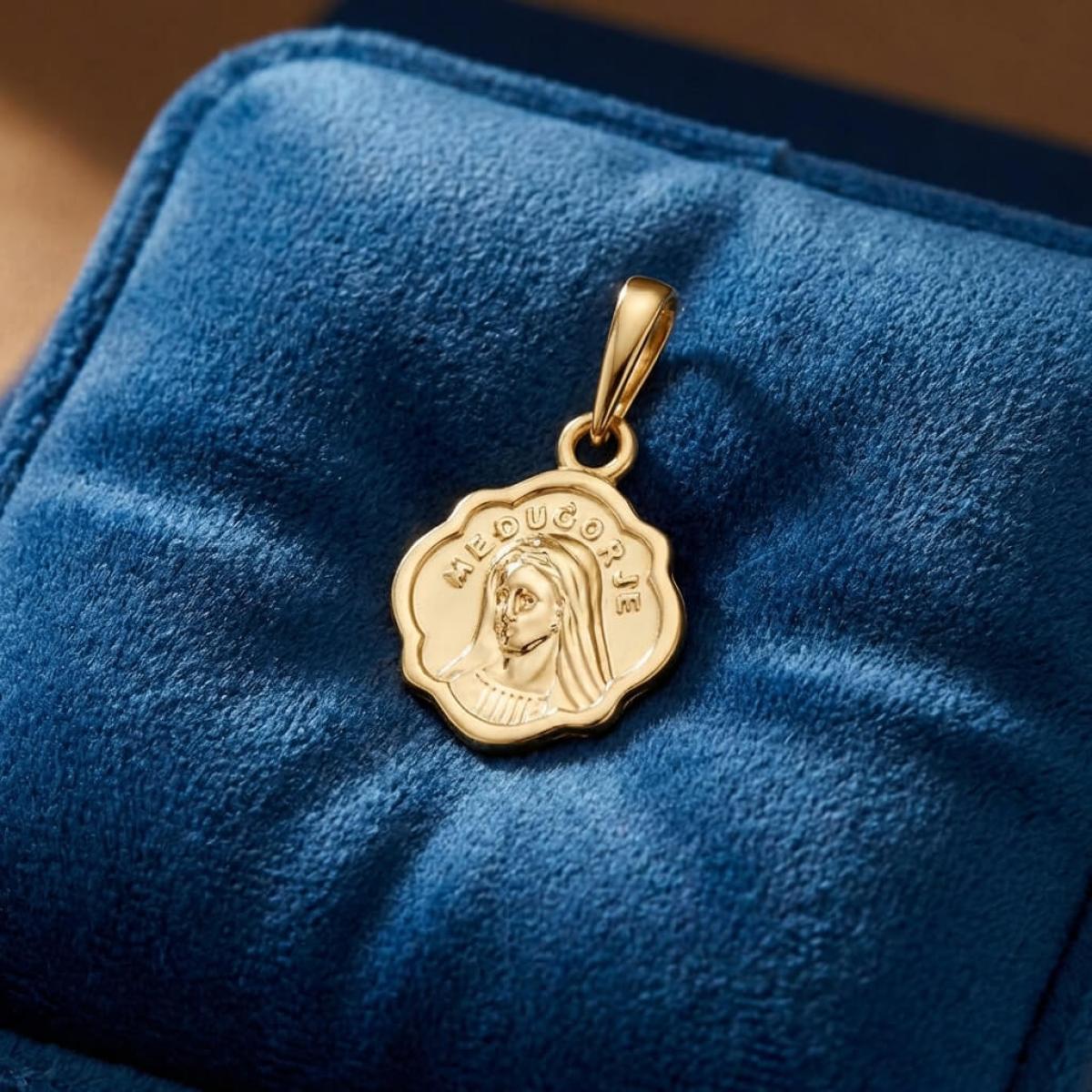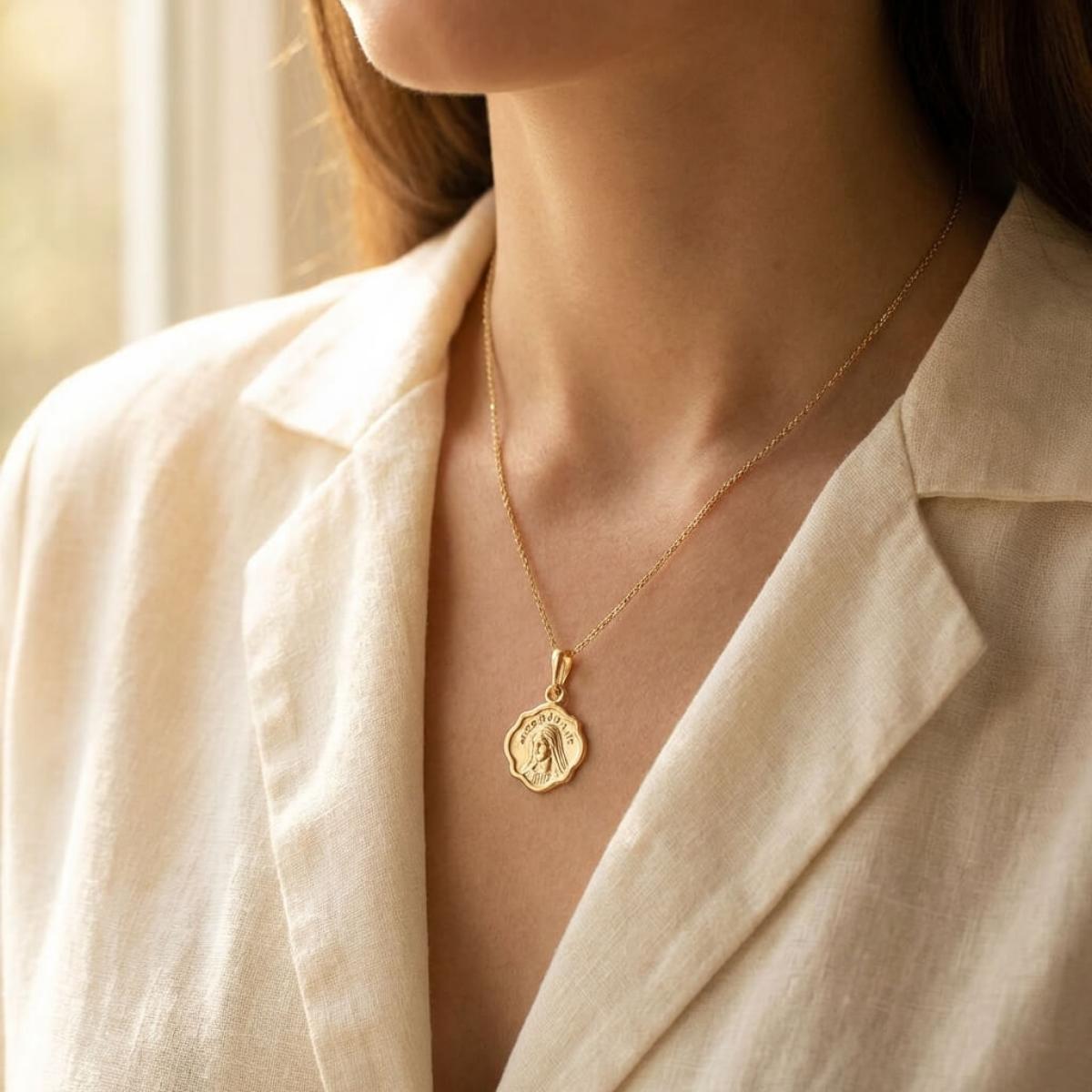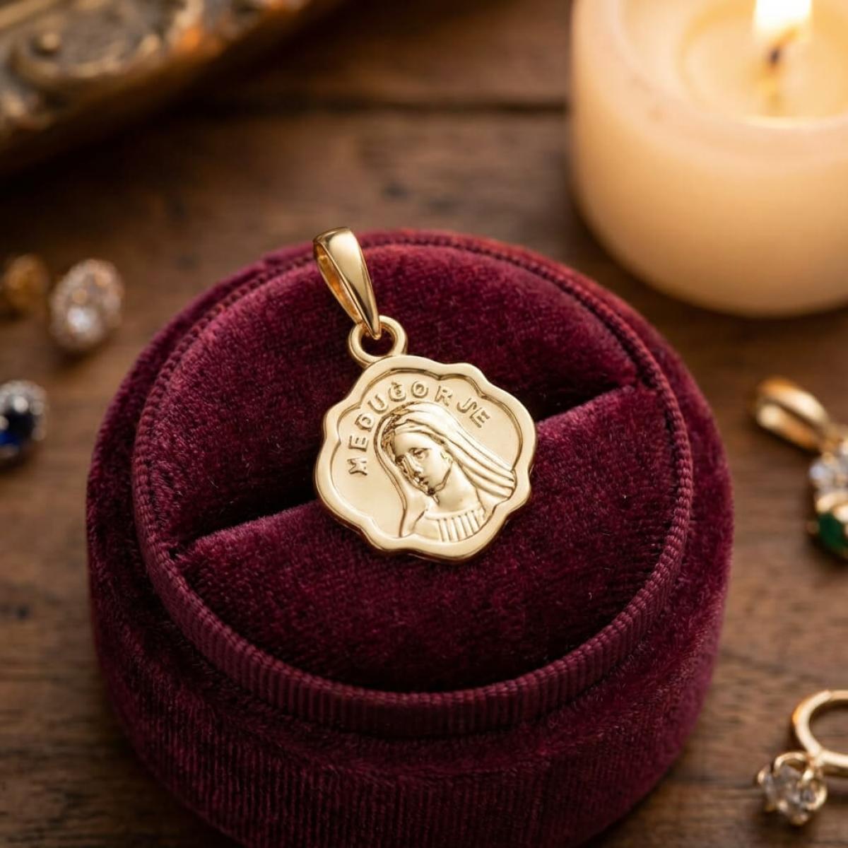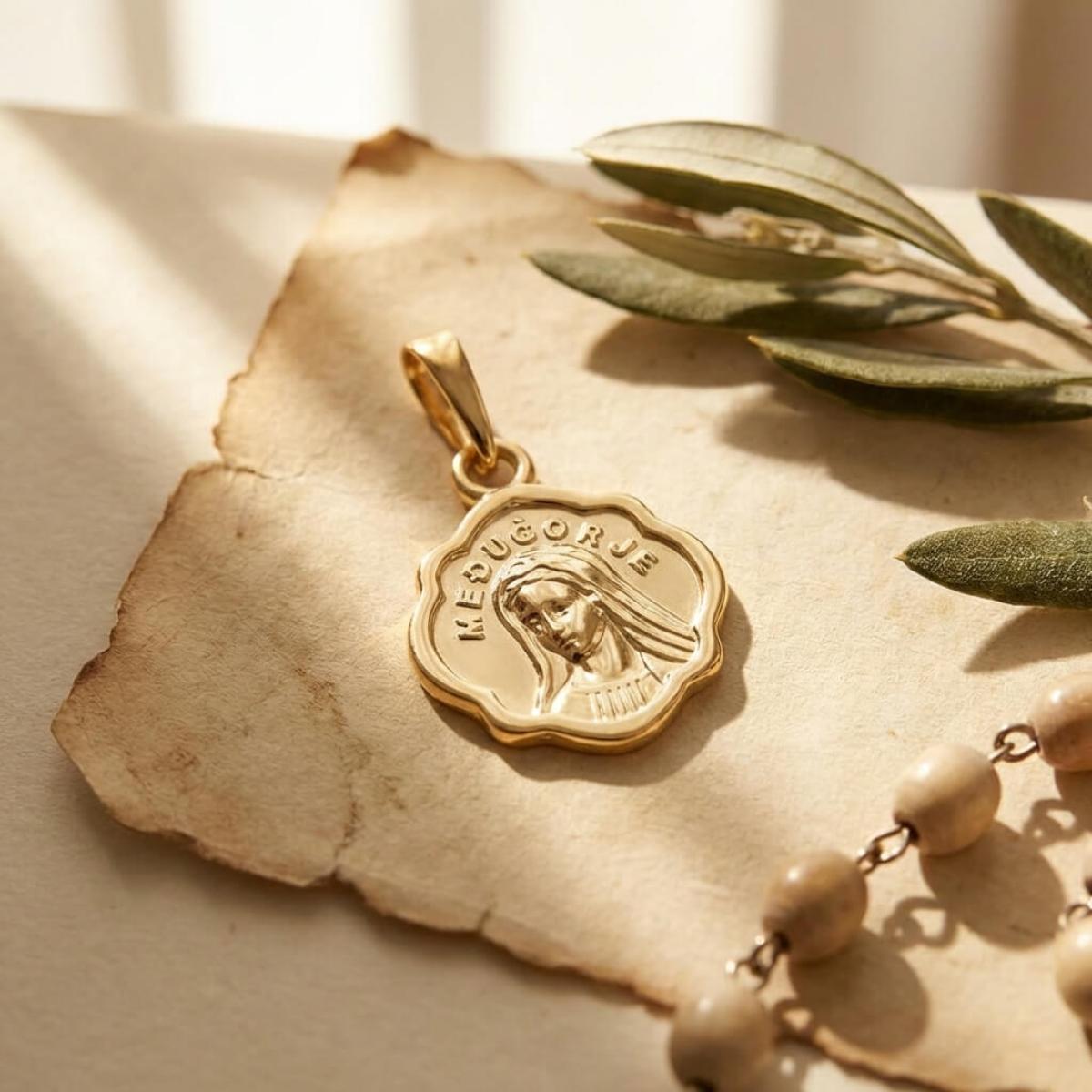 Нежен златен медальон, изобразяващ лика на Света Богородица