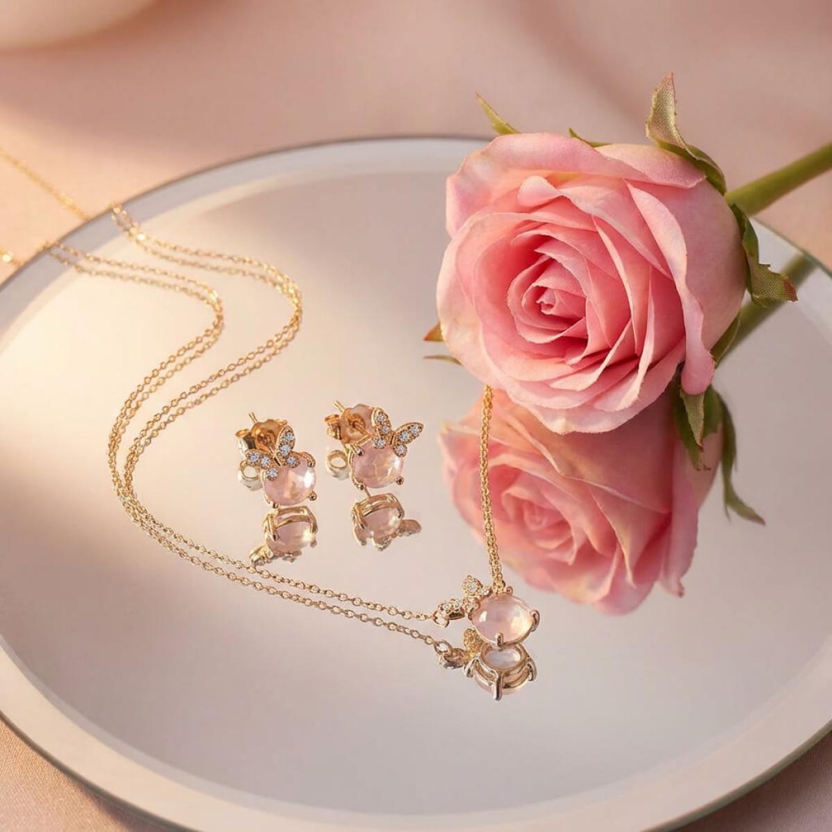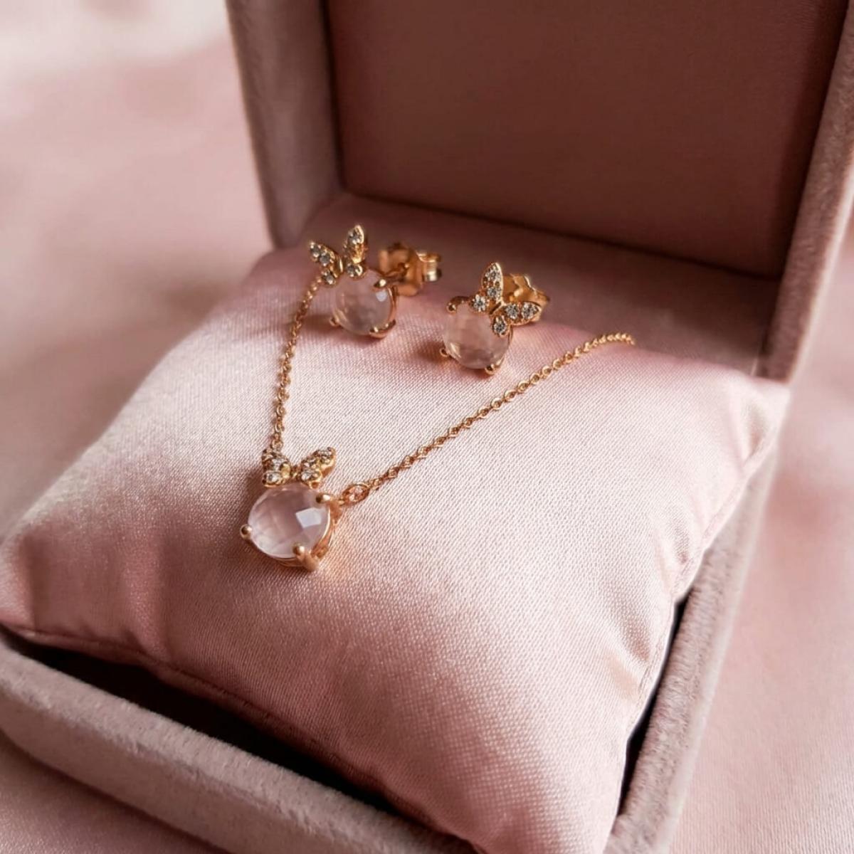 Златният комплект Пеперудена Магия е едно обаятелно ювелирно изделие, което ще стои прекрасно на всяка женска шия. Заслужава си да го поднесете като подарък на любимата жена, за да ѝ покажете, че тя е вашата кралица. Майсторите бижутери на бижутерия Паладиум са вложили цялата любов и старание в неговата изработка. Златният накит запазва не само финансовата си, но и своята емоционална стойност.