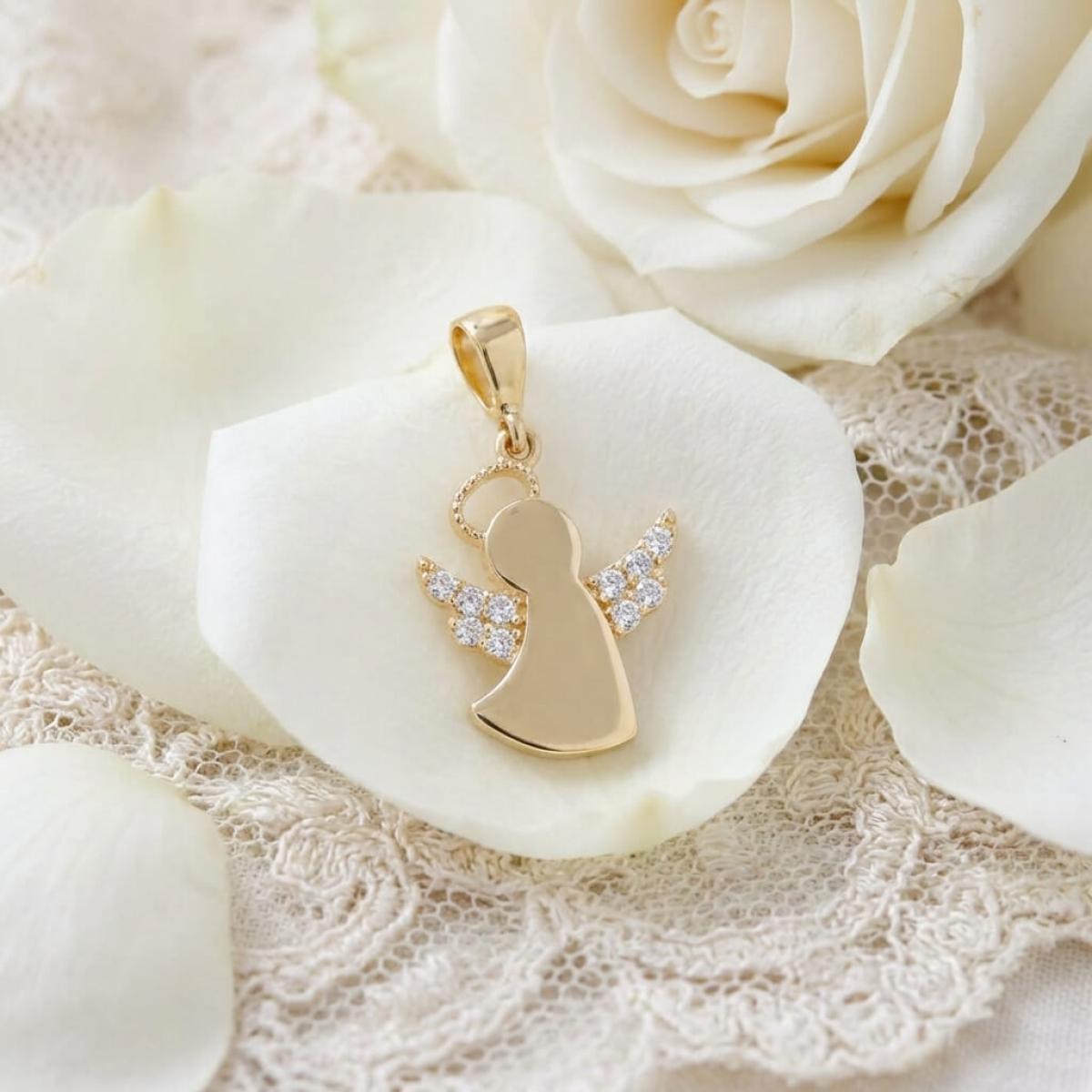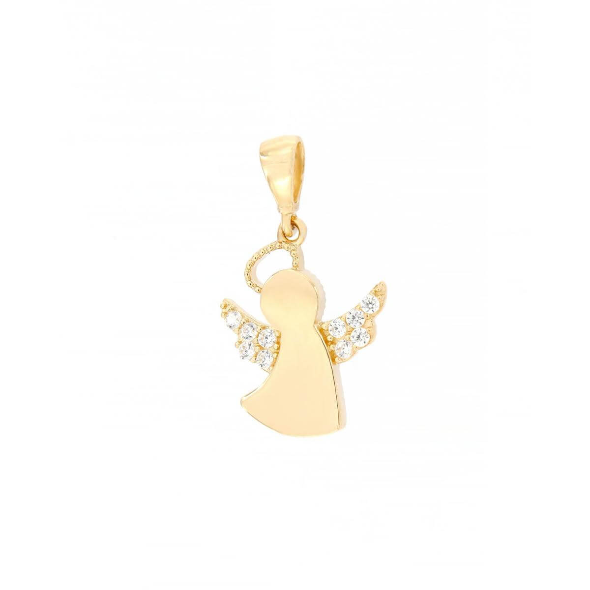 Прелестна златна висулка Ангелче е перфектният подарък за всяка жена по всякакъв повод. Детайлът е декориран с фини бели циркони, които му придават пищност и очарование. Може да се носи върху по-плътни или тънки златни верижки, както и да се комбинира с други бижута от този класически благороден метал.