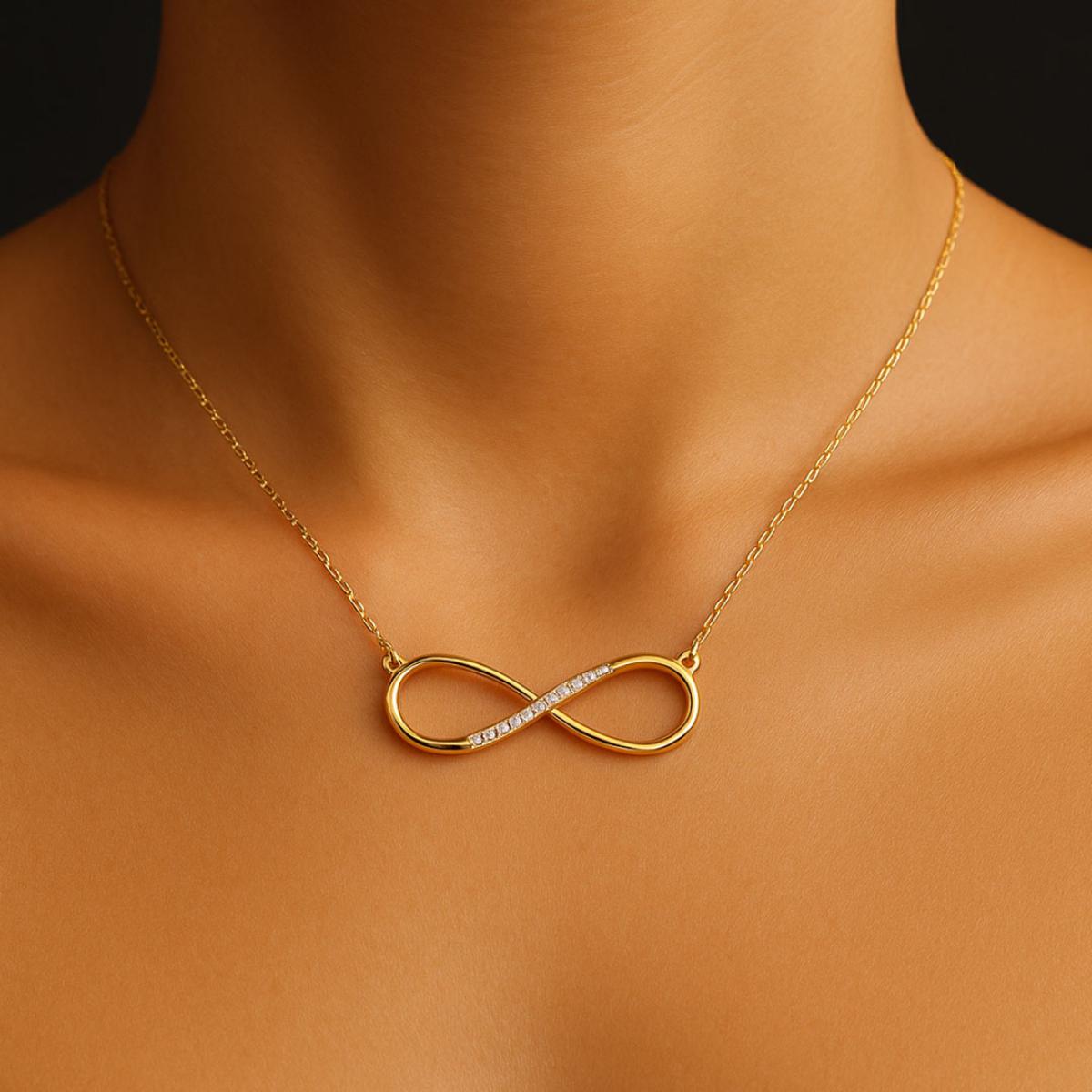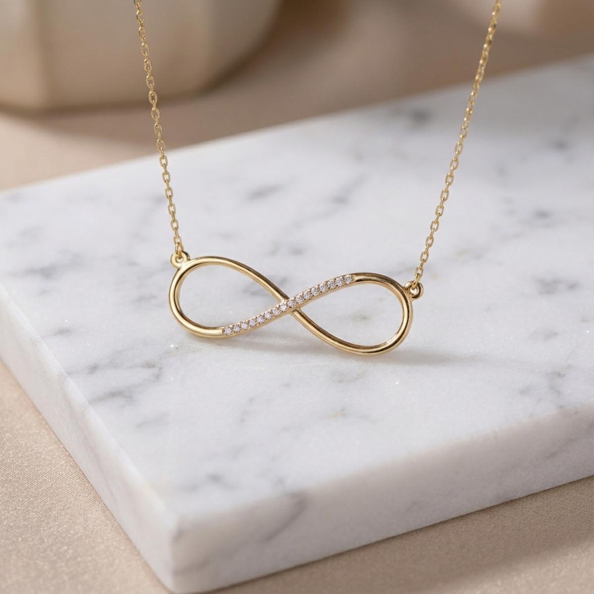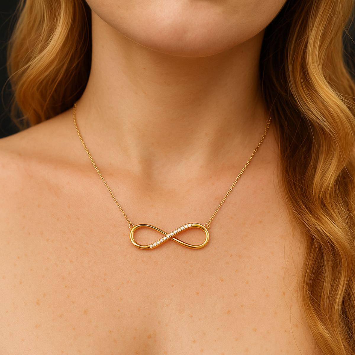Освен като легнала цифра 8, фигурата може да се оприличи също на кокетна панделка. Тази форма символизира женското начало и автентичната женственост. Затова е и толкова силно застъпена именно в дамските бижута. От друга страна, в дизайна на златното дамско колие с безкрайност сме вмъкнали и символиката, изпълваща тази красива фигура.