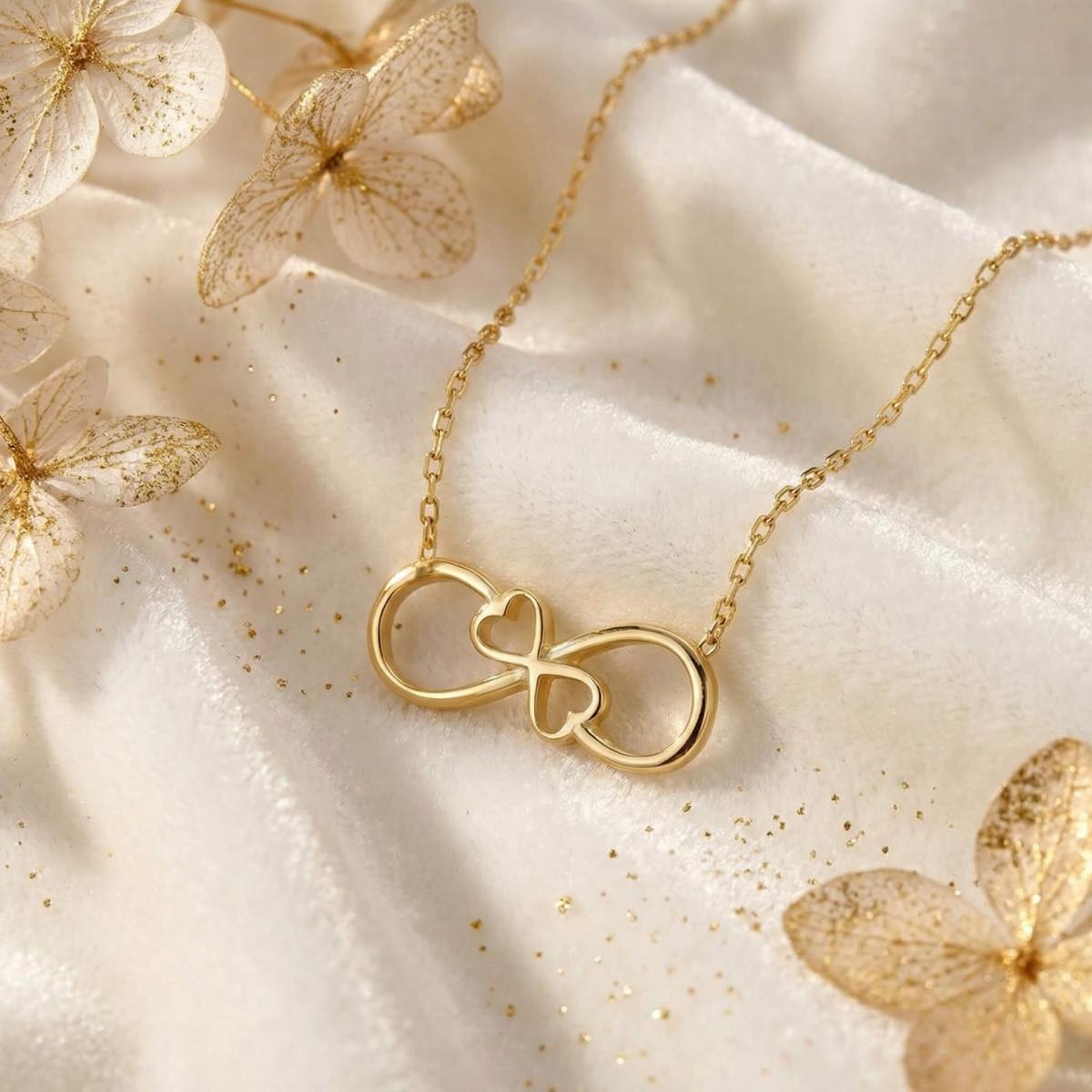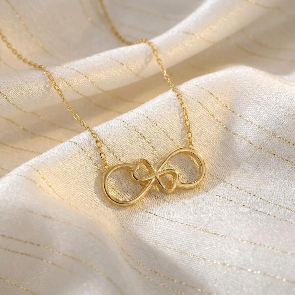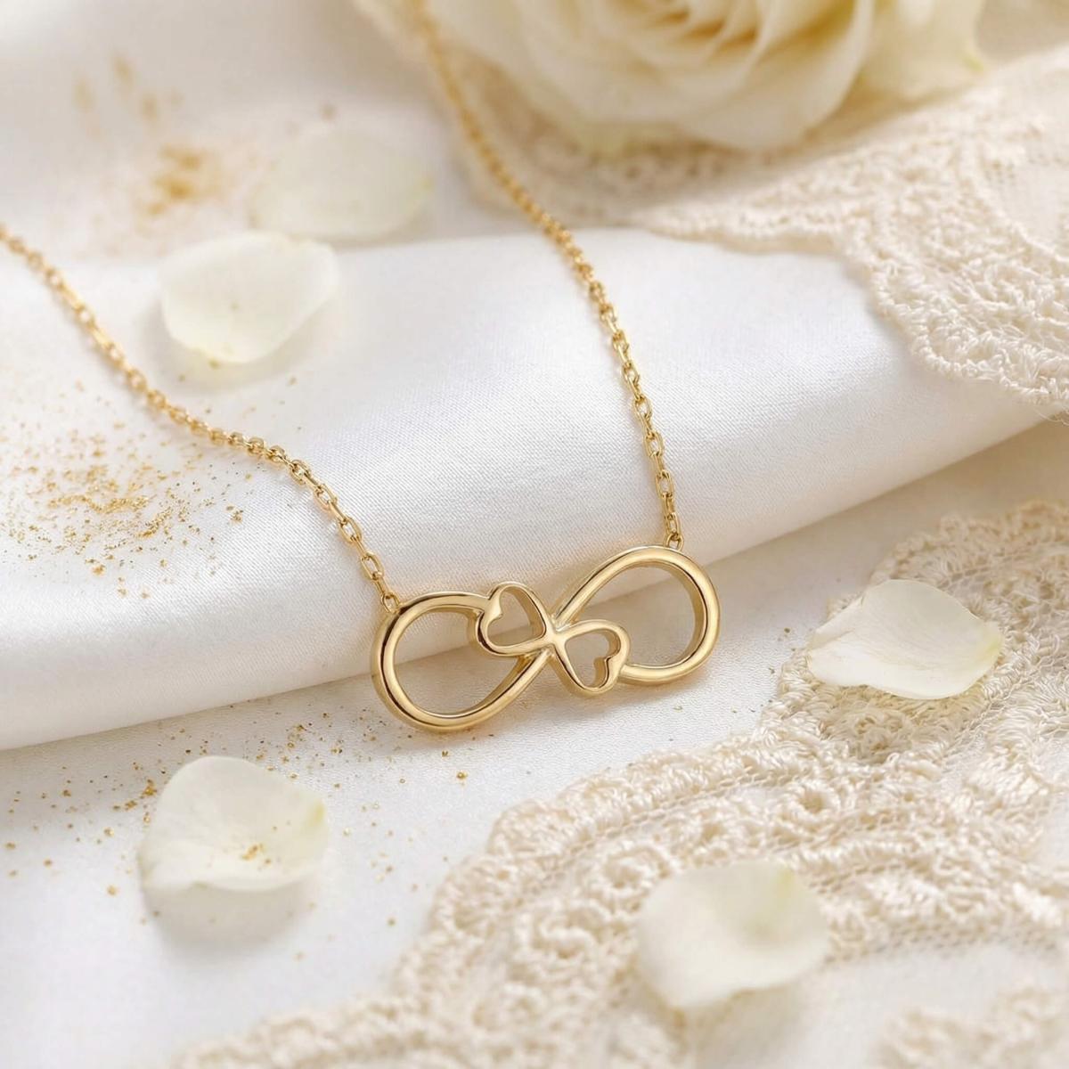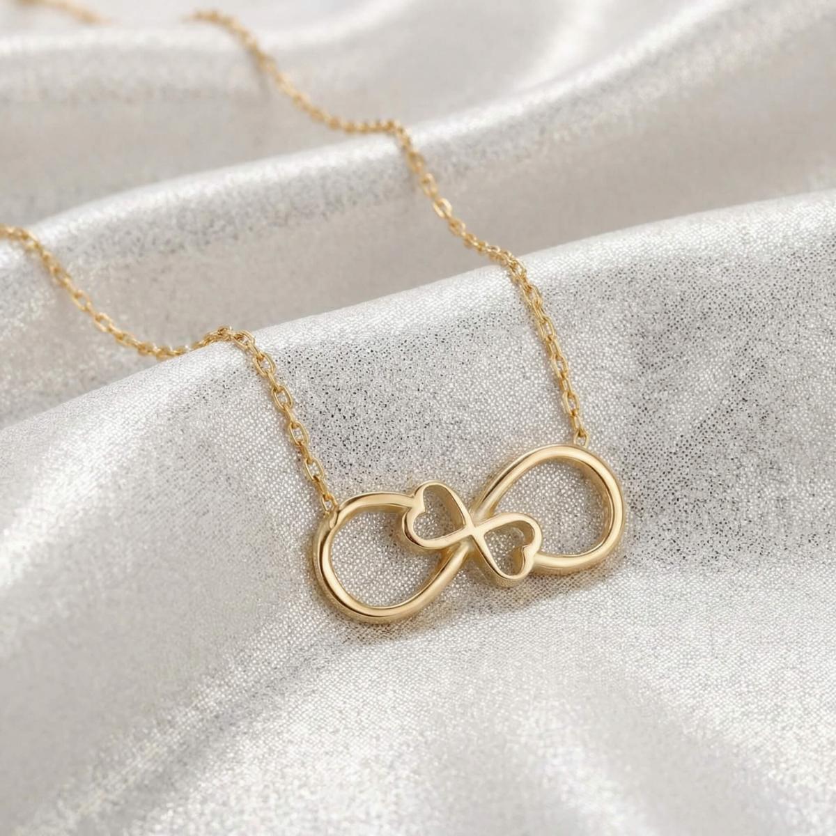 Златното колие безкрайност е едно обаятелно ювелирно изделие, което ще стои прекрасно на всяка женска шия. Заслужава си да го поднесете като подарък на любимата жена, за да ѝ покажете вашата любов. Майсторите бижутери на бижутерия Паладиум са вложили цялата любов и старание в неговата изработка. Златният накит запазва не само финансовата си, но и своята емоционална стойност.