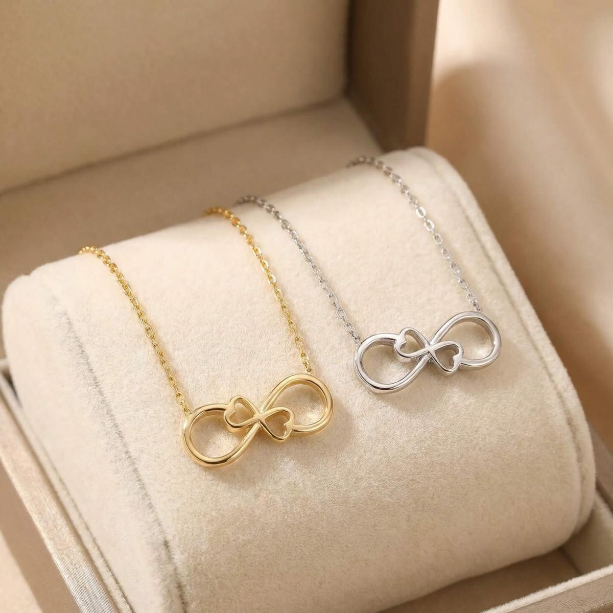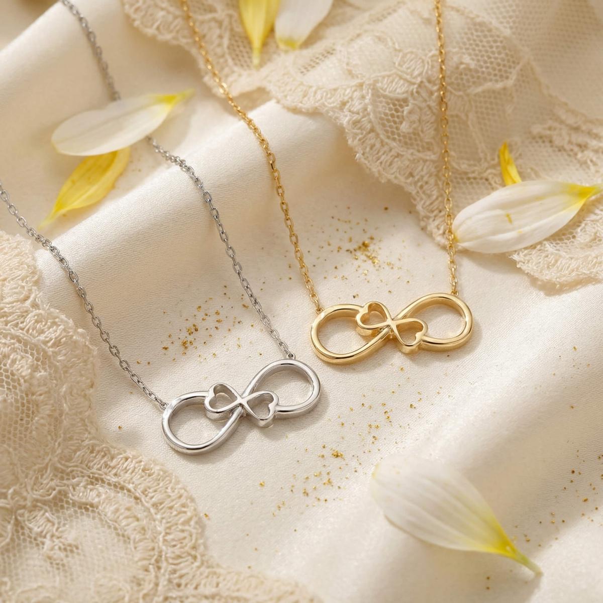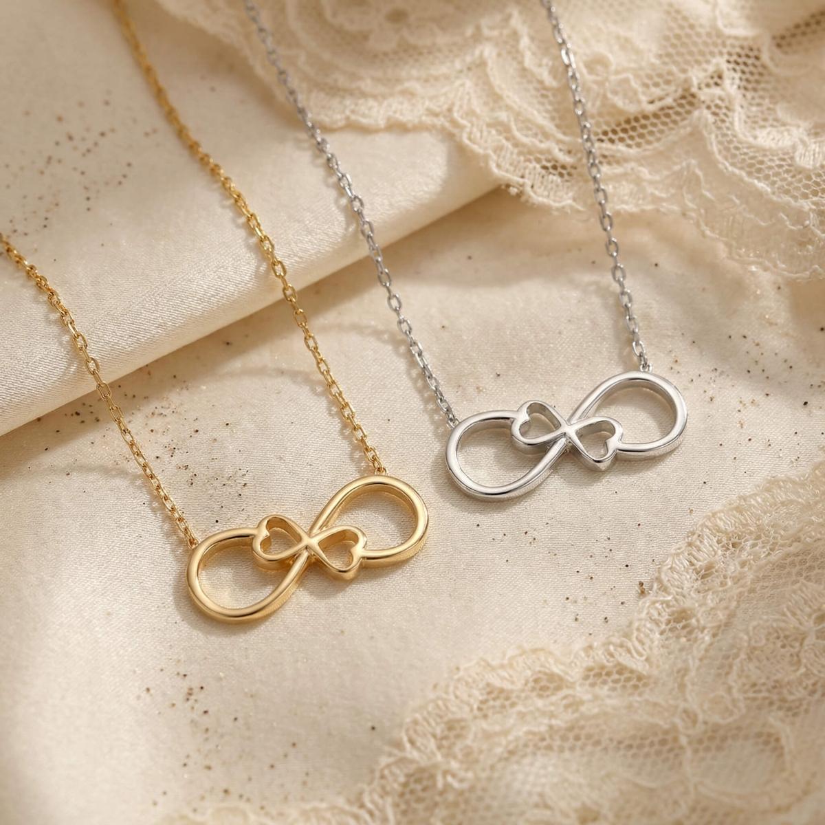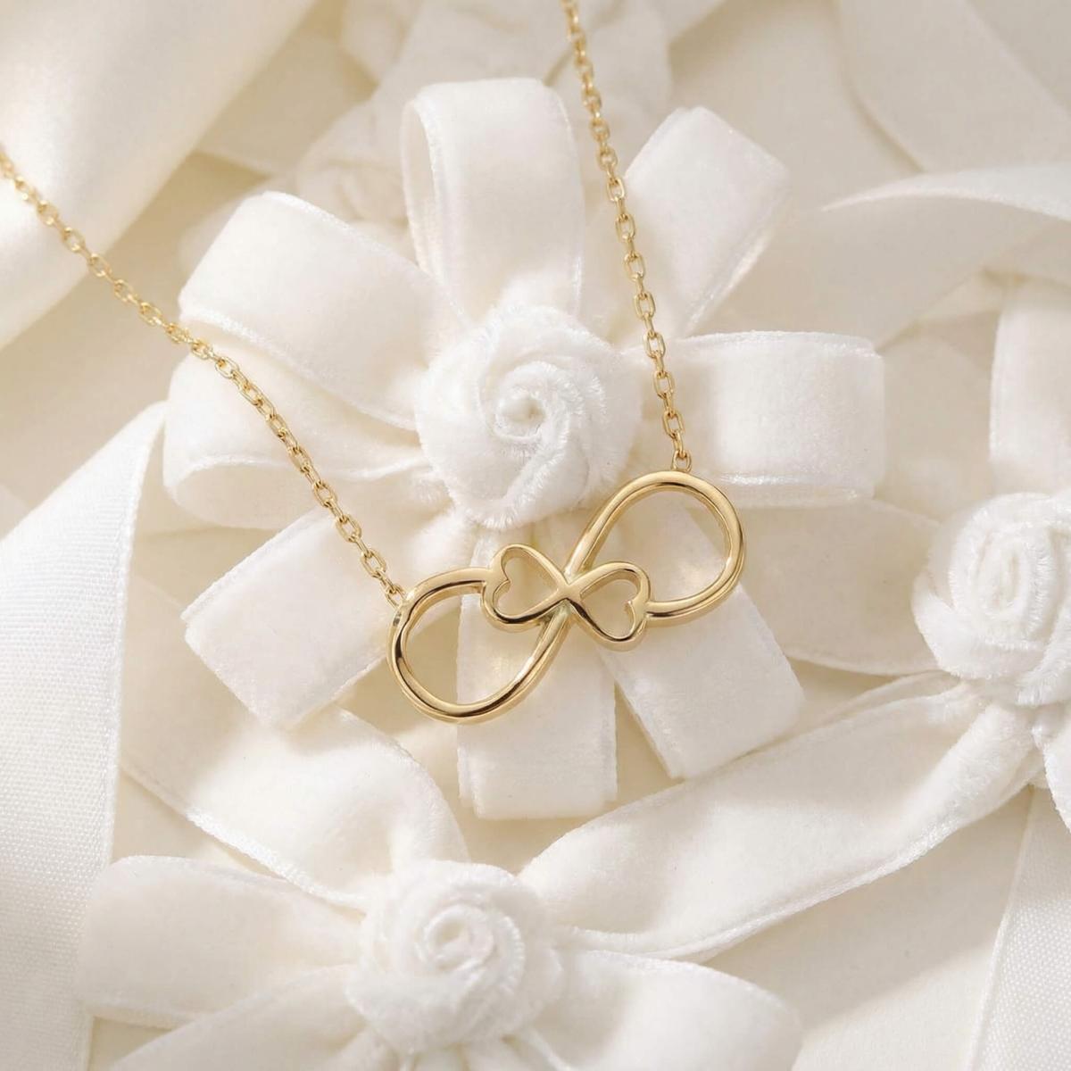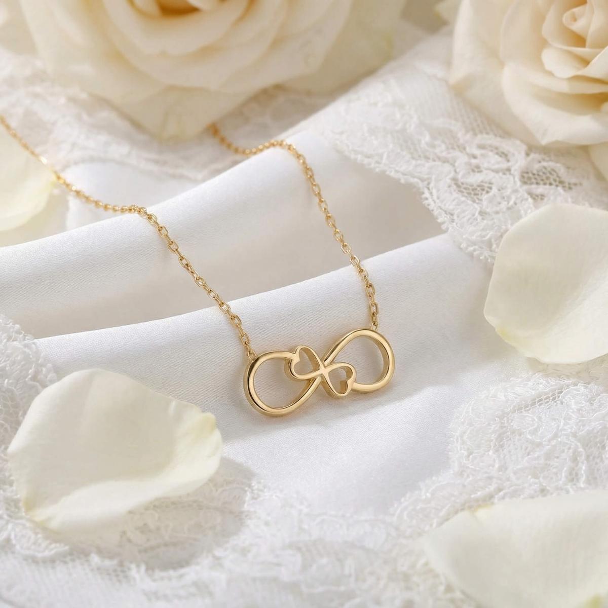Златното колие безкрайност е едно обаятелно ювелирно изделие, което ще стои прекрасно на всяка женска шия. Заслужава си да го поднесете като подарък на любимата жена, за да ѝ покажете вашата любов. Майсторите бижутери на бижутерия Паладиум са вложили цялата любов и старание в неговата изработка. Златният накит запазва не само финансовата си, но и своята емоционална стойност.