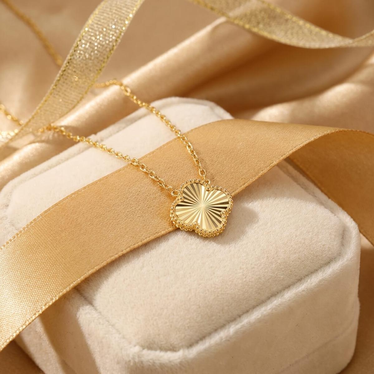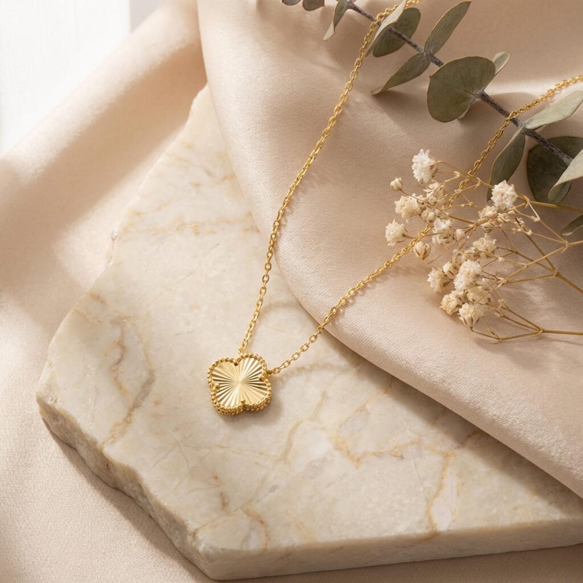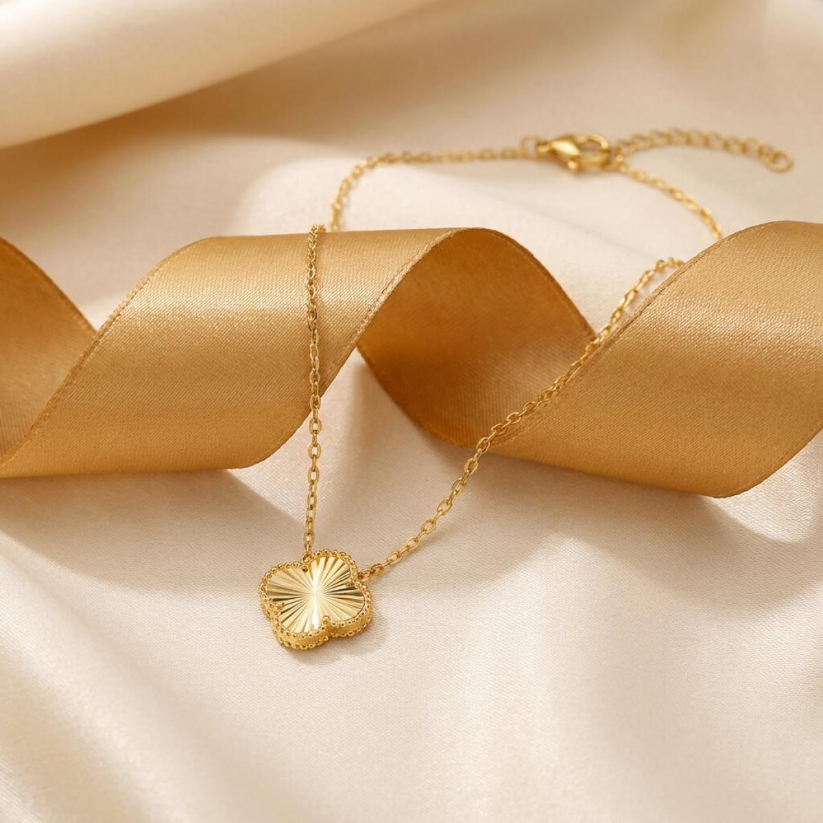 Това изискано златно колие е създадено, за да подчертае вашата елегантност и стил. Детелината, символ на късмет, щастие и благополучие, е инкрустирана с блестящи линий, които ѝ придават диамантен блясък.
