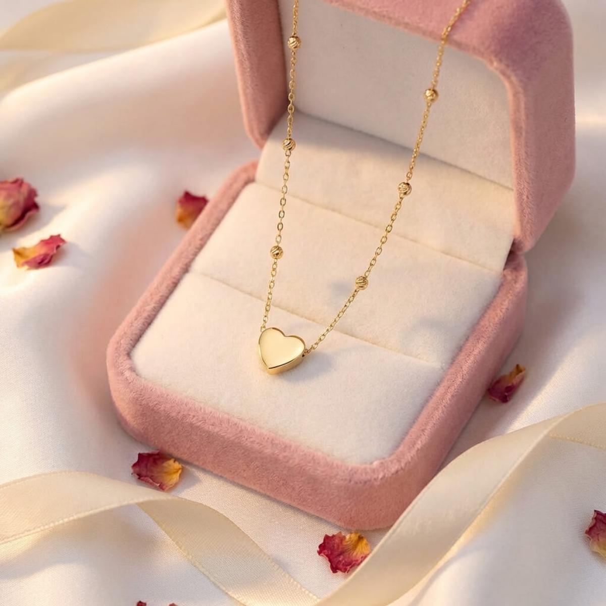 Изработено от жълто злато проба 585, това елегантно колие се отличава с изящно сърце, което олицетворява силата на любовта и топлината на човешките чувства. Фино допълнено със златни топчета, то придава нежност и блясък, правейки го перфектен аксесоар за всяка визия.