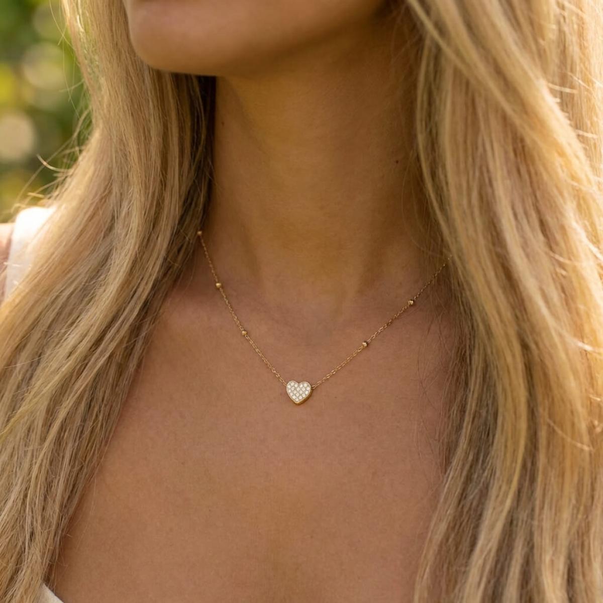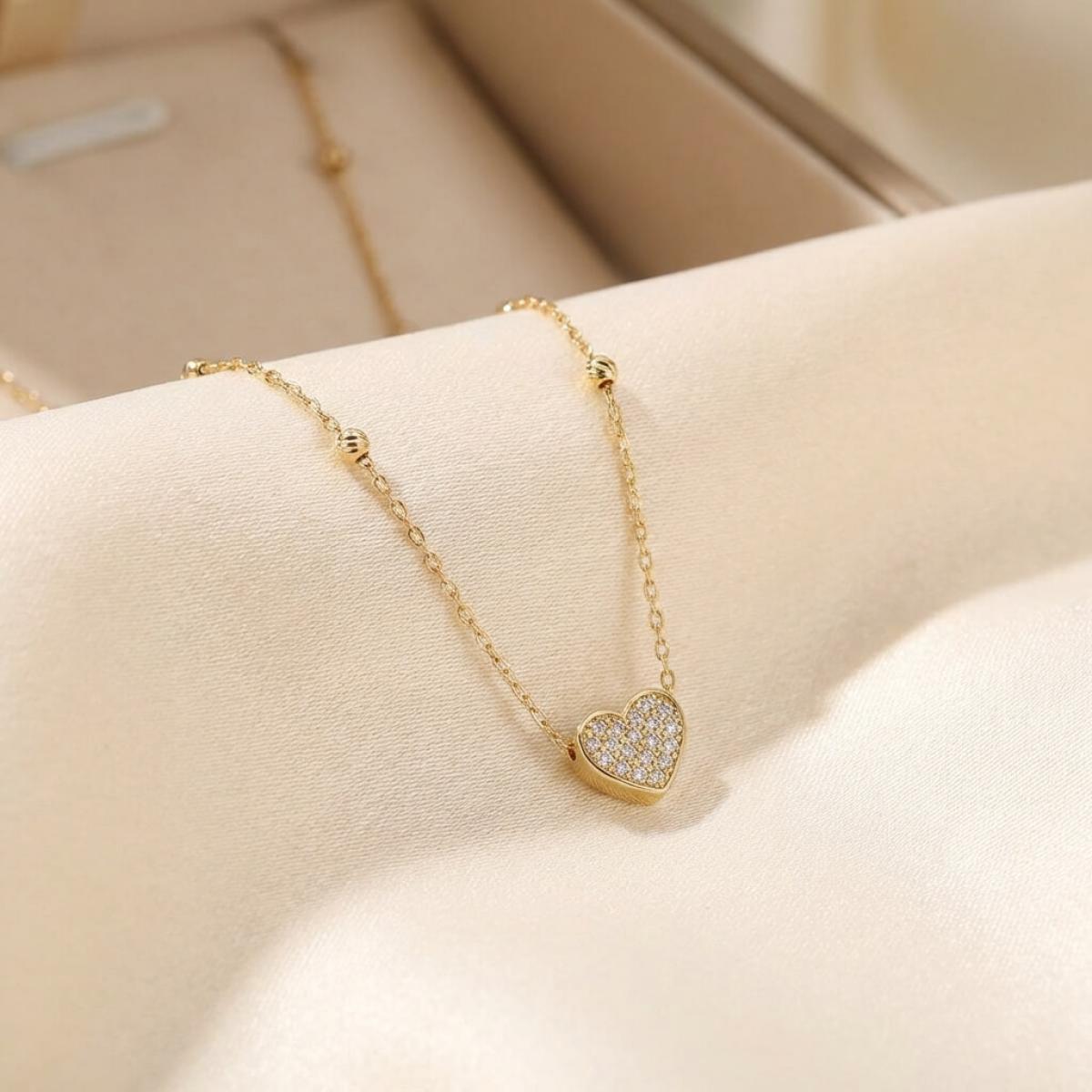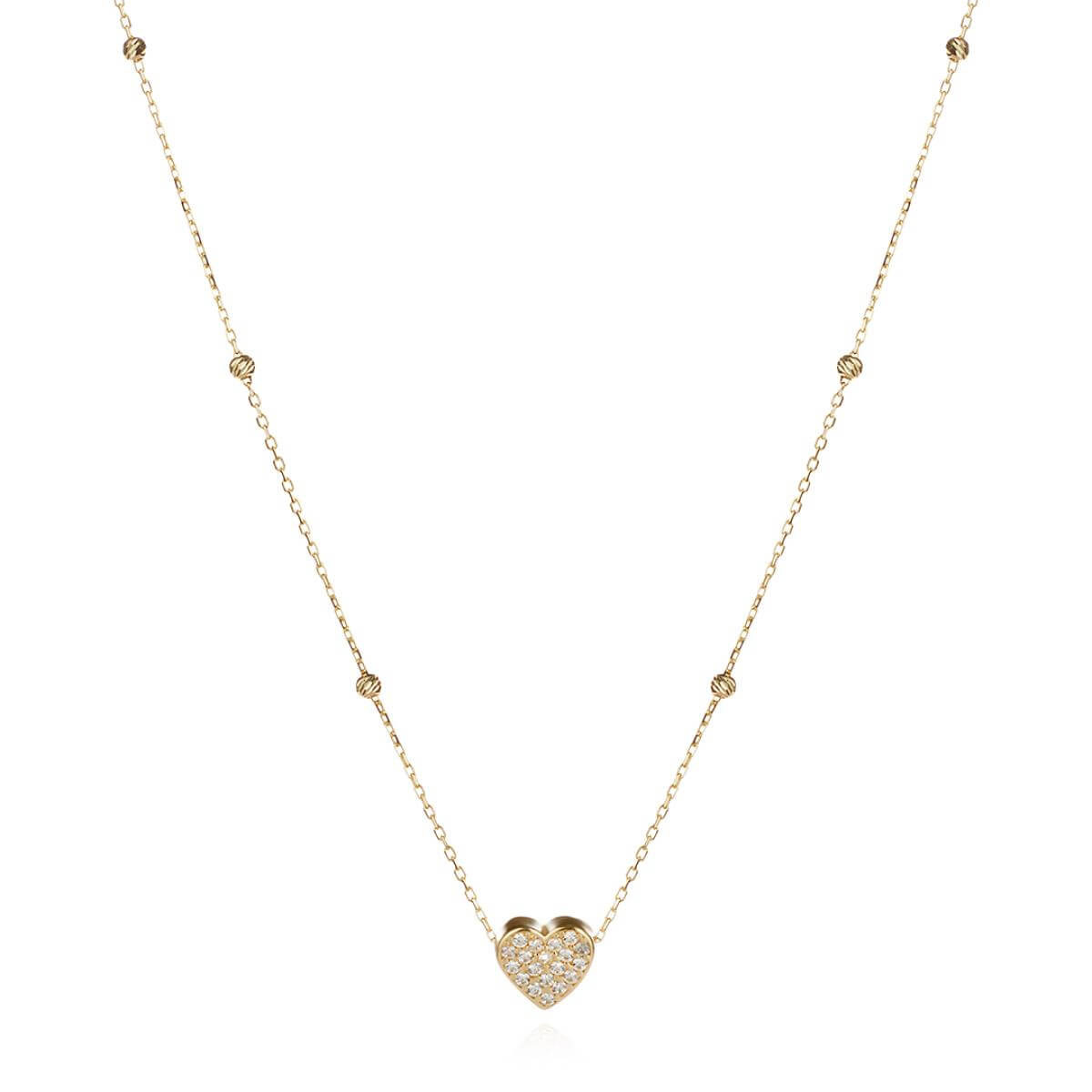 Изработено от жълто злато проба 585, това елегантно колие се отличава с изящно сърце, което олицетворява силата на любовта и топлината на човешките чувства. Фино допълнено със златни топчета и малки и бели циркони, то придава нежност и блясък, правейки го перфектен аксесоар за всяка визия.
