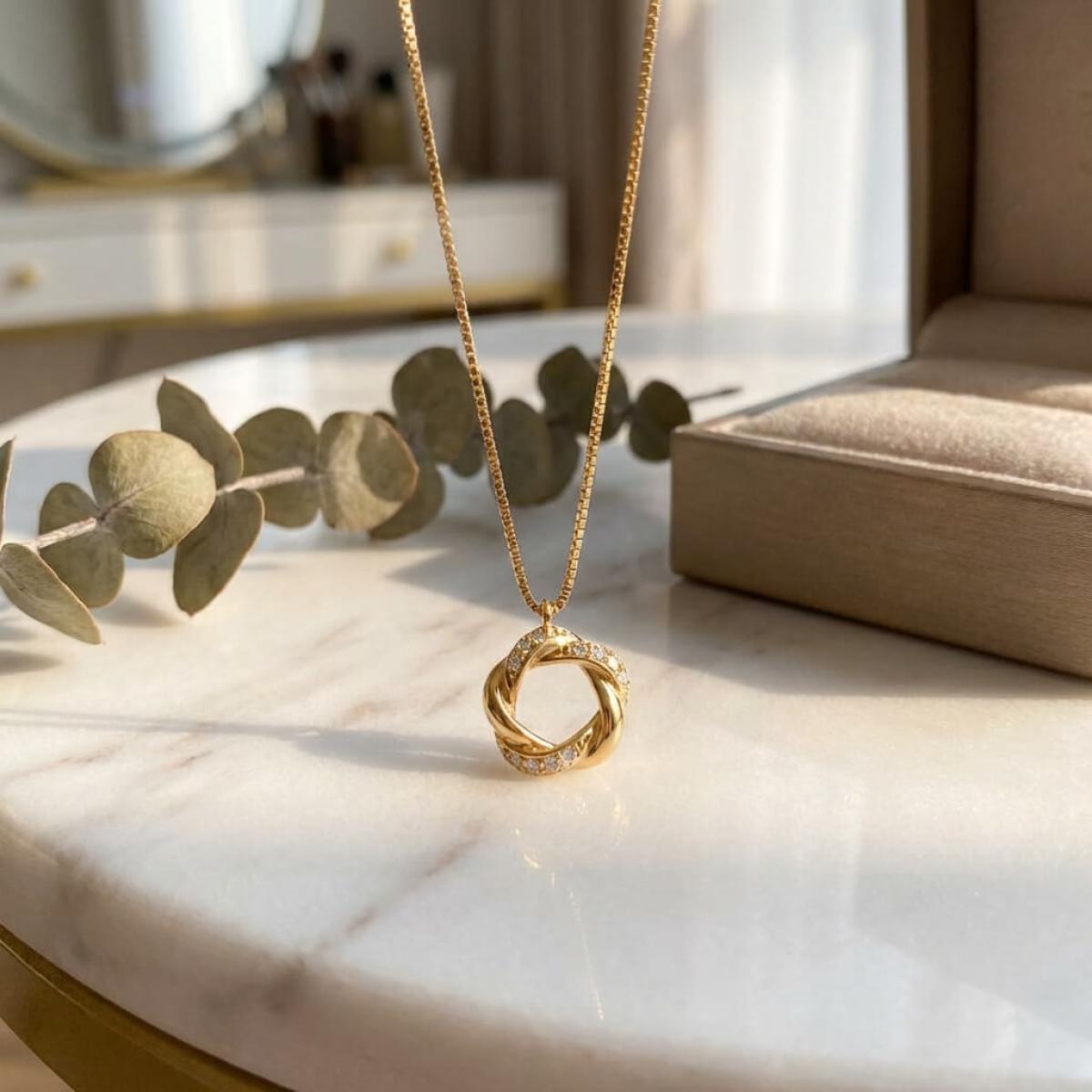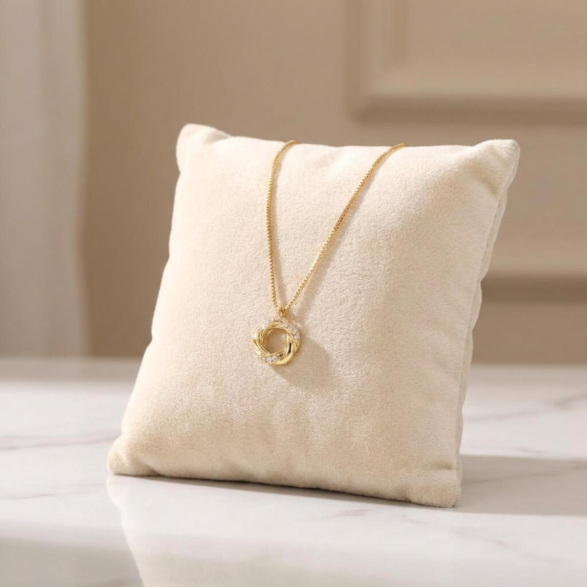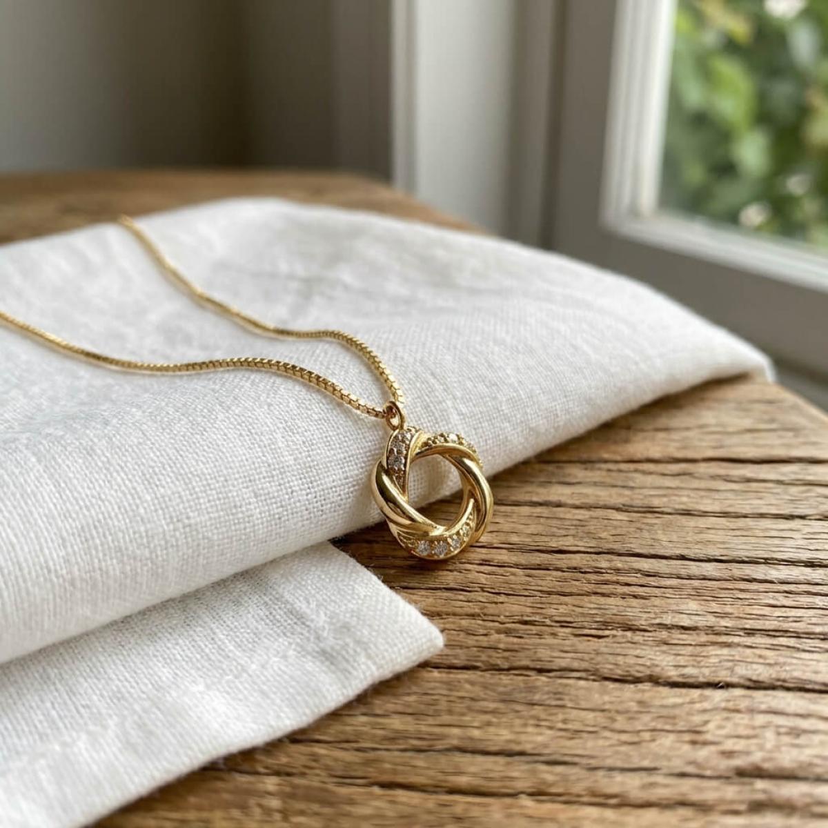 Това златно колие с множество циркони е ръчно изработено с много старание.