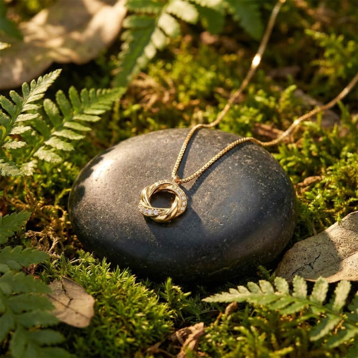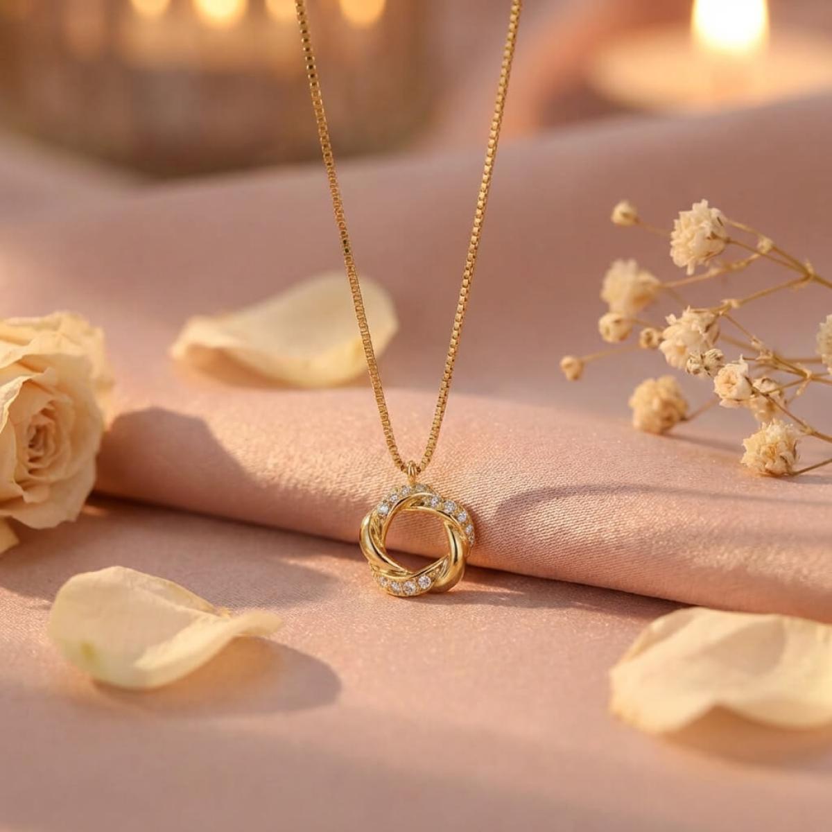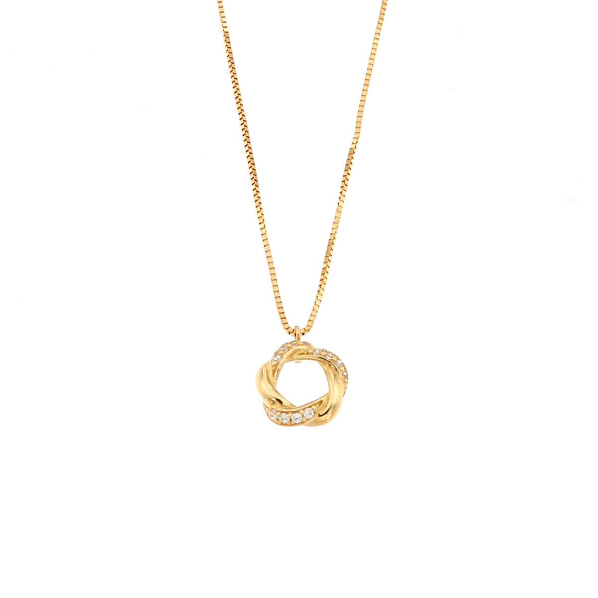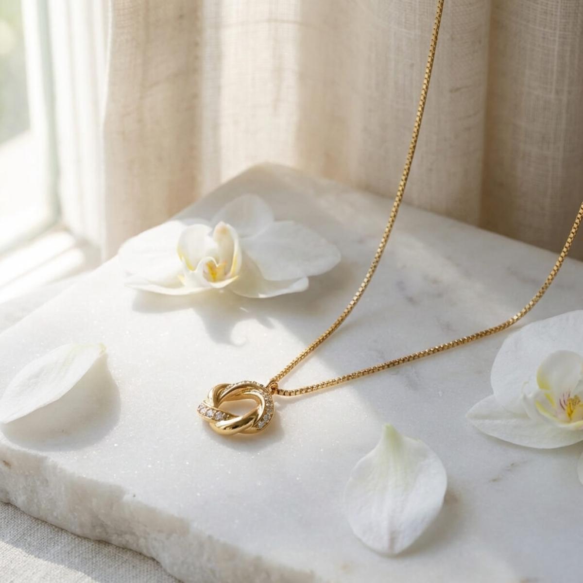 Това златно колие с множество циркони е ръчно изработено с много старание.