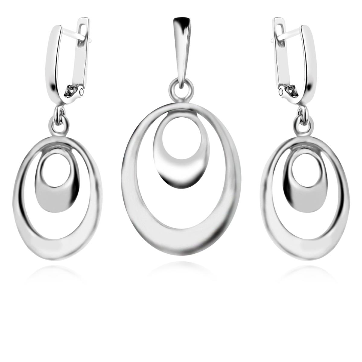 Нашият сребърен комплект включва обеци и медальон с нежна и женствена овална форма. Дизайнът залага на овална рамка, във вътрешността на която е вграден друг, по-малък овал. Тази многопластовост на дизайна притежава очарователно излъчване. Накитите се забелязват и привличат погледа, без да са твърде масивни и екстравагантни.