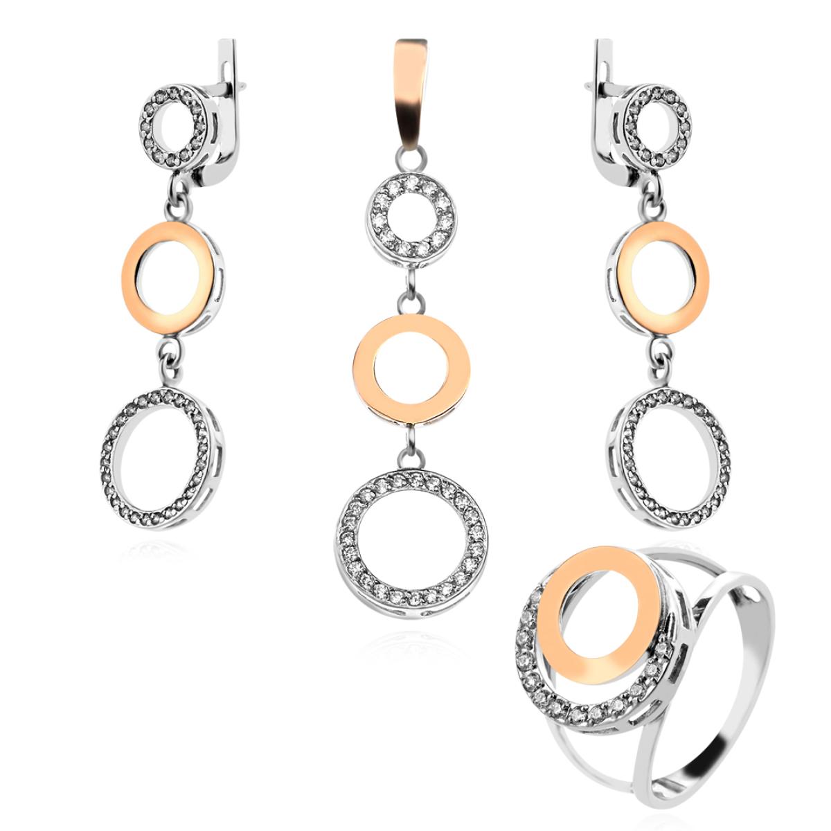 Комплектът включва обеци, медальон и пръстен, изработени от висококачествено сребро проба 925 и инкрустирани с искрящи бели циркони, които улавят светлината при всяко движение. Фините елементи със златен обков 9K добавят топлина и луксозен завършек, превръщайки всяко бижу в истински акцент.