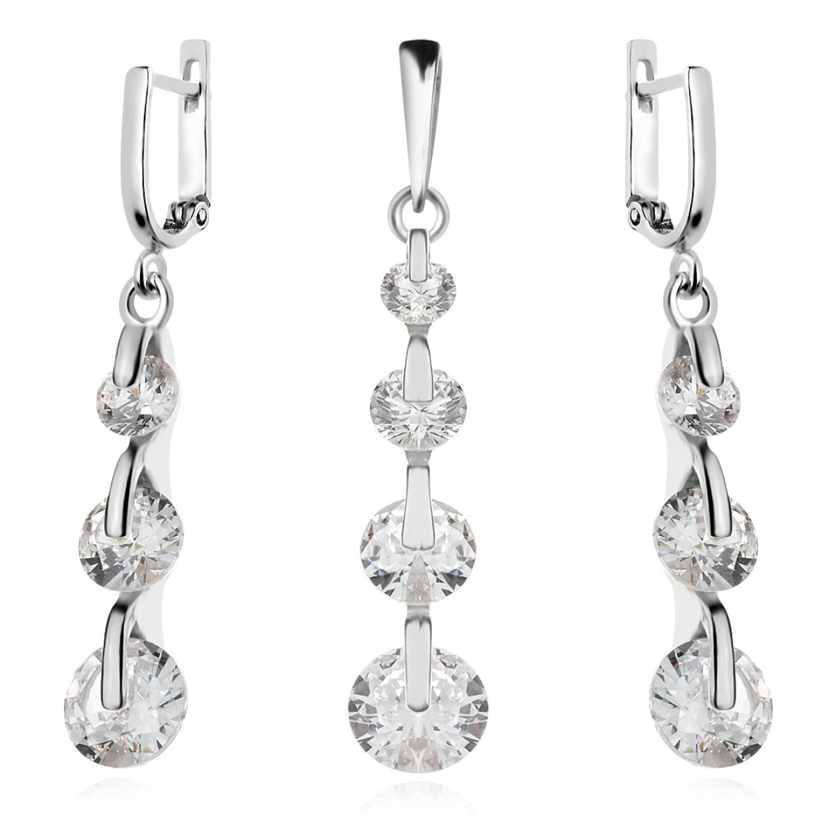 Блестящ и елегантен, този сребърен комплект, включващ обеци и медальон, добавя женствен блясък, който подчертава естествената Ви красота. Белите циркони отразяват светлината по магически начин, привличащ вниманието и възхищението на околните. Изтънчени, стилни и елегантни във всяко едно отношение!