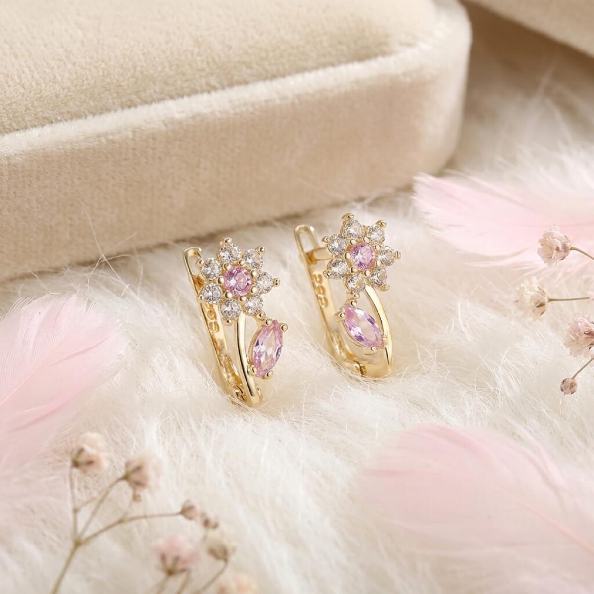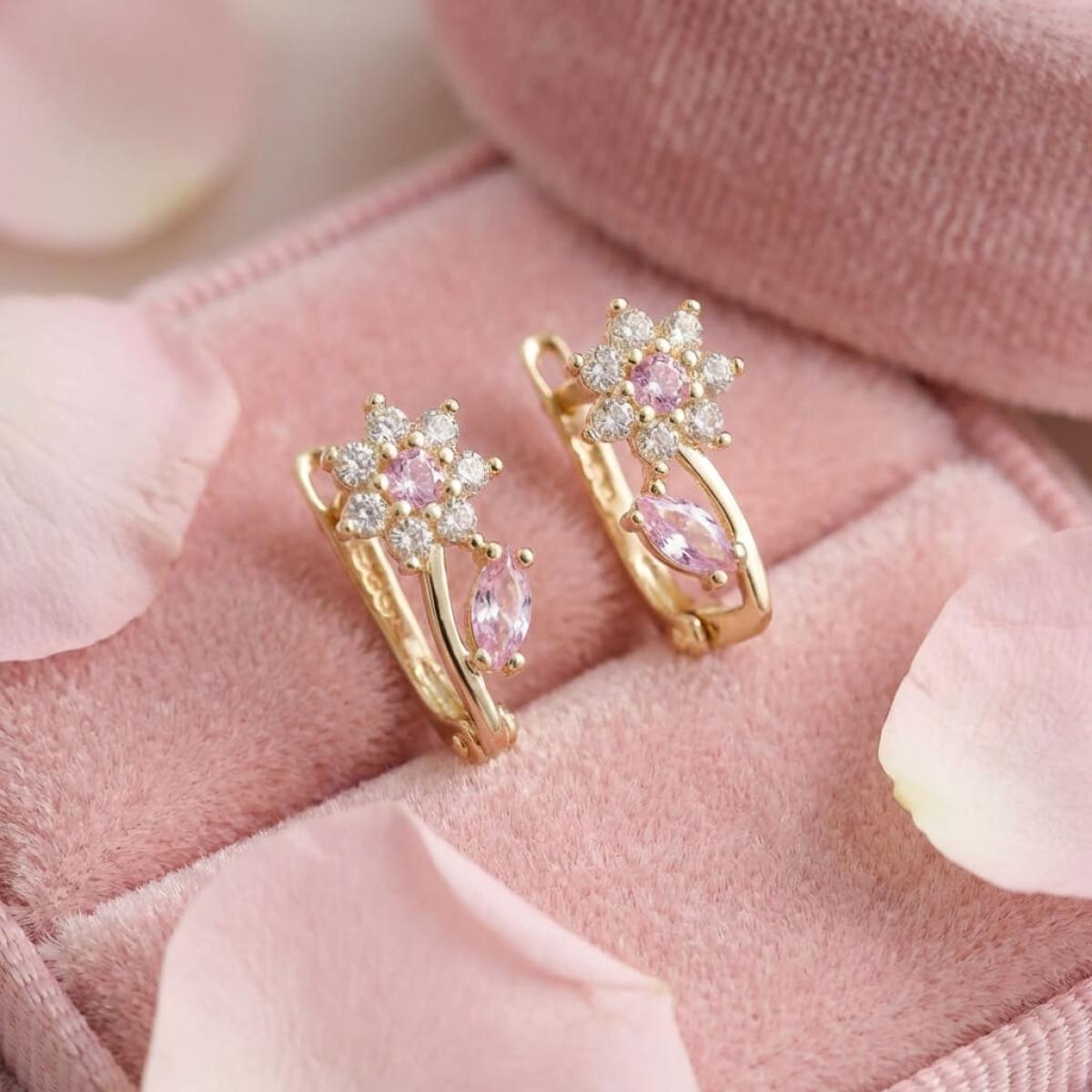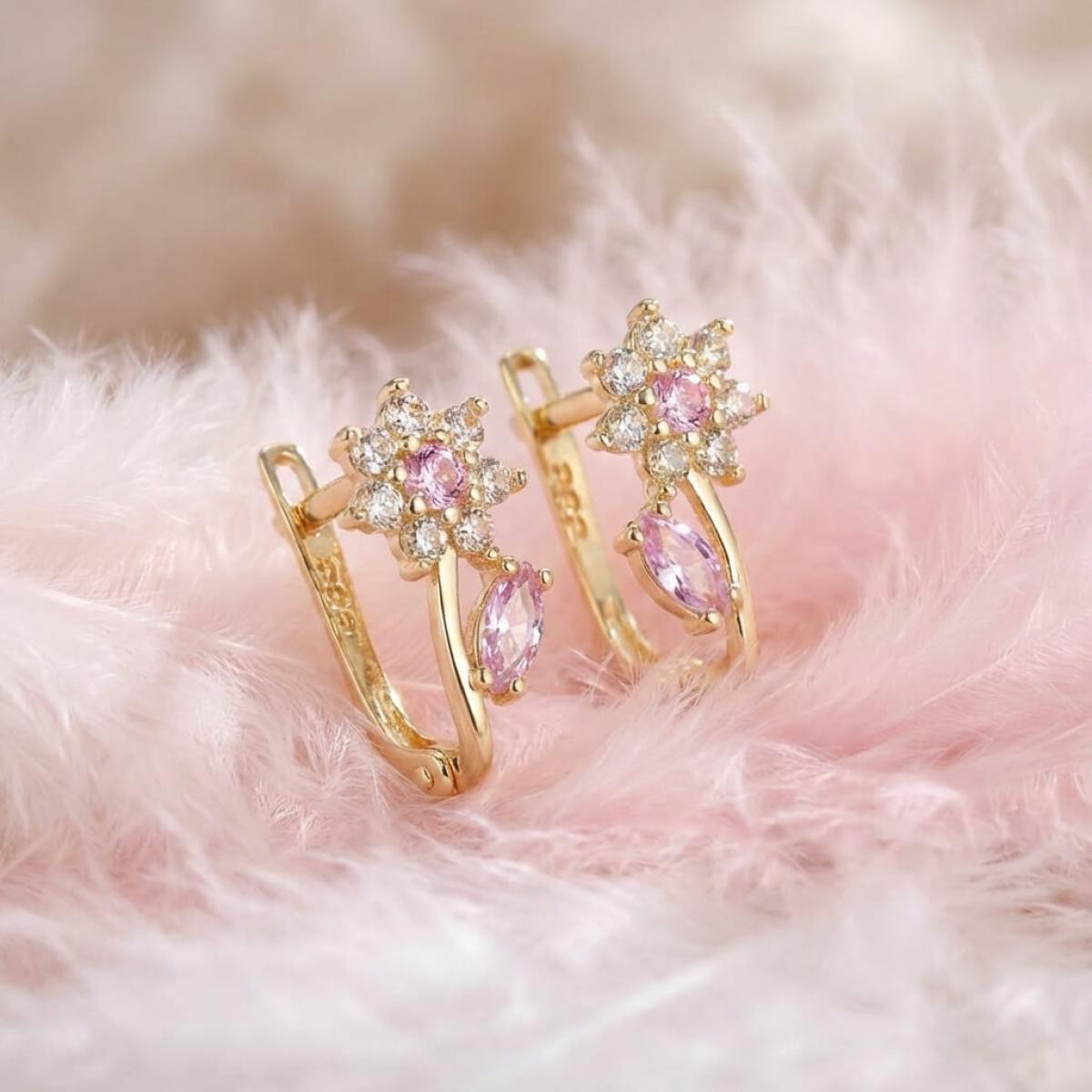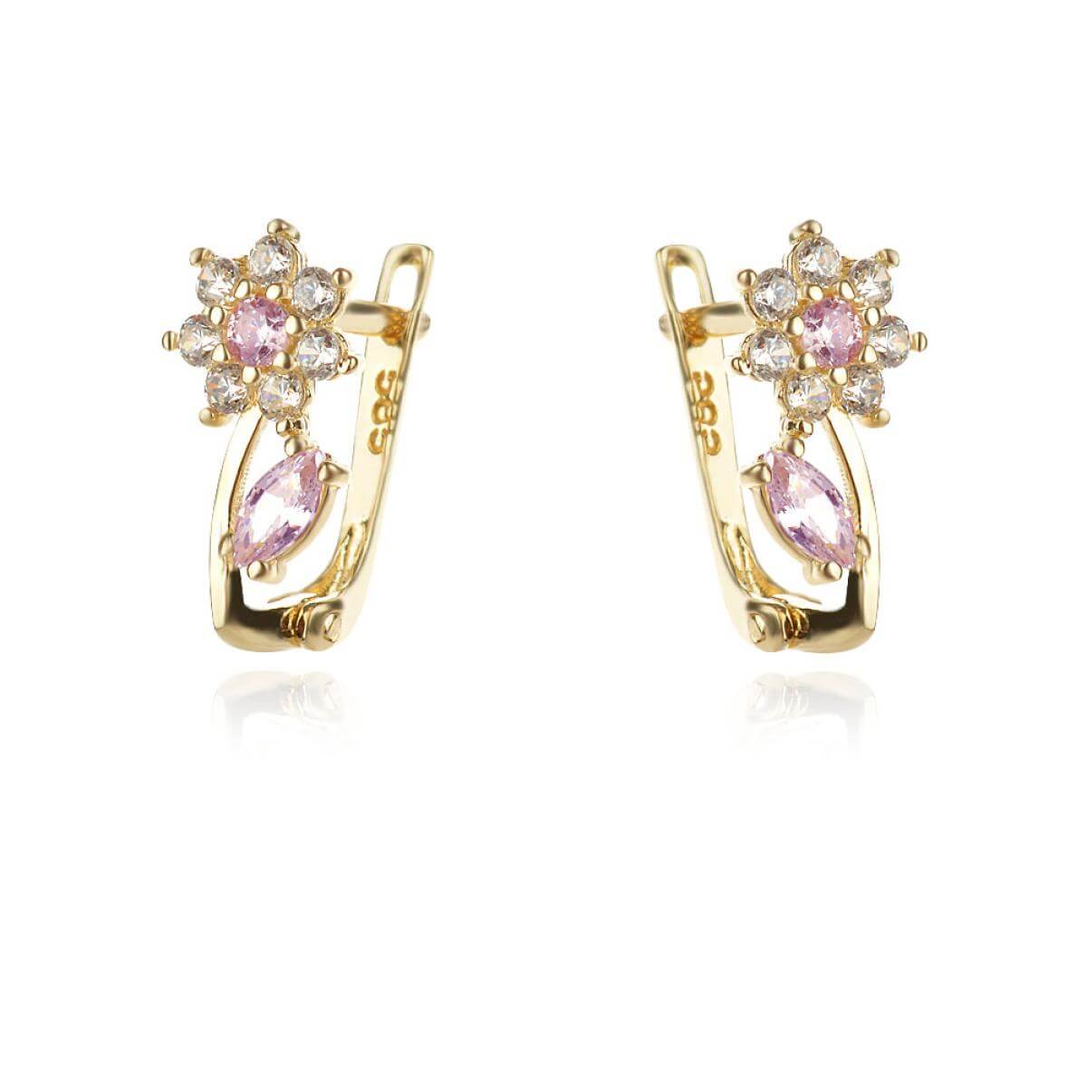 - Детски златни обеци във формата на цветенца с бели и розови циркони