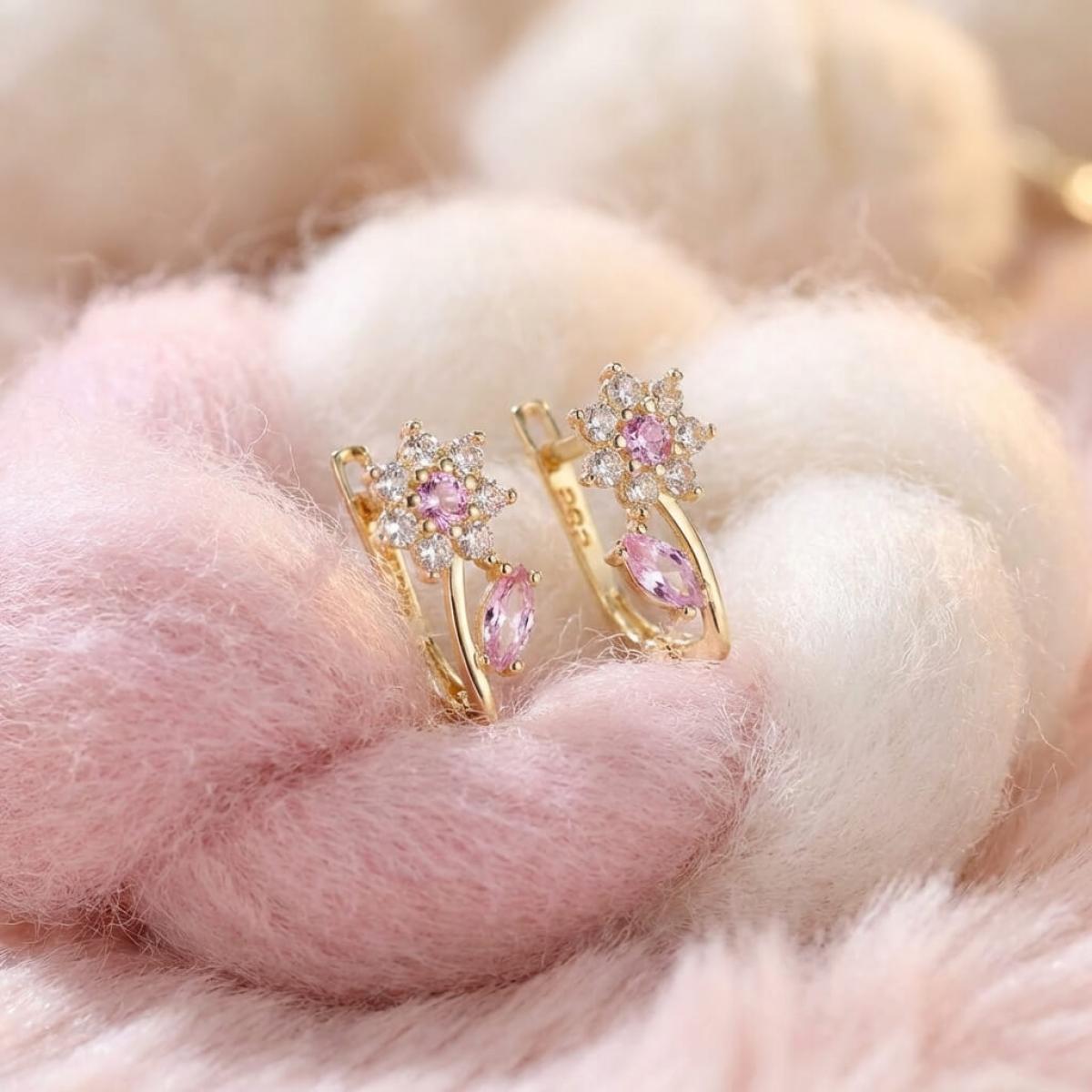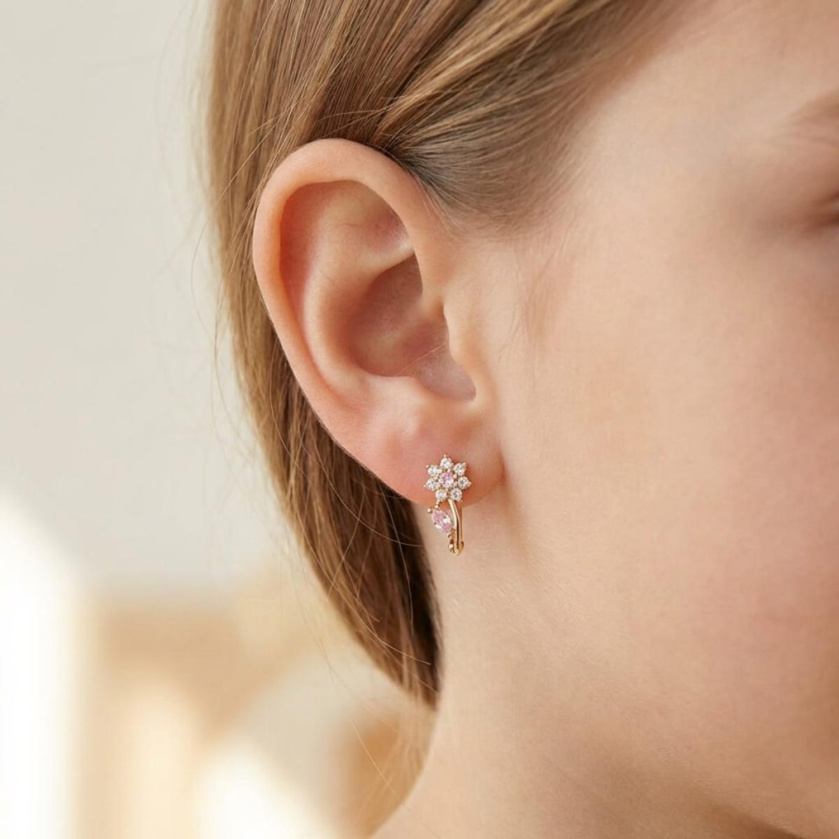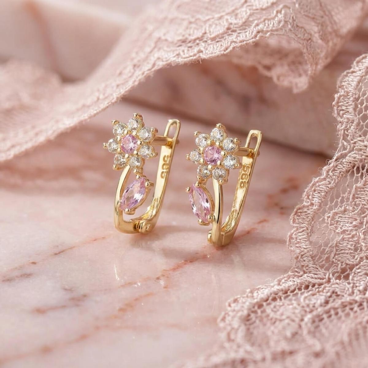 - Детски златни обеци във формата на цветенца с бели и розови циркони