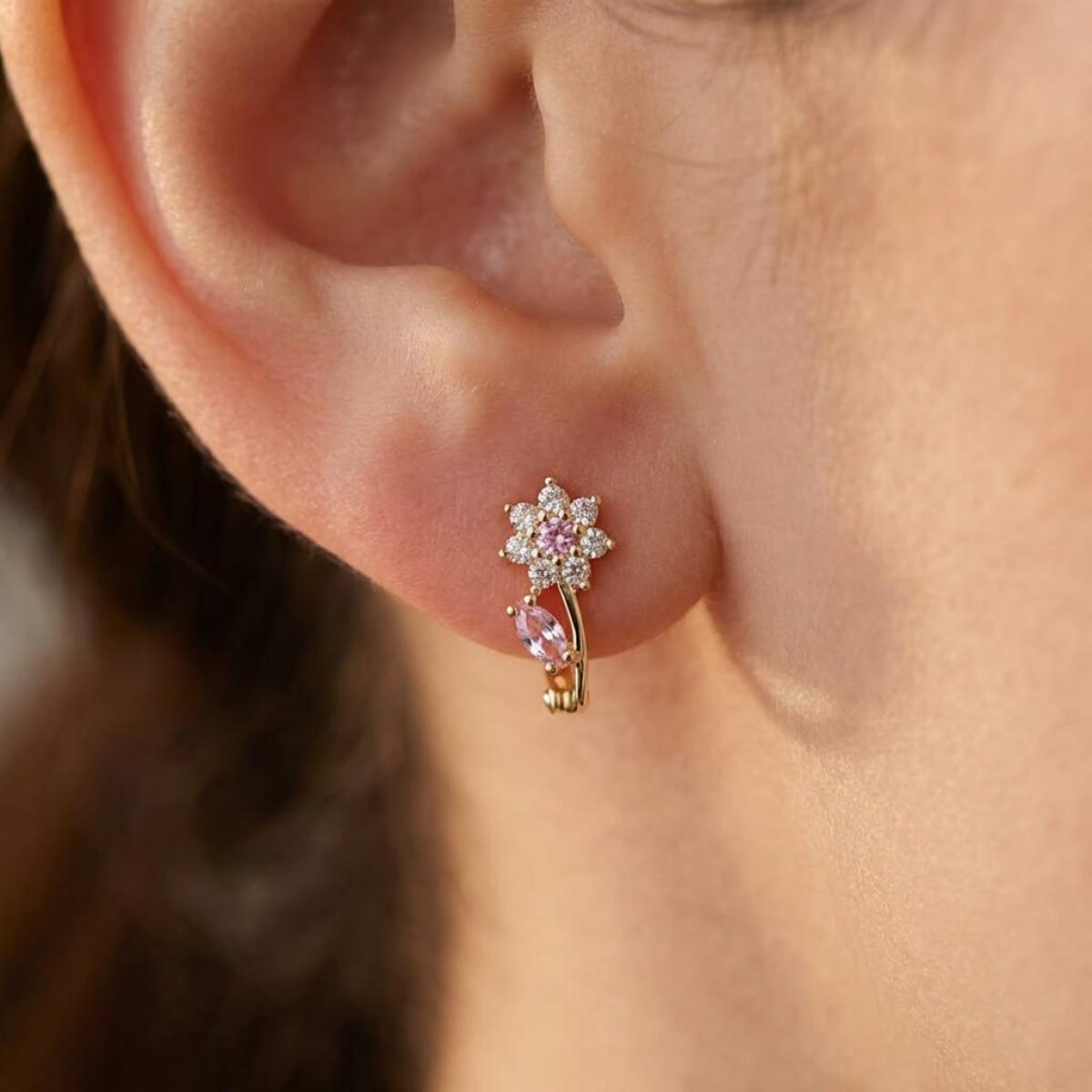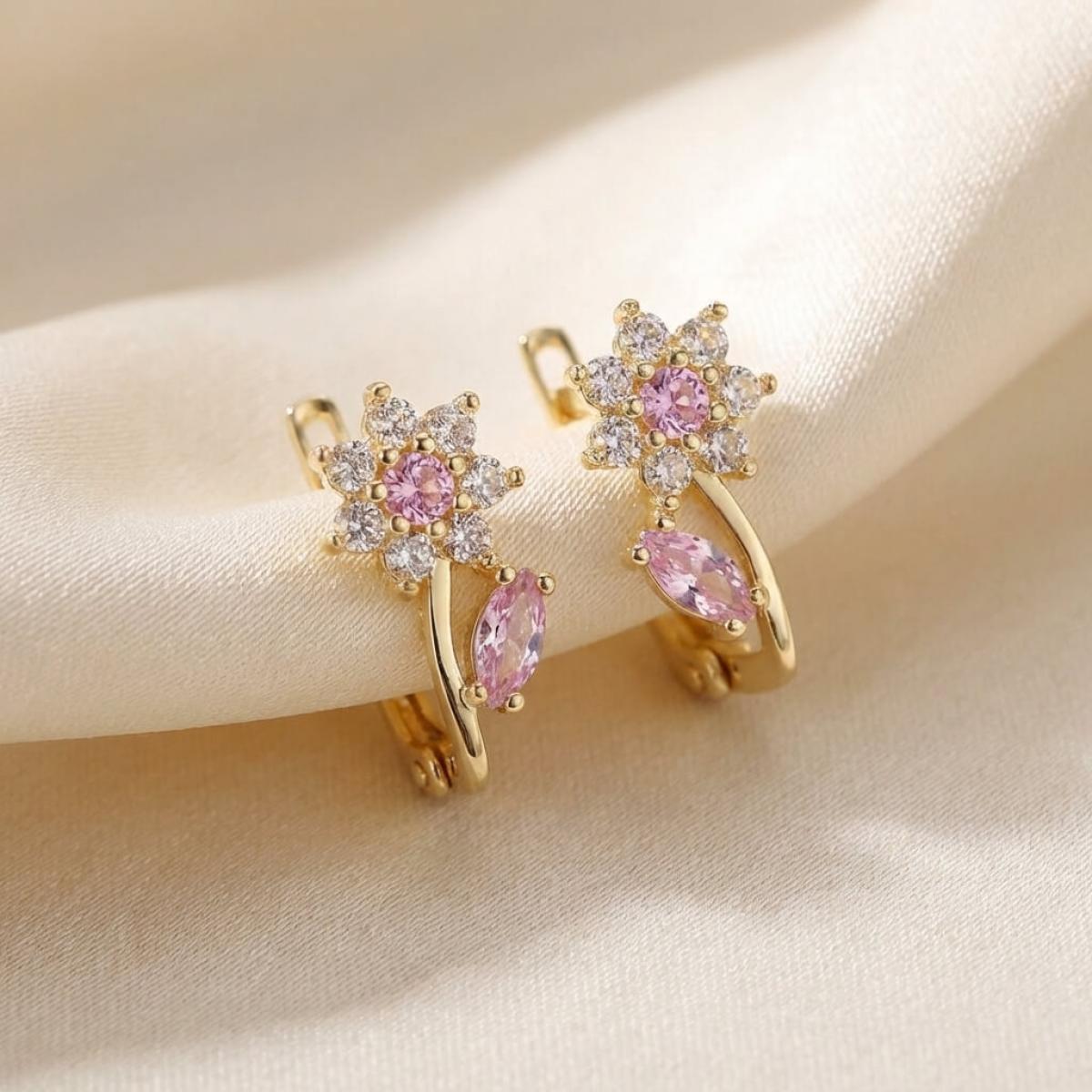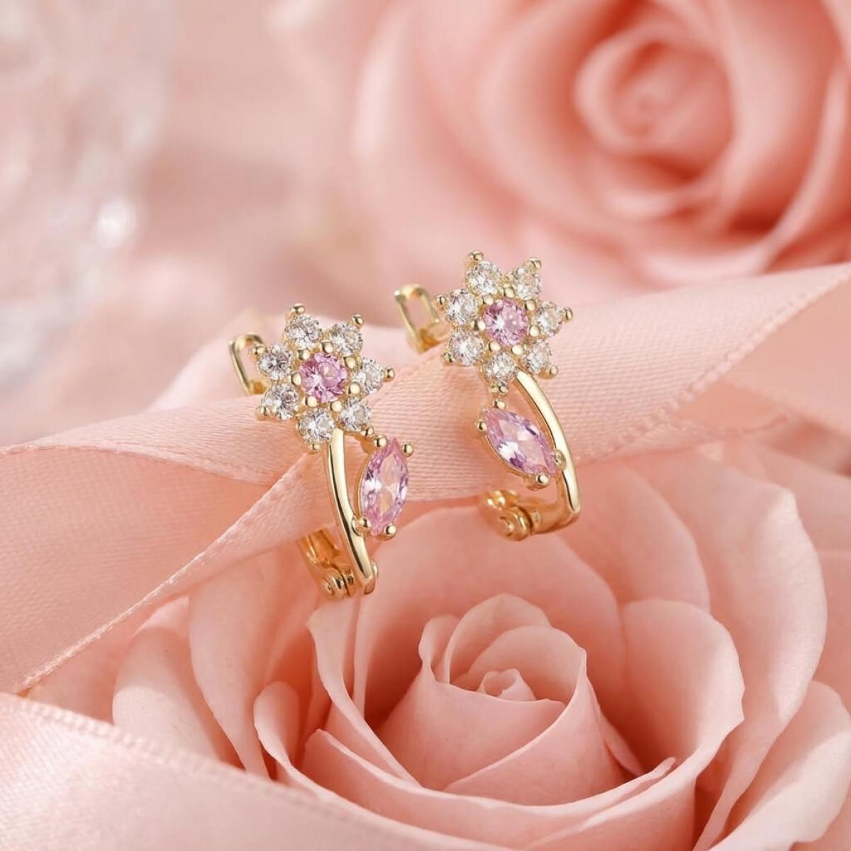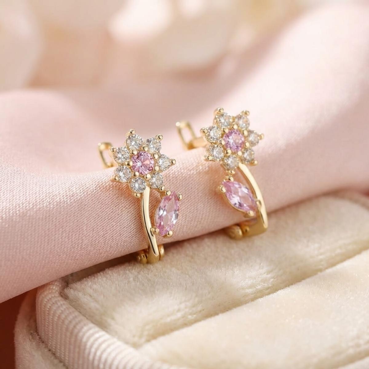- Детски златни обеци във формата на цветенца с бели и розови циркони