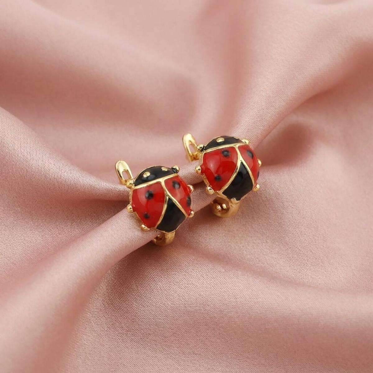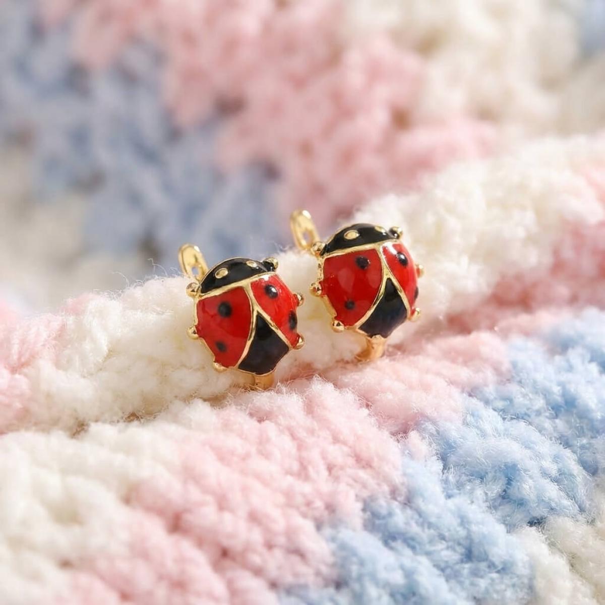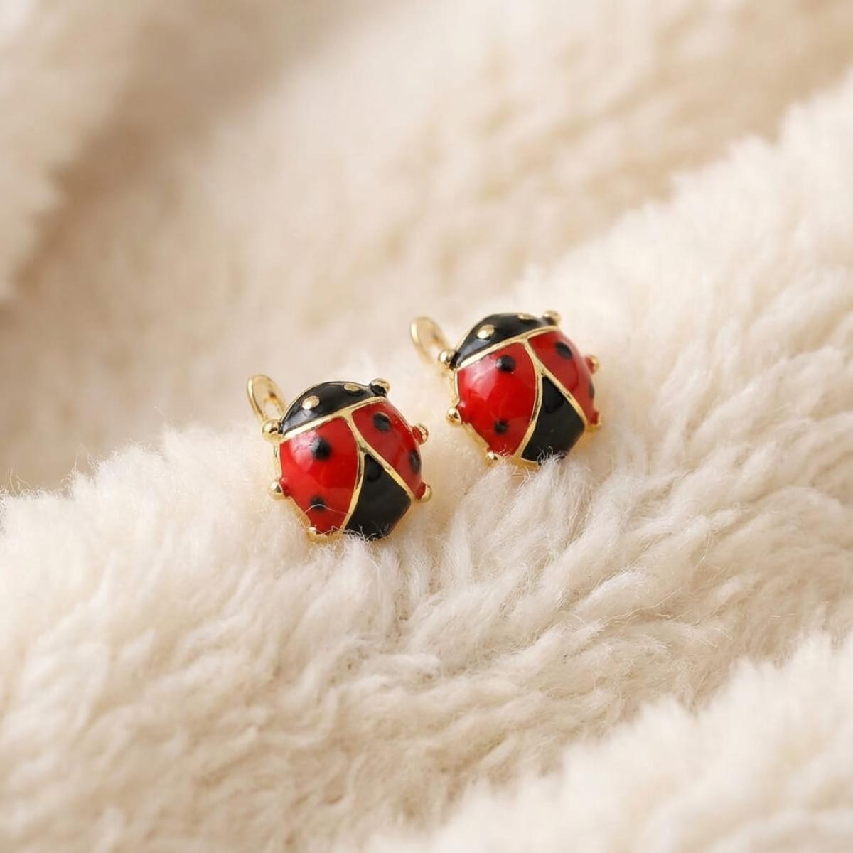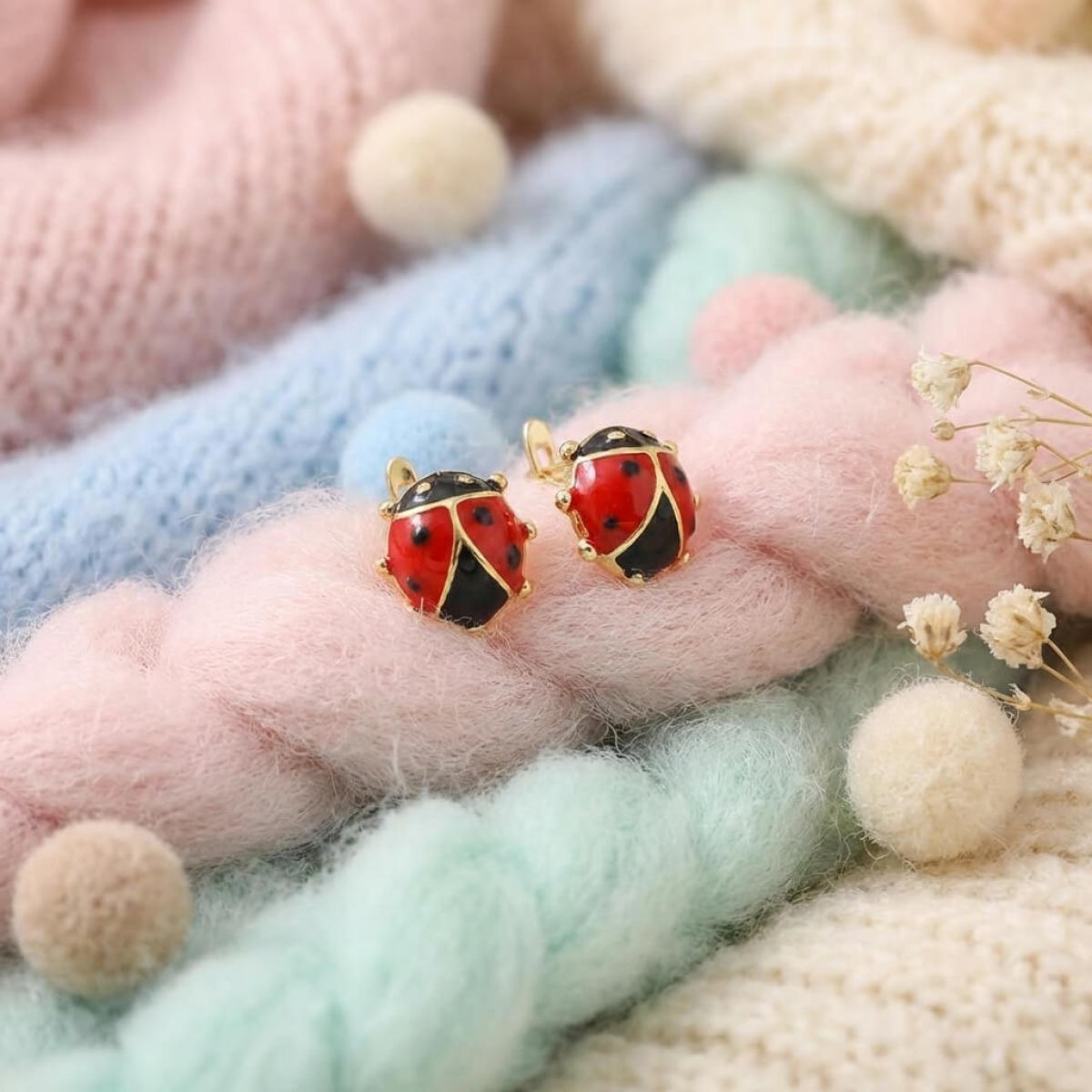 Детски златни обеци с бели циркони и калинка от емайл в средата