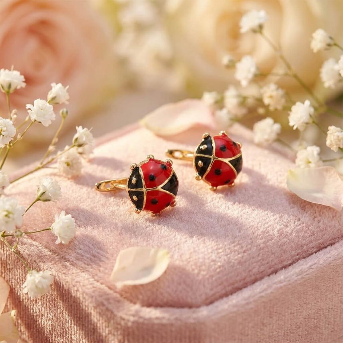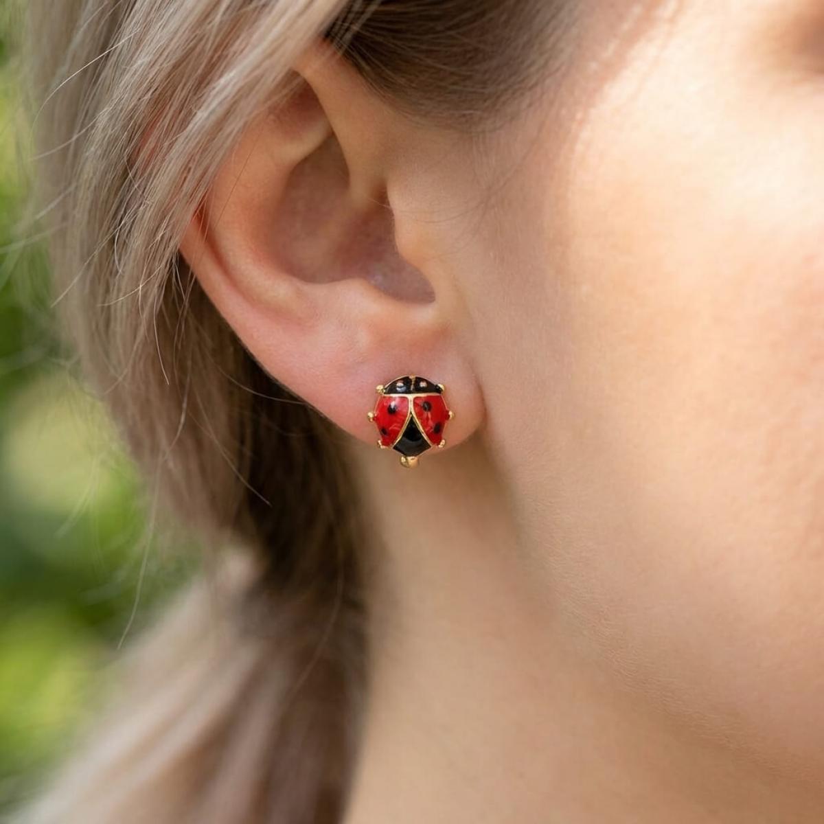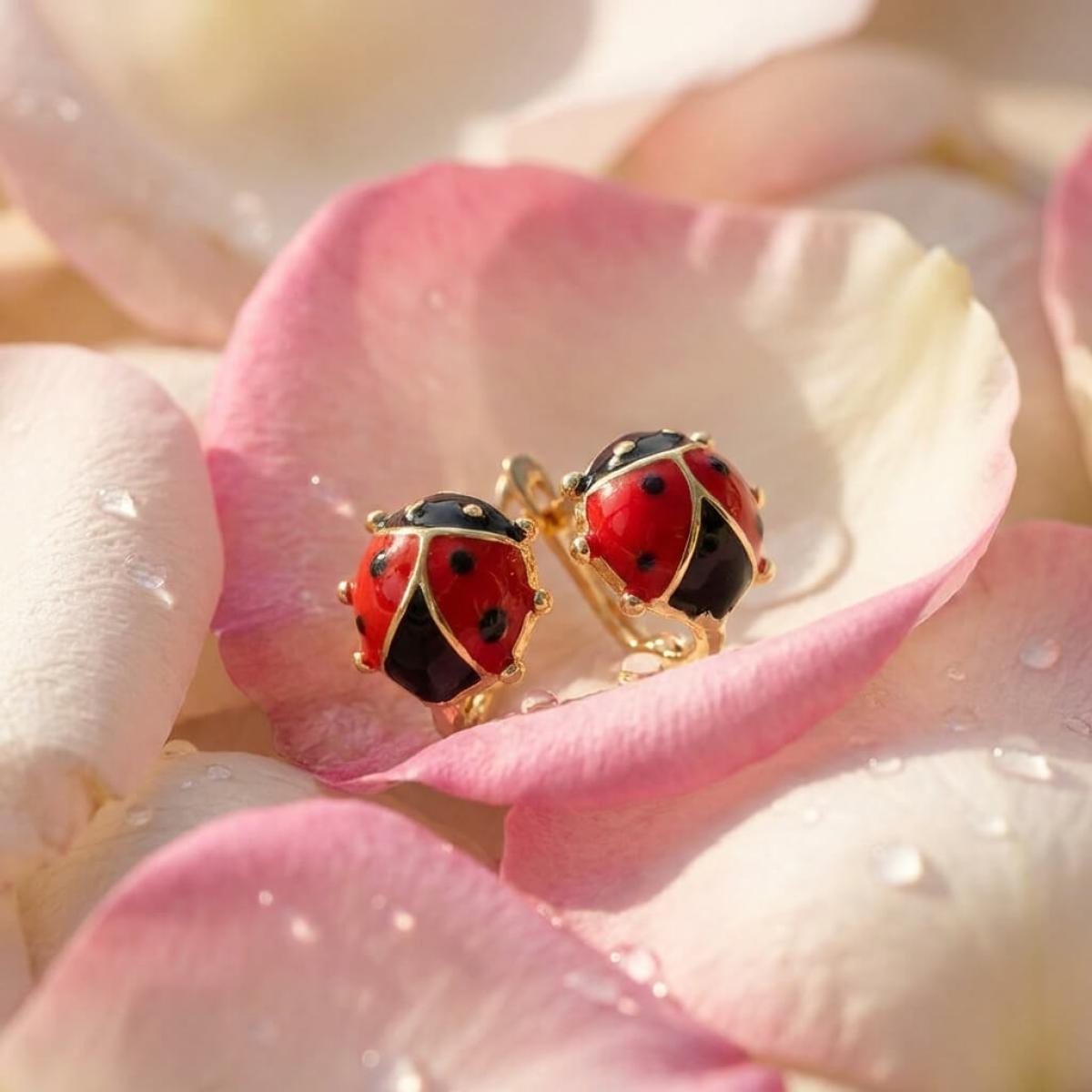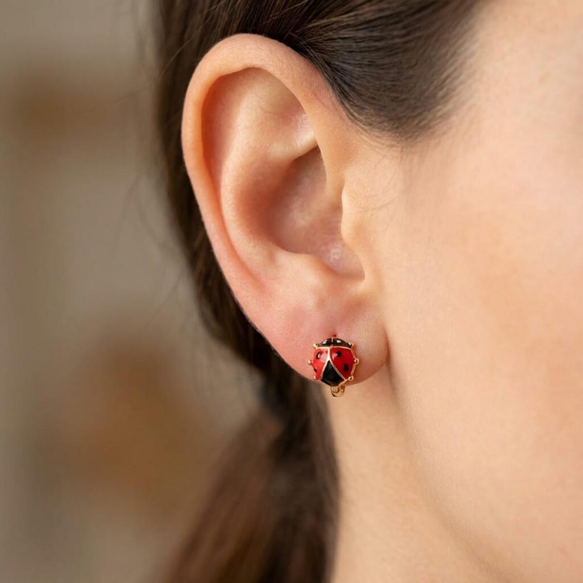 Детски златни обеци с бели циркони и калинка от емайл в средата