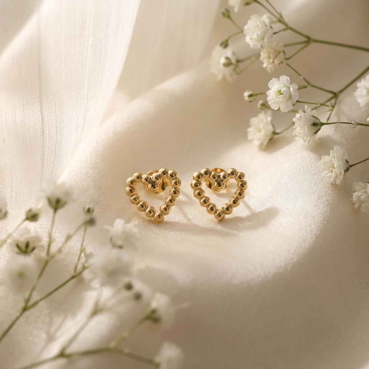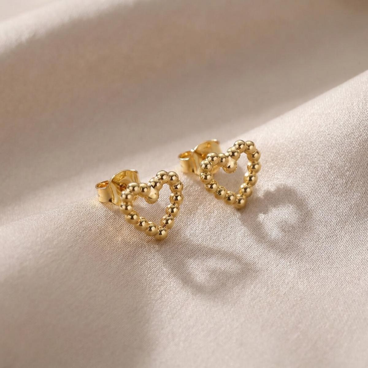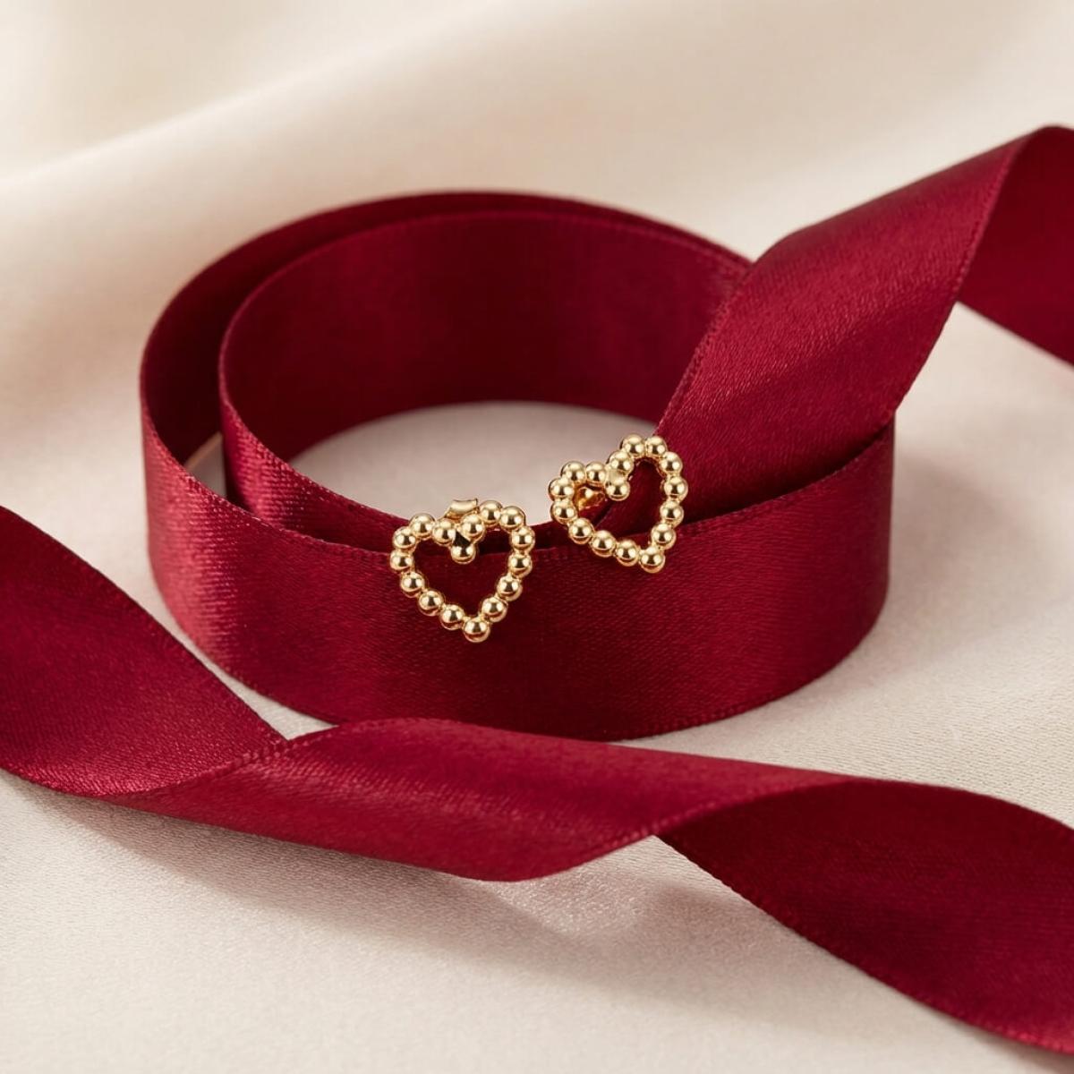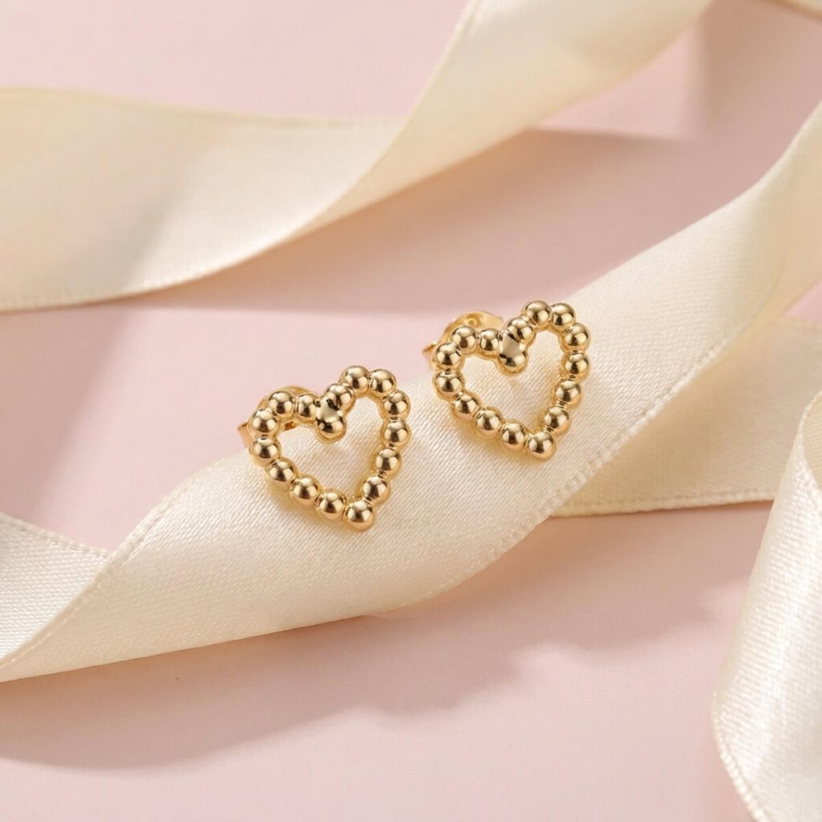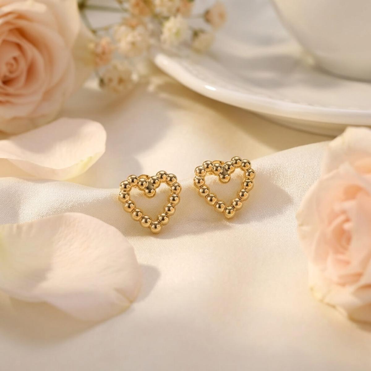 Сърцето е съставено от множество малки топчета, направени от 14-каратово злато проба 585. Големината на декоративния елемент е 9,5мм – напълно достатъчен, за да се забелязва, но без да е груб и неуместен в строга професионална среда. Тези обеци са идеални за дами, които предпочитат по-деликатни бижута или са задължени да следват по-стриктен дрес код на работното си място.