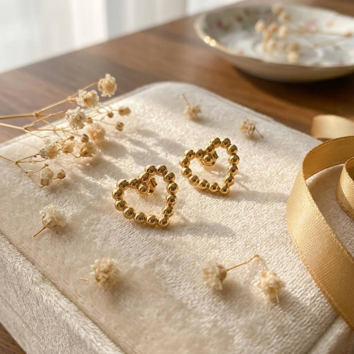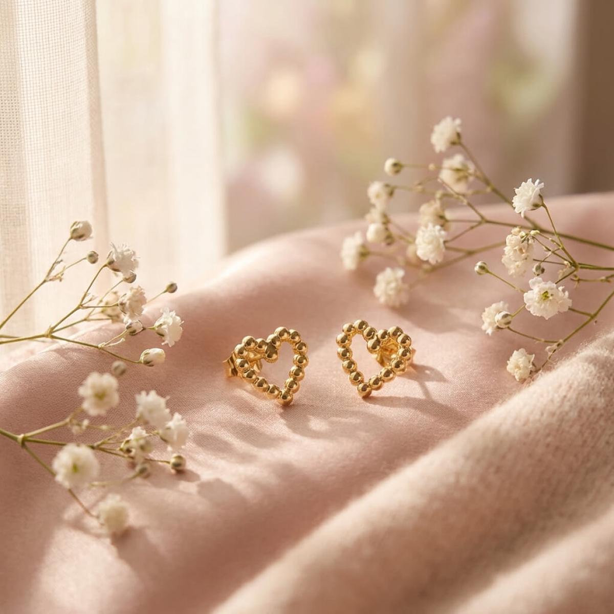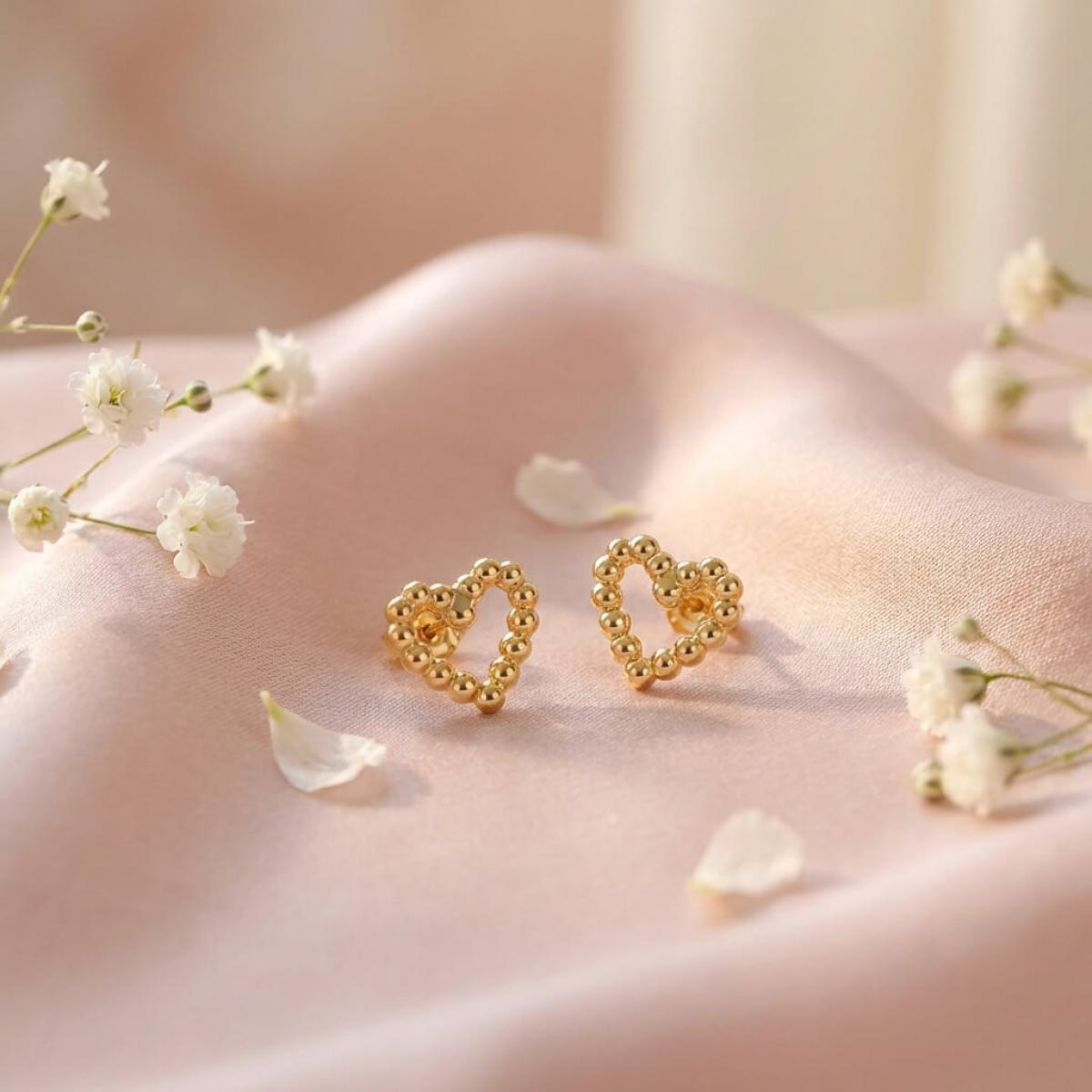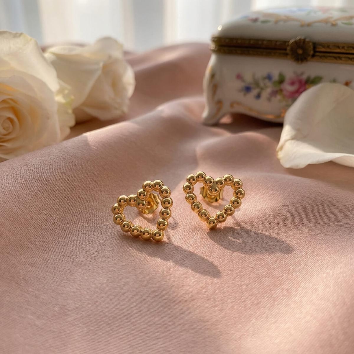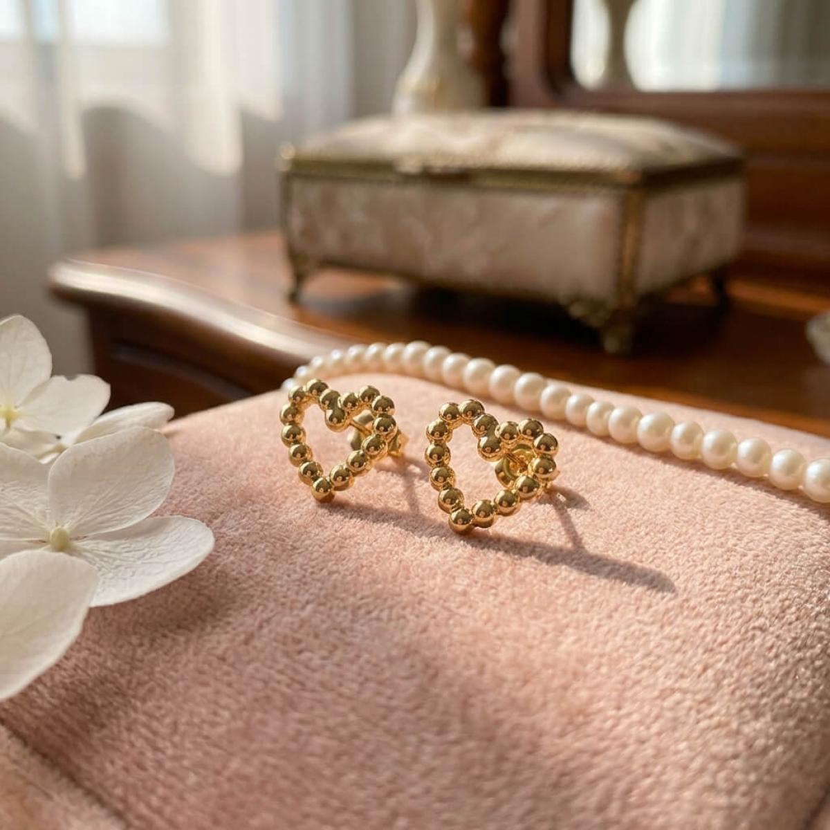 Сърцето е съставено от множество малки топчета, направени от 14-каратово злато проба 585. Големината на декоративния елемент е 9,5мм – напълно достатъчен, за да се забелязва, но без да е груб и неуместен в строга професионална среда. Тези обеци са идеални за дами, които предпочитат по-деликатни бижута или са задължени да следват по-стриктен дрес код на работното си място.