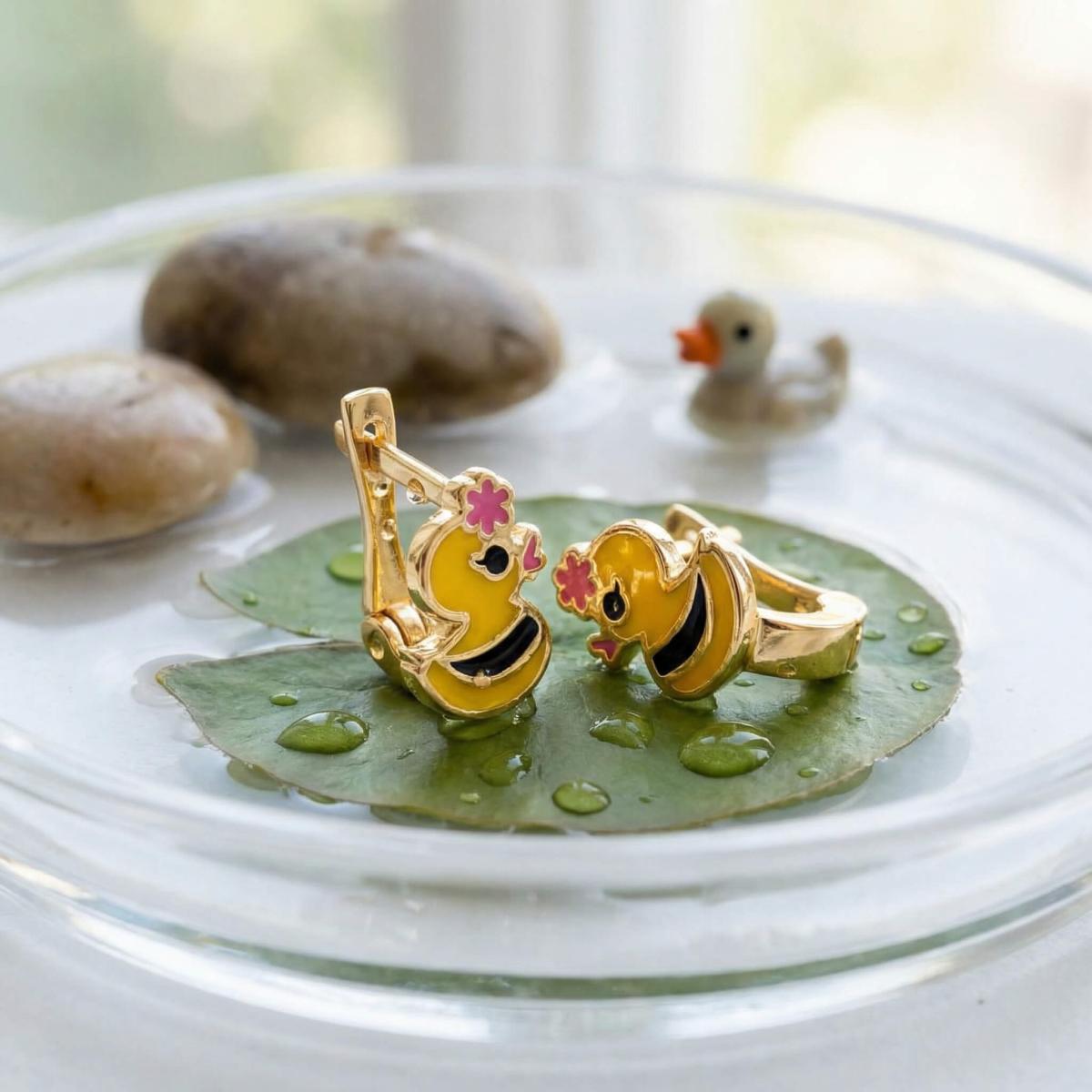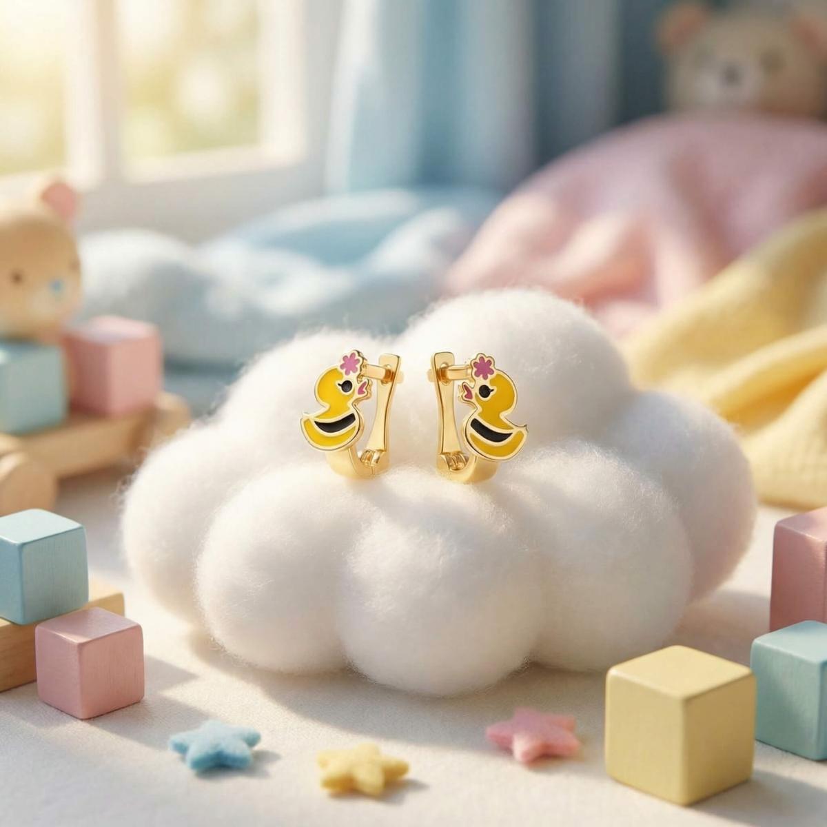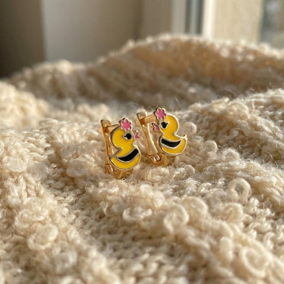 Златните детски обеци са идеални за вашето дете. Освен, че дизайнът им представя любима на децата тематика, те са удобни и напълно безопасни за съвсем малките деца. Емайловото покритие е напълно безопасно, защото в състава му липсват каквито и да е токсични вещества и алергени. Малкият размер на обецата позволява да се покрие само месестата част на детското ухо, така че тя не може да се оплете в дрешките или косата.