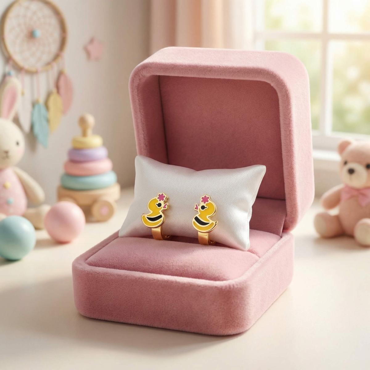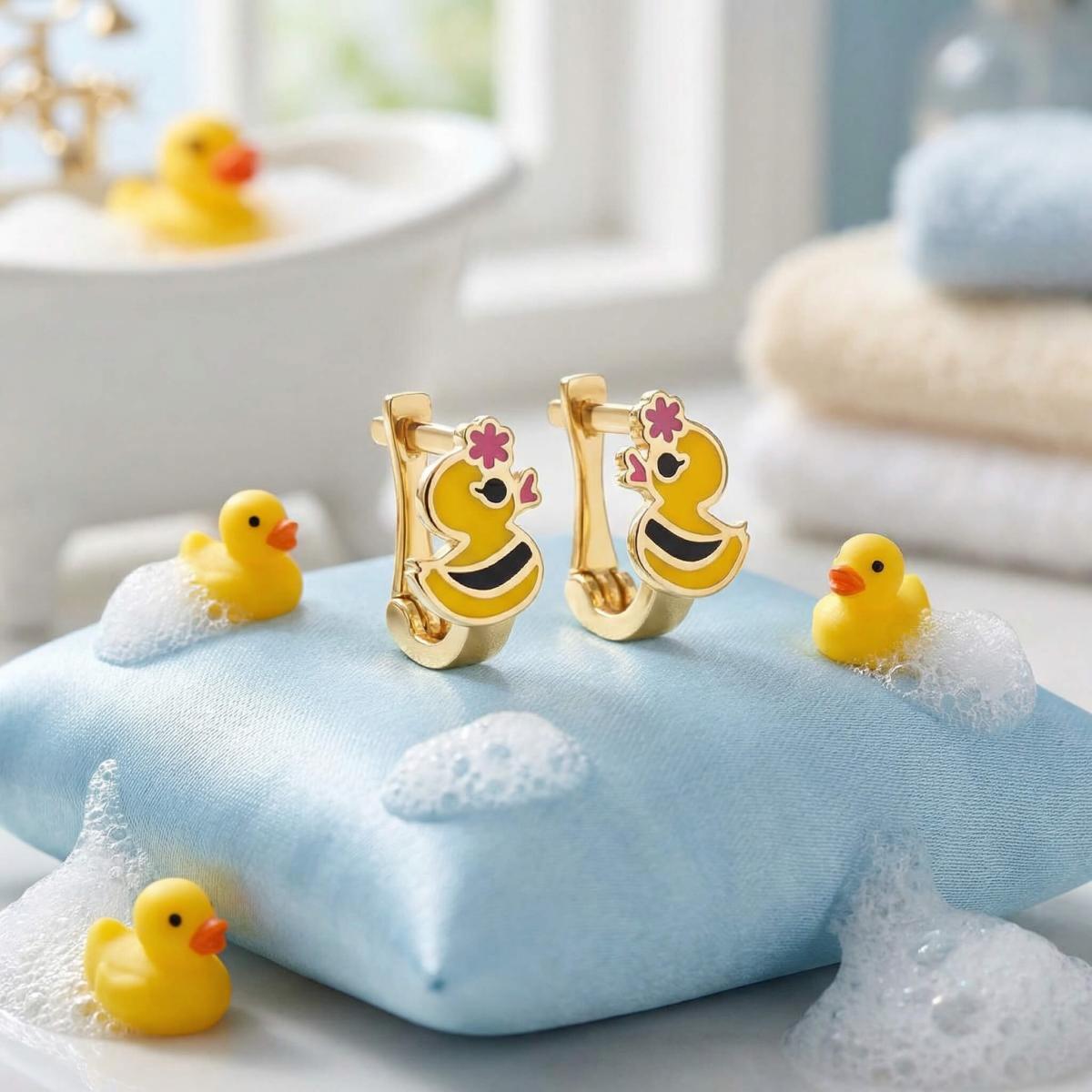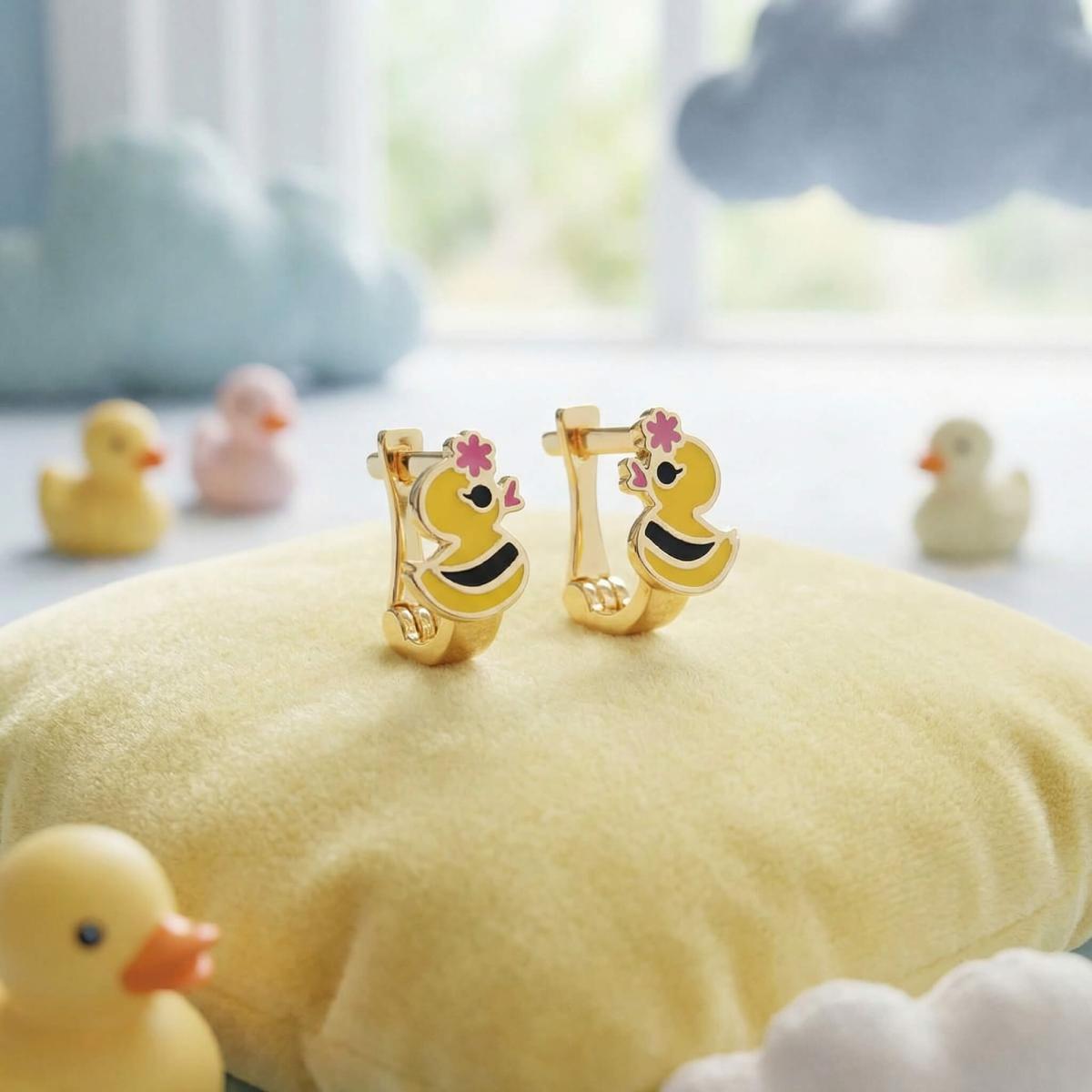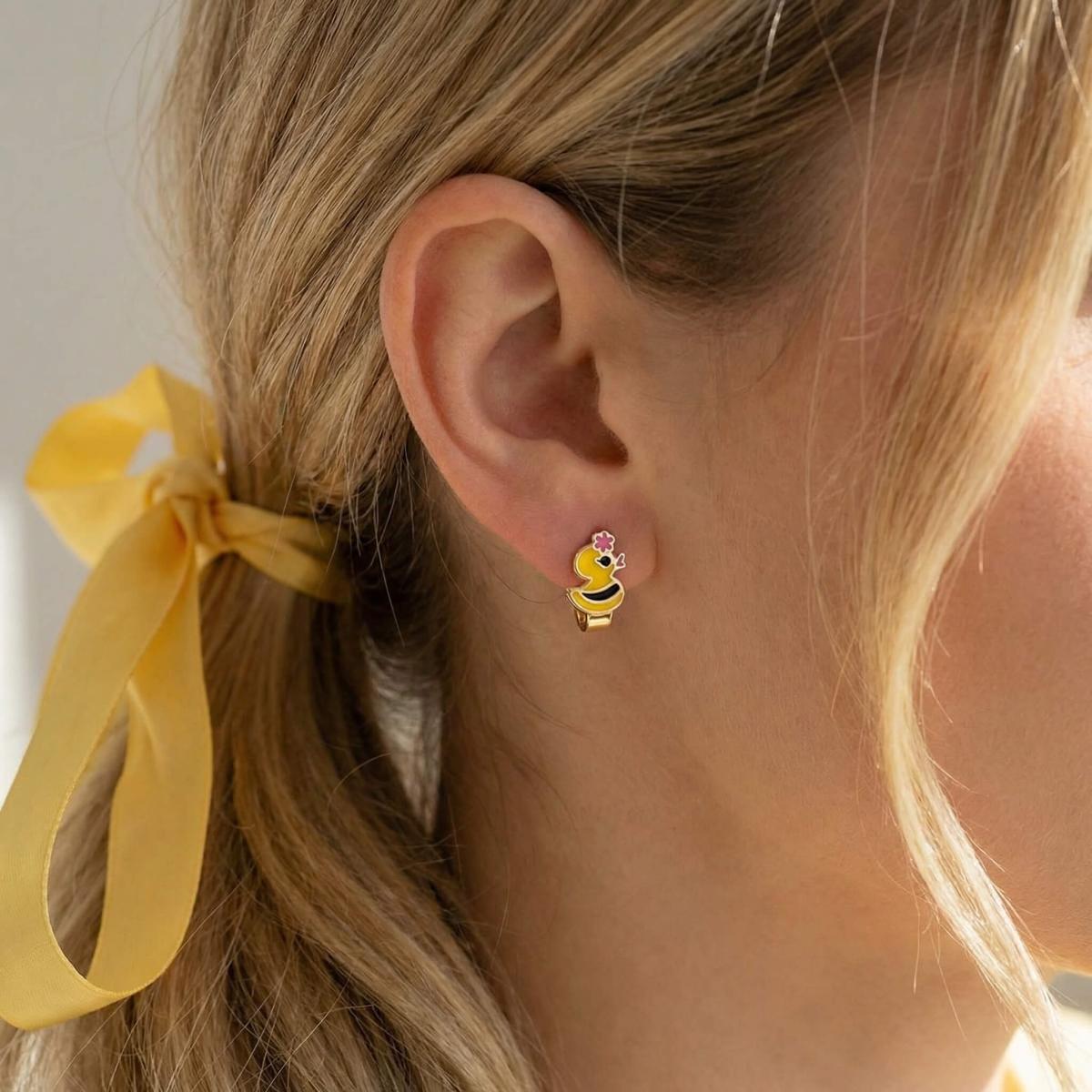 Златните детски обеци са идеални за вашето дете. Освен, че дизайнът им представя любима на децата тематика, те са удобни и напълно безопасни за съвсем малките деца. Емайловото покритие е напълно безопасно, защото в състава му липсват каквито и да е токсични вещества и алергени. Малкият размер на обецата позволява да се покрие само месестата част на детското ухо, така че тя не може да се оплете в дрешките или косата.