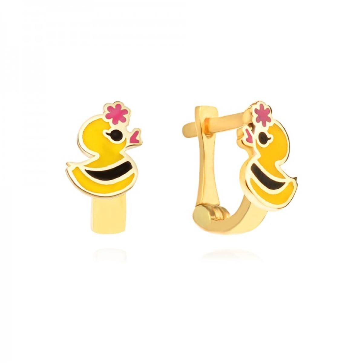 Детски златни обеци с жълт, розов и черен емайл. Стабилно закопчаване.
