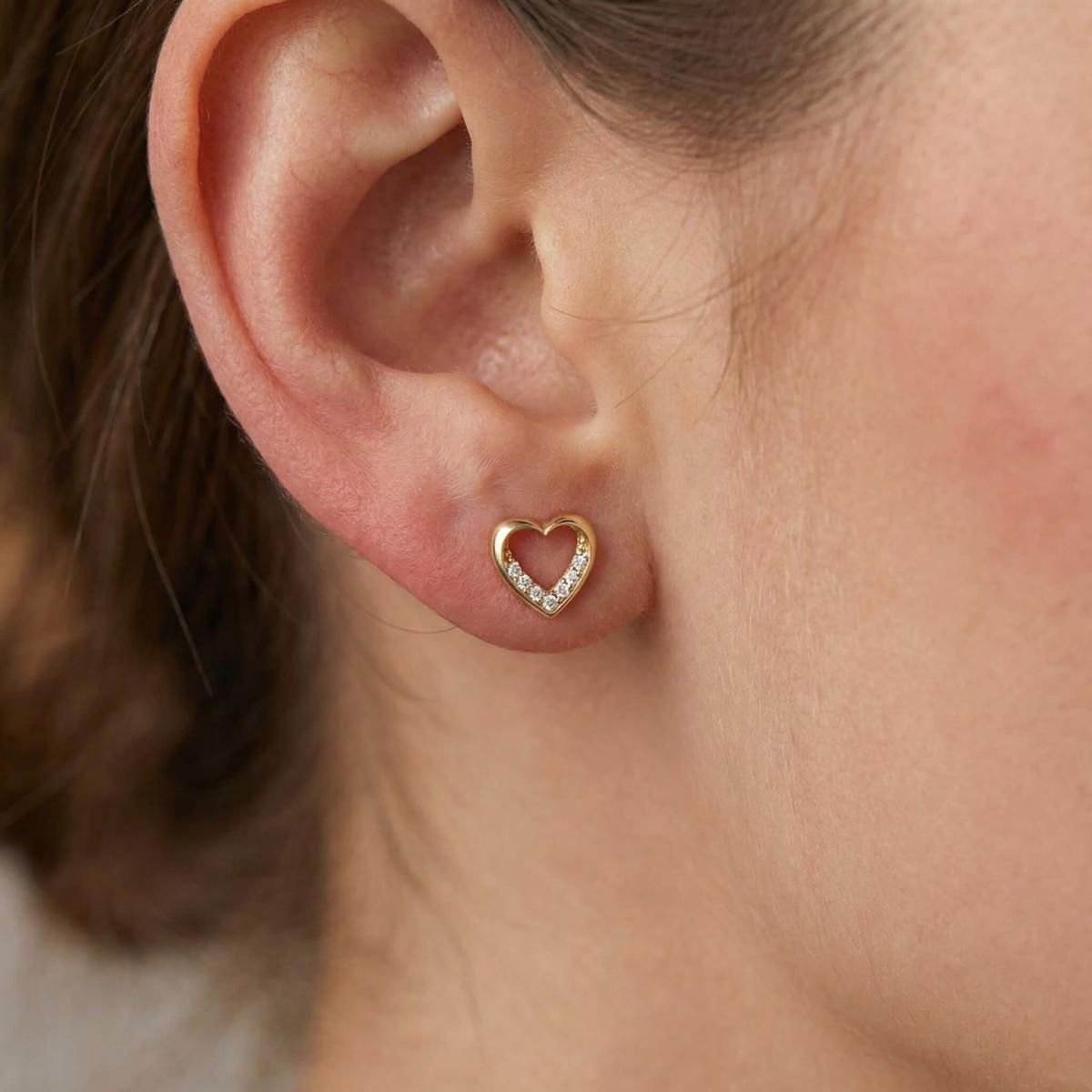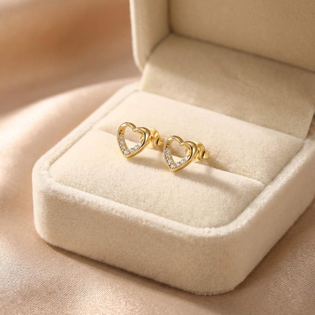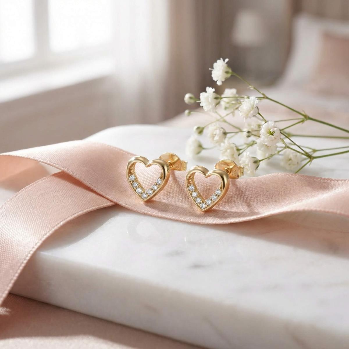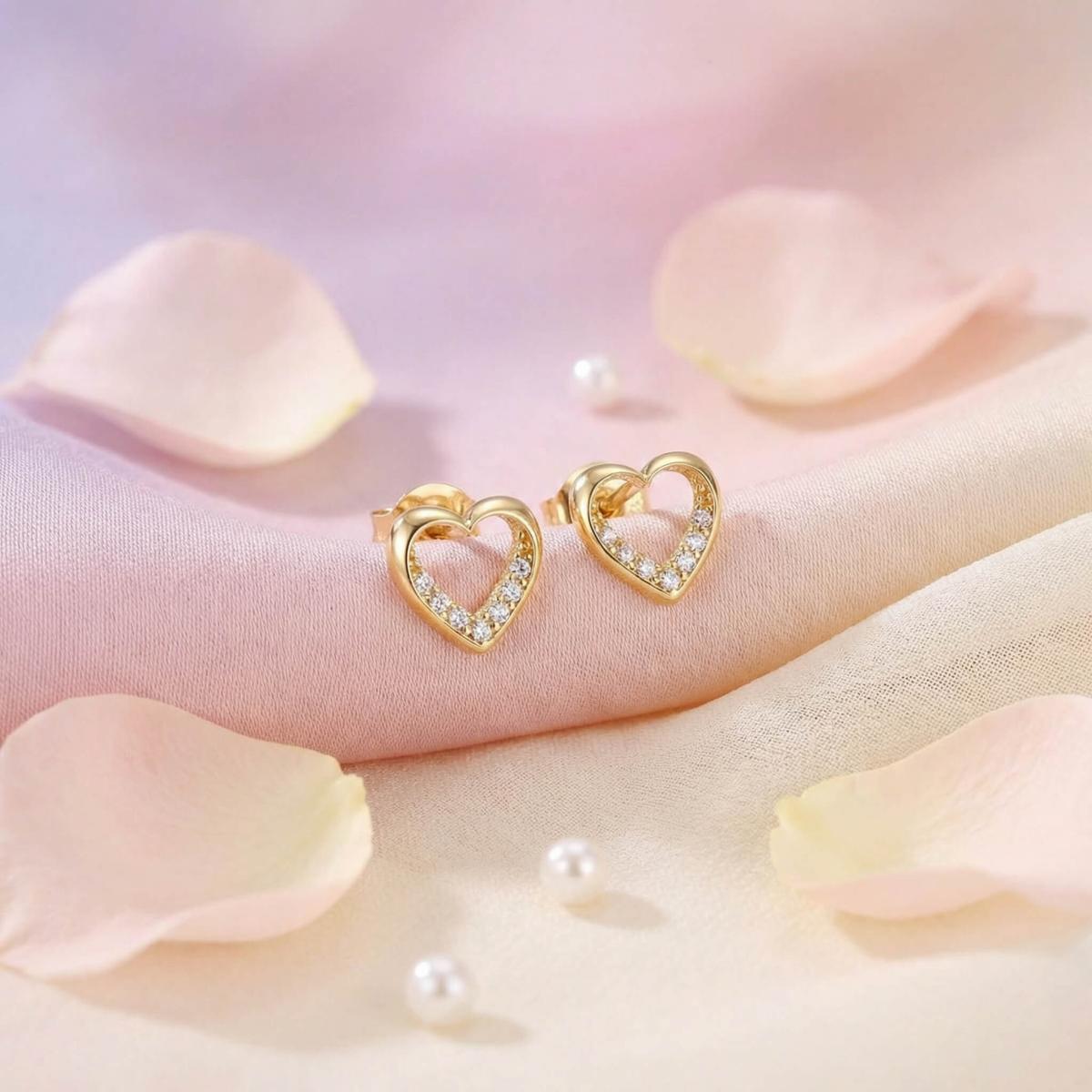 Нежни златни обеци с бели циркони във формата на сърце