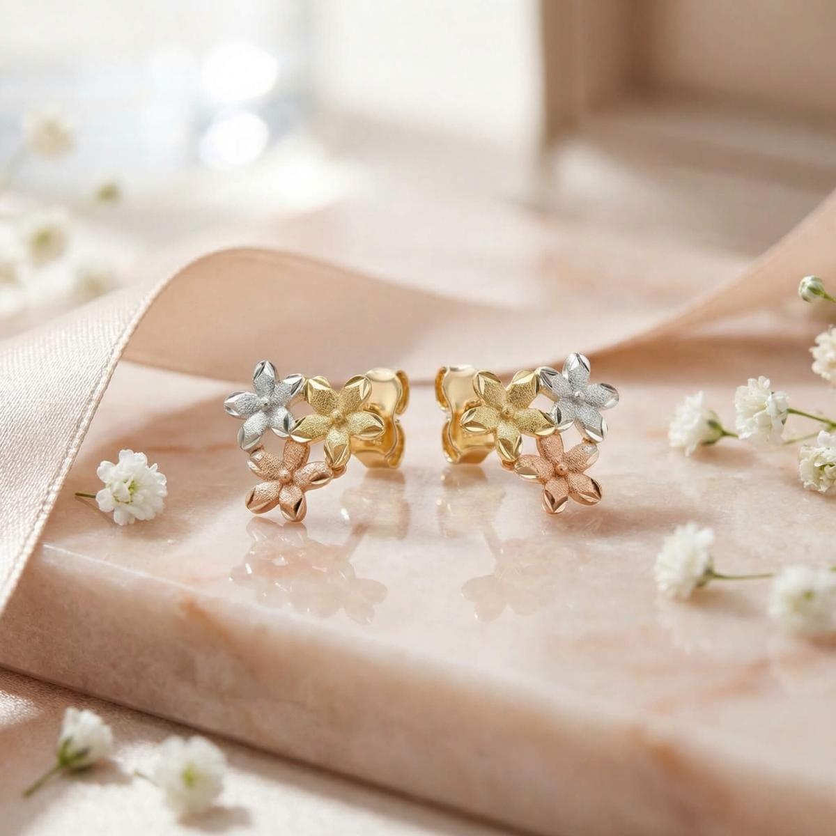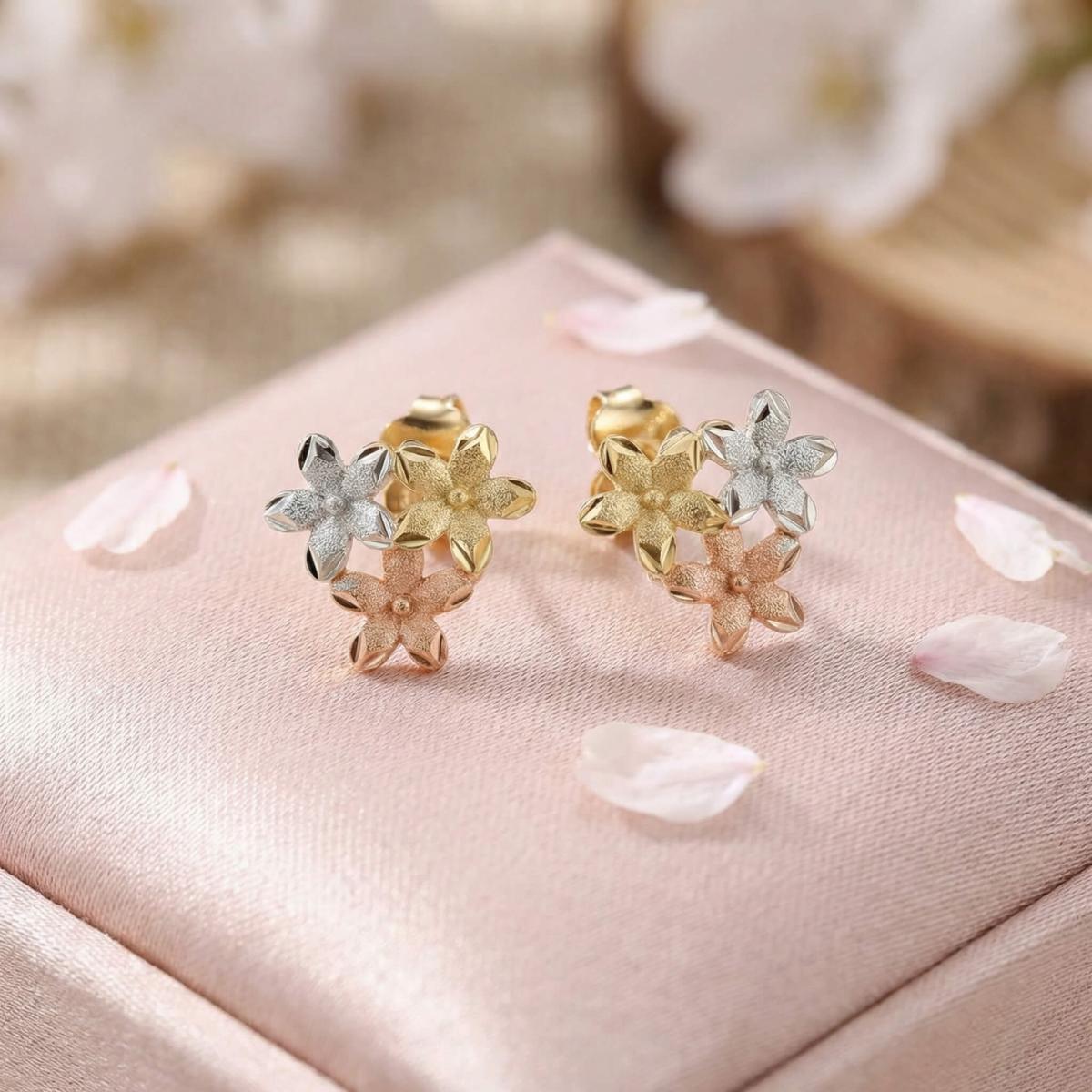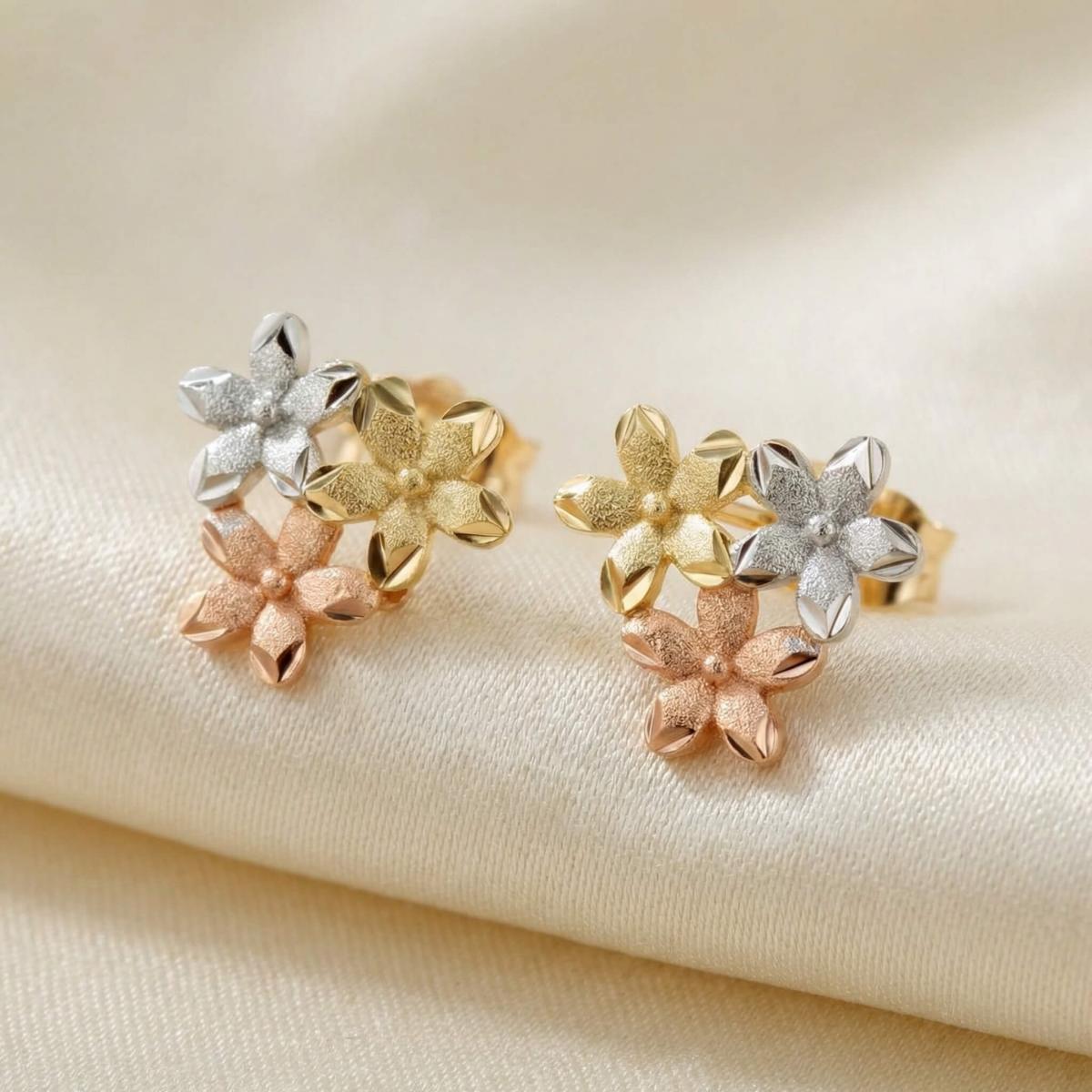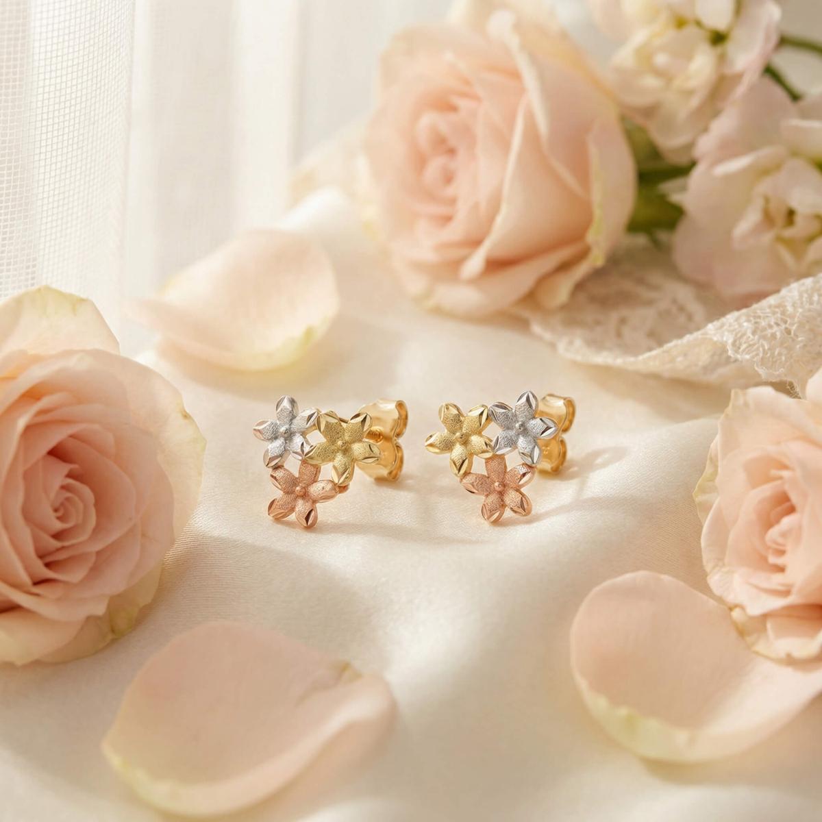Те са изработени от висококачествено злато с проба 585 и са комбинация от бяло, жълто и розово злато. Дизайнът им представлява нежно цвете, което е разделено на три цветни части.