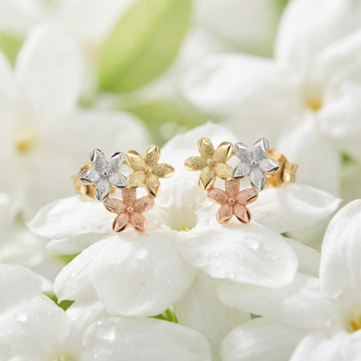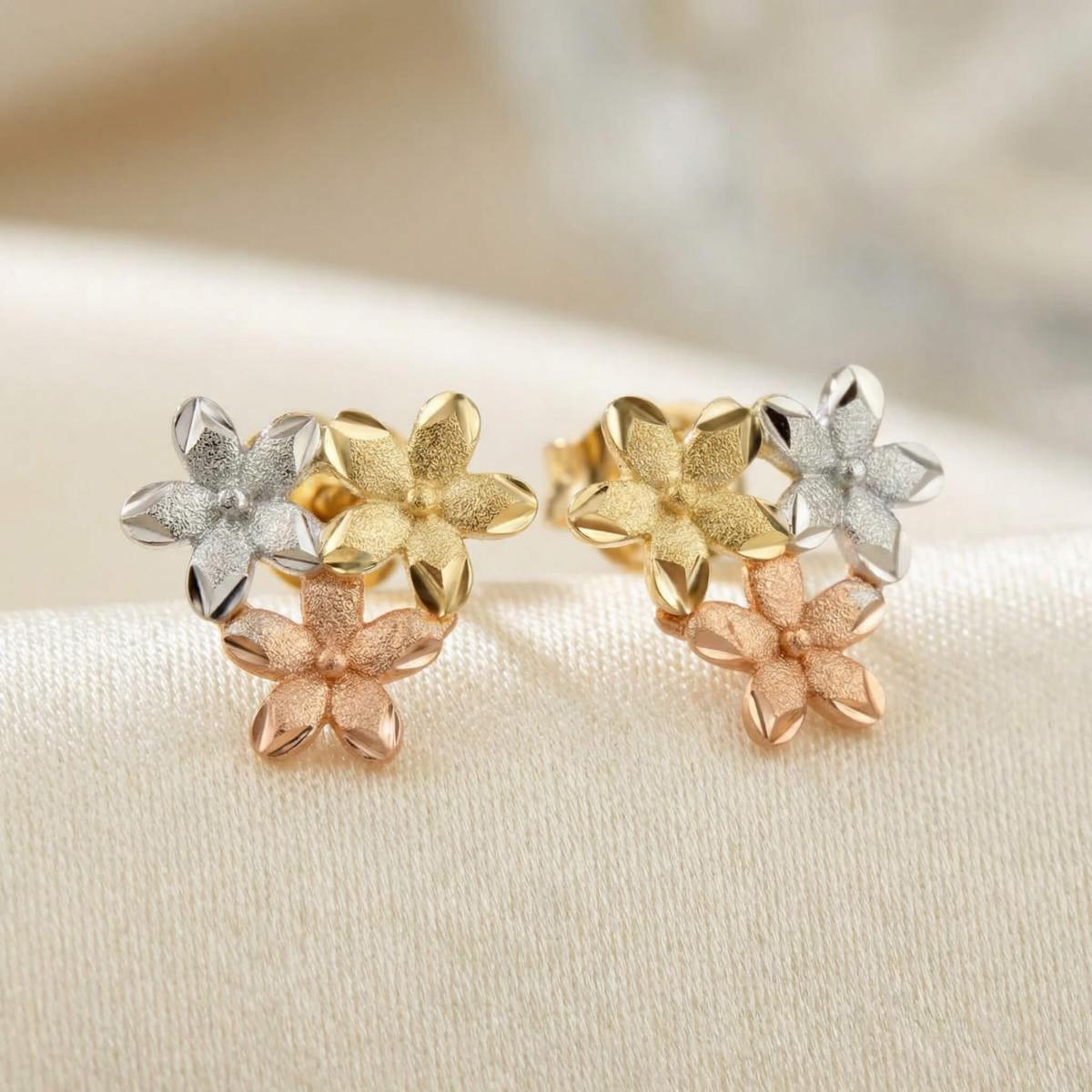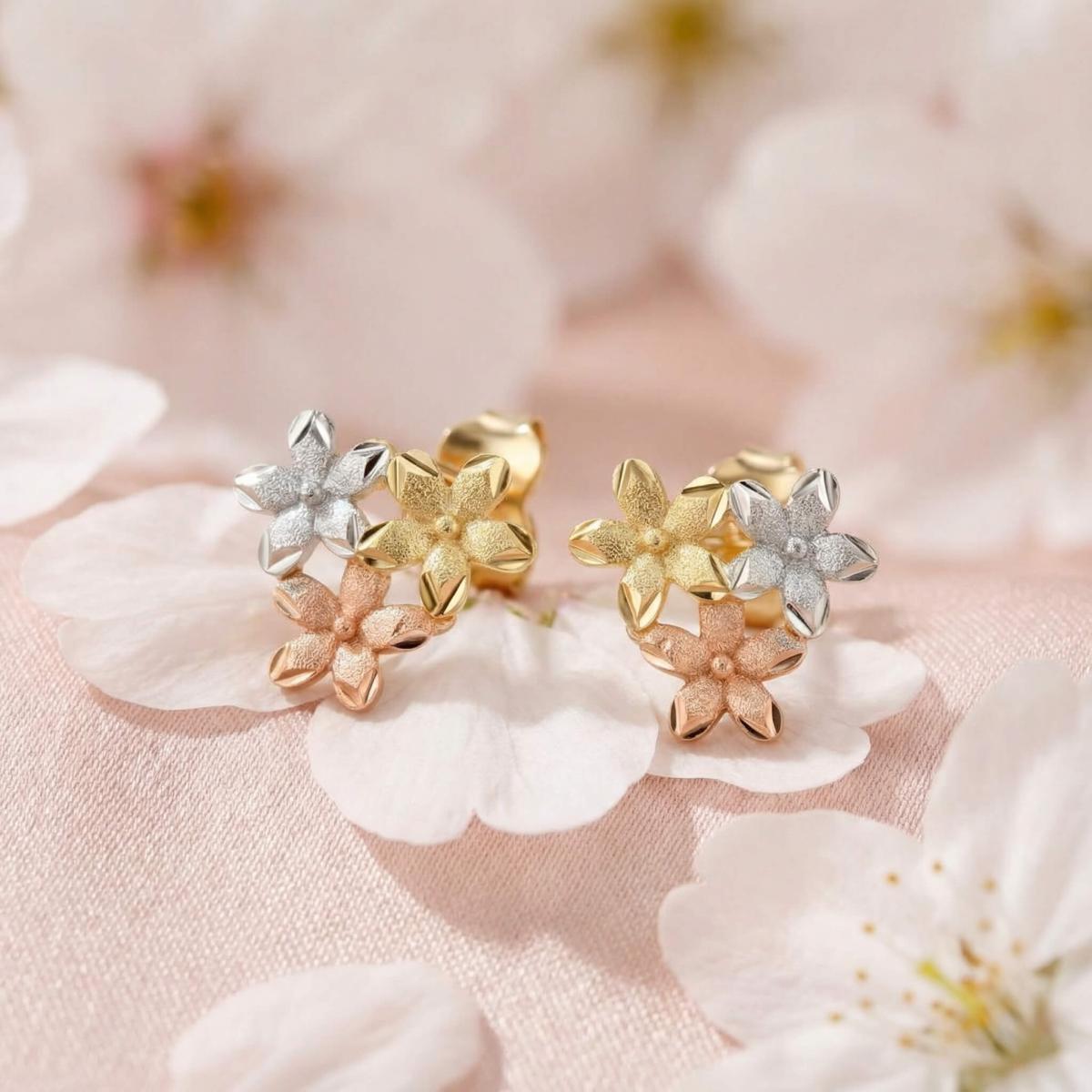 Те са изработени от висококачествено злато с проба 585 и са комбинация от бяло, жълто и розово злато. Дизайнът им представлява нежно цвете, което е разделено на три цветни части.