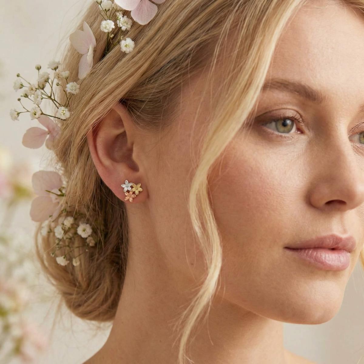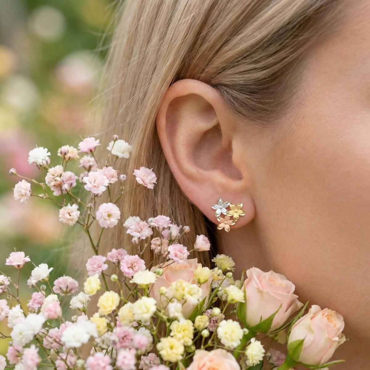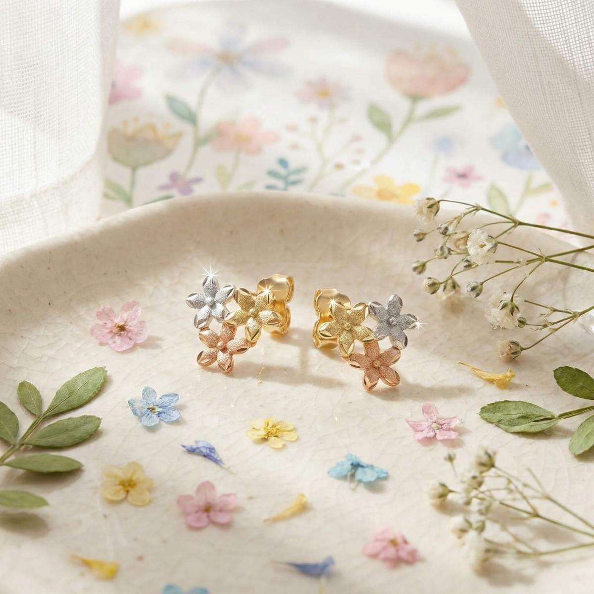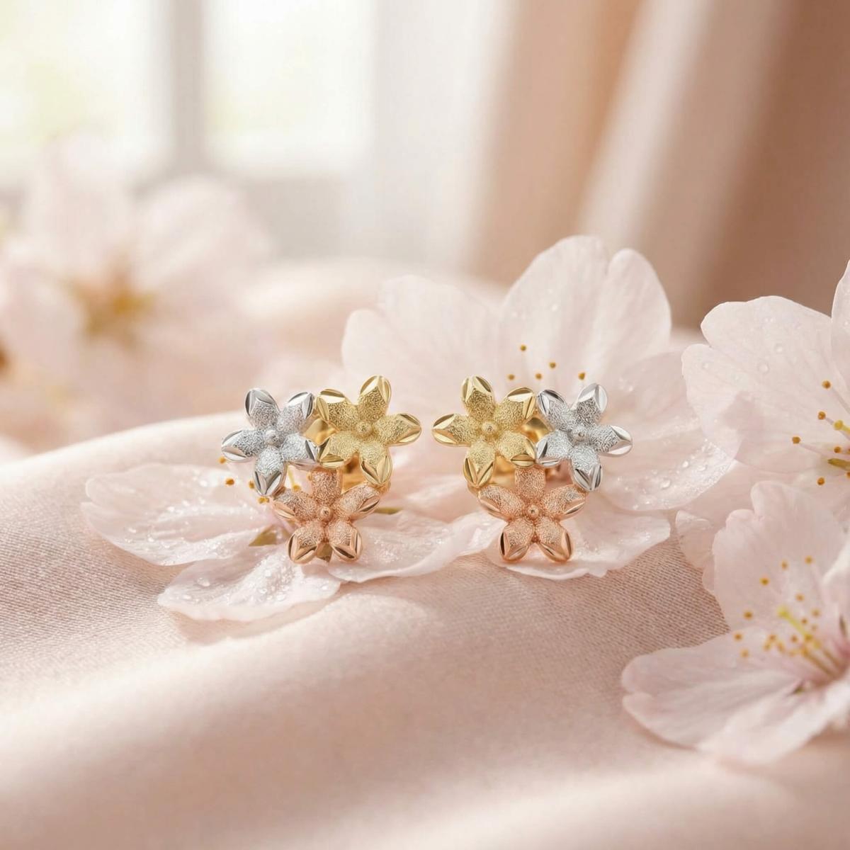 Те са изработени от висококачествено злато с проба 585 и са комбинация от бяло, жълто и розово злато. Дизайнът им представлява нежно цвете, което е разделено на три цветни части.