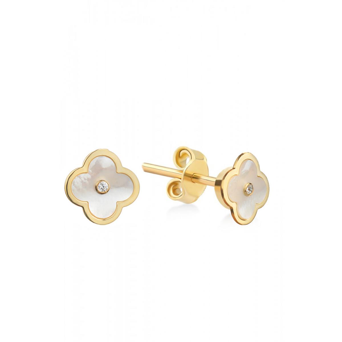 - Златни обеци във формата на детелинка с бял седеф