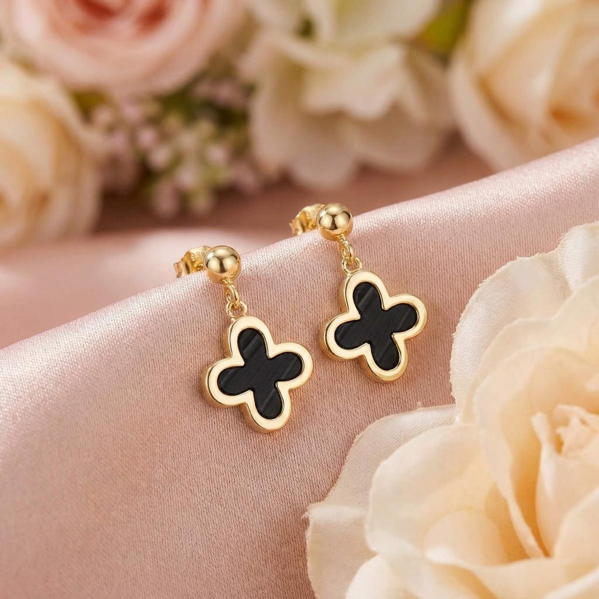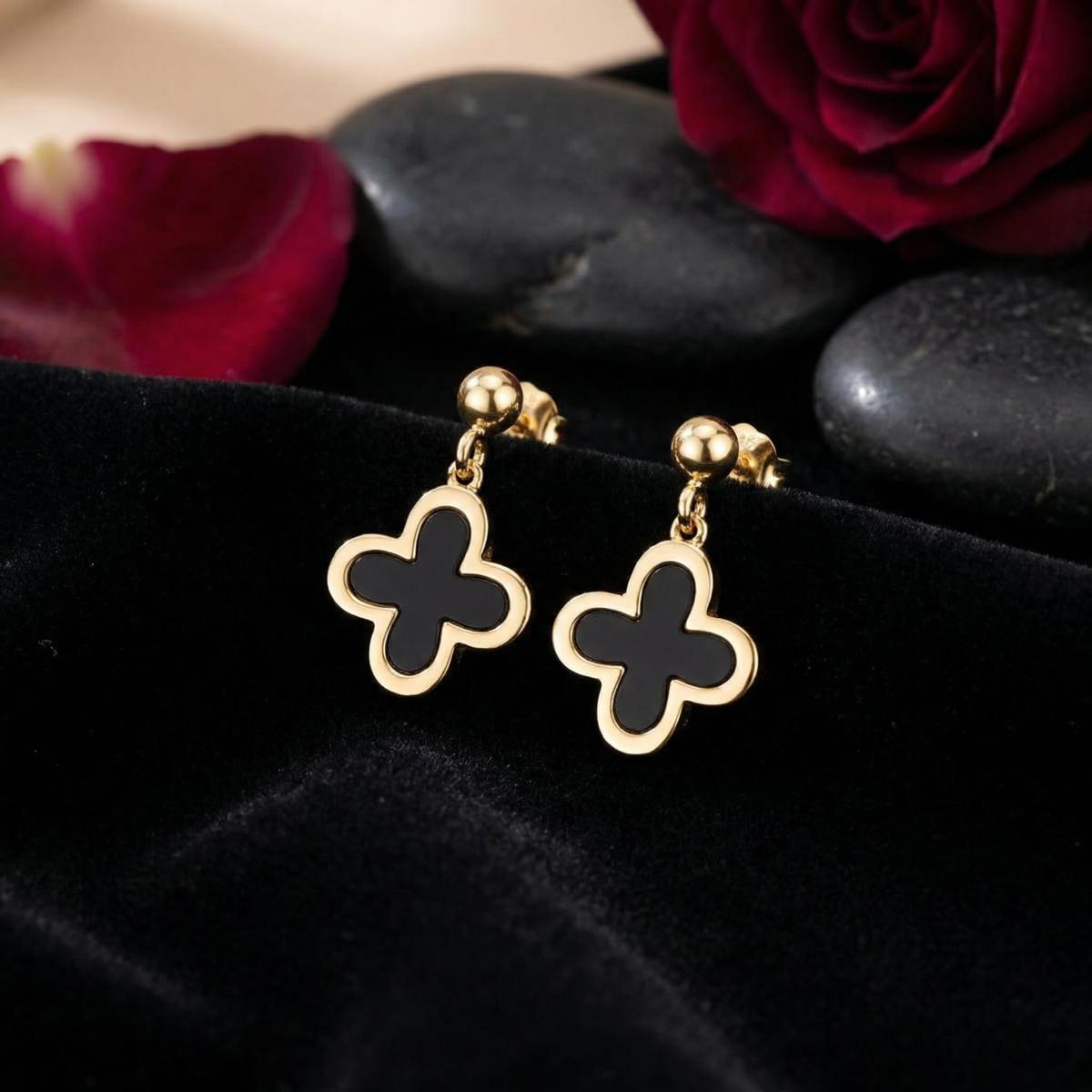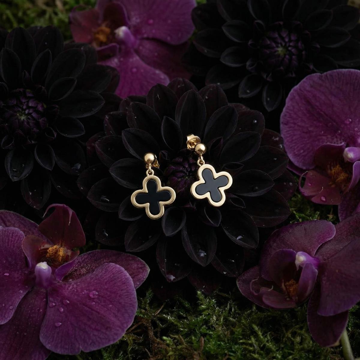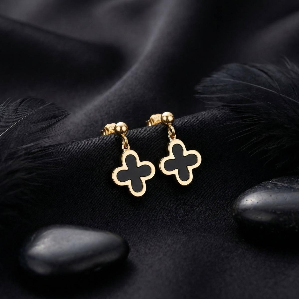 - Златни обеци във формата на детелинка с черен оникс