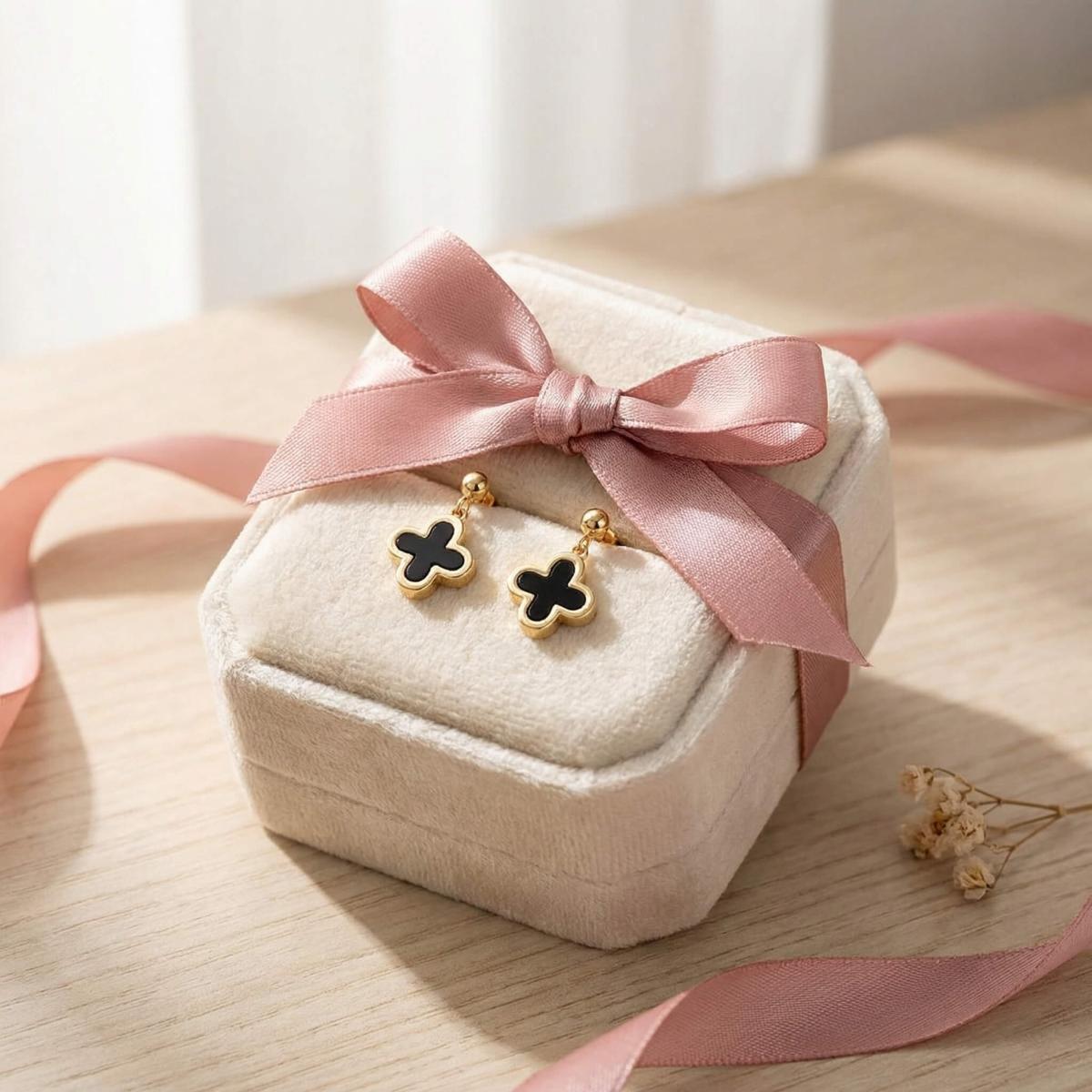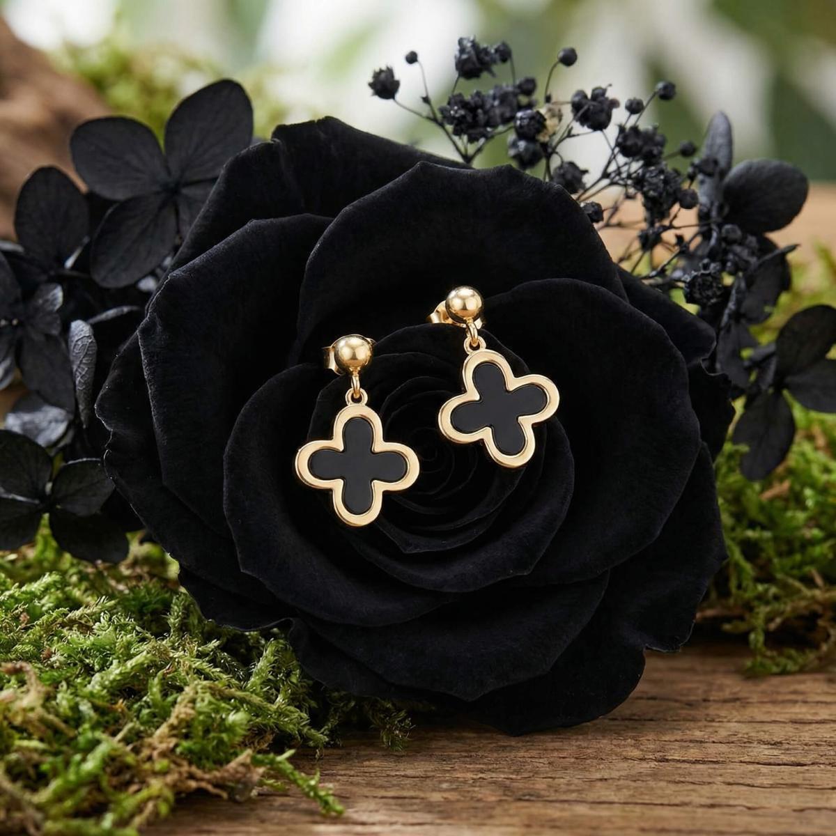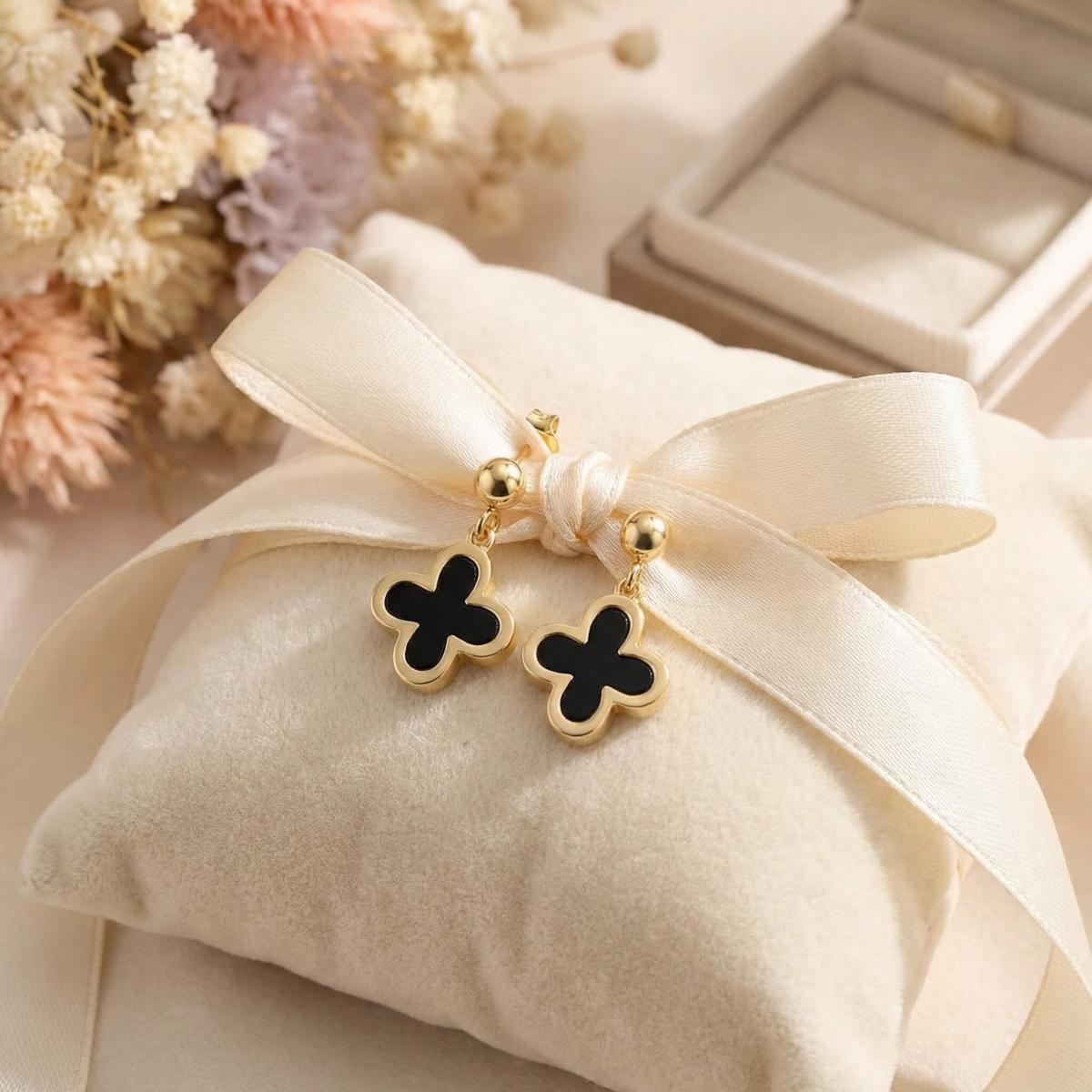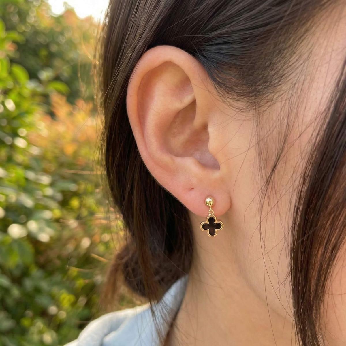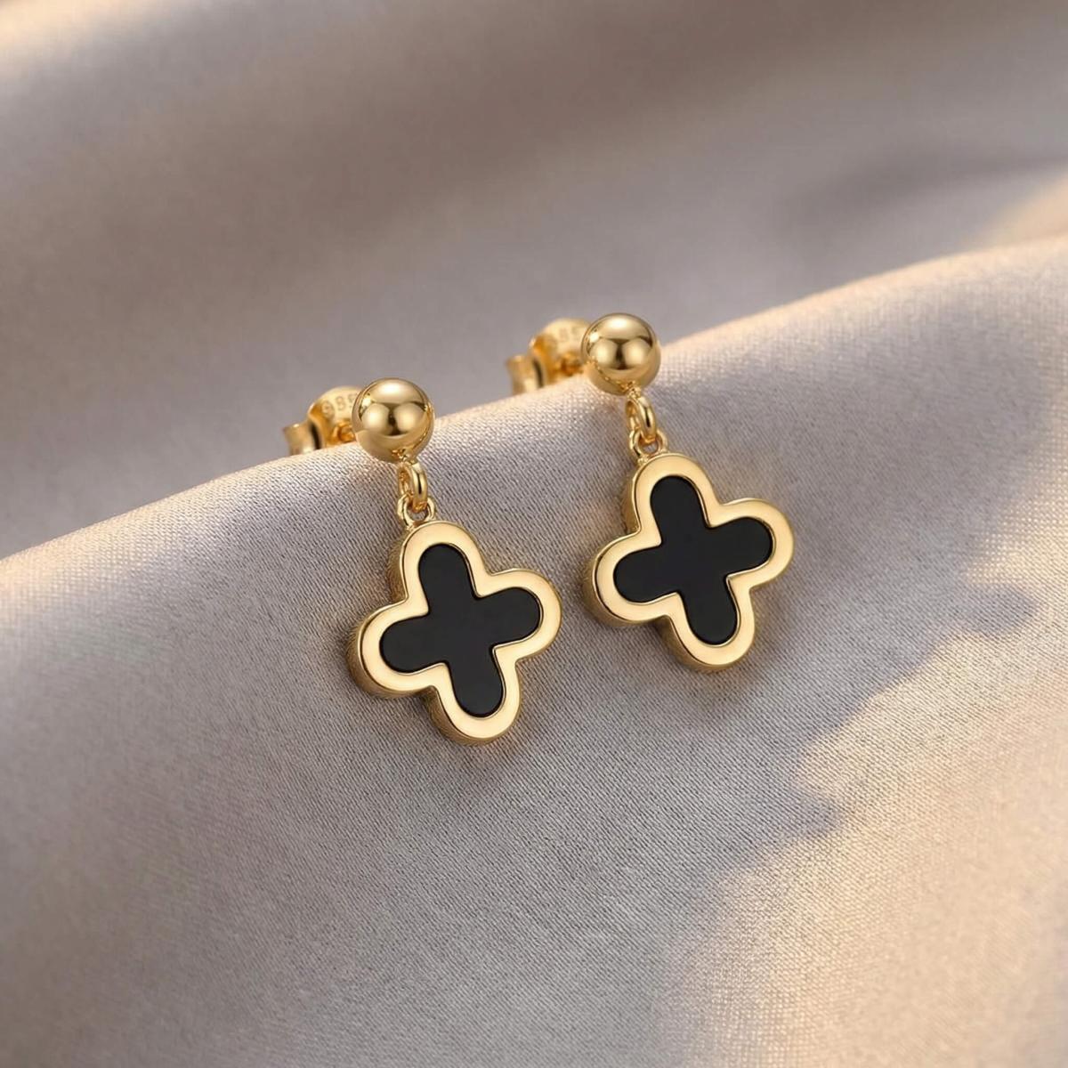 - Златни обеци във формата на детелинка с черен оникс