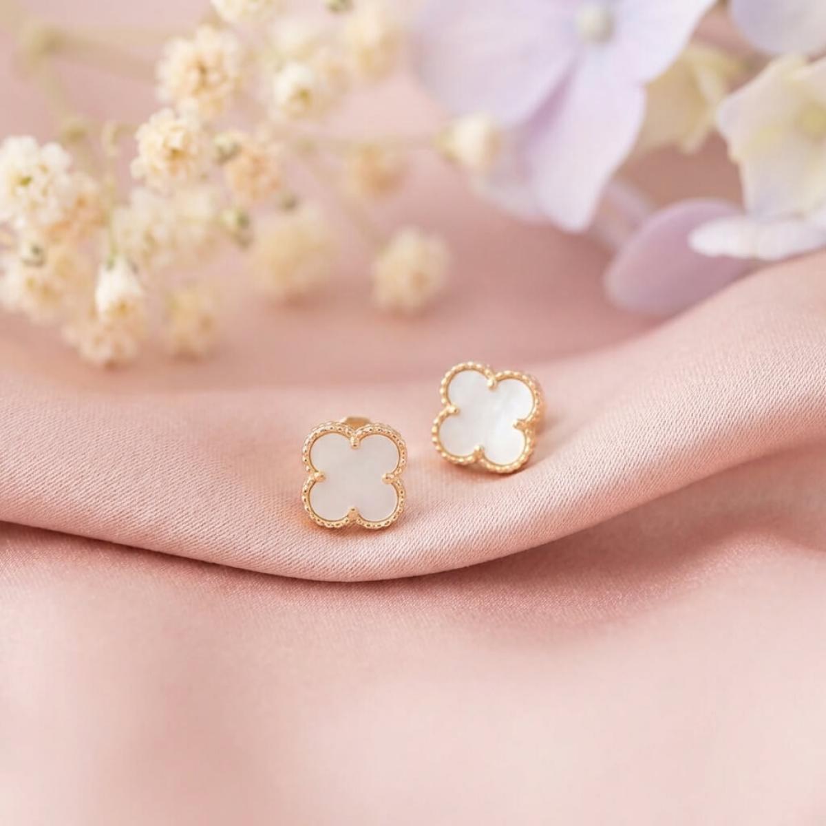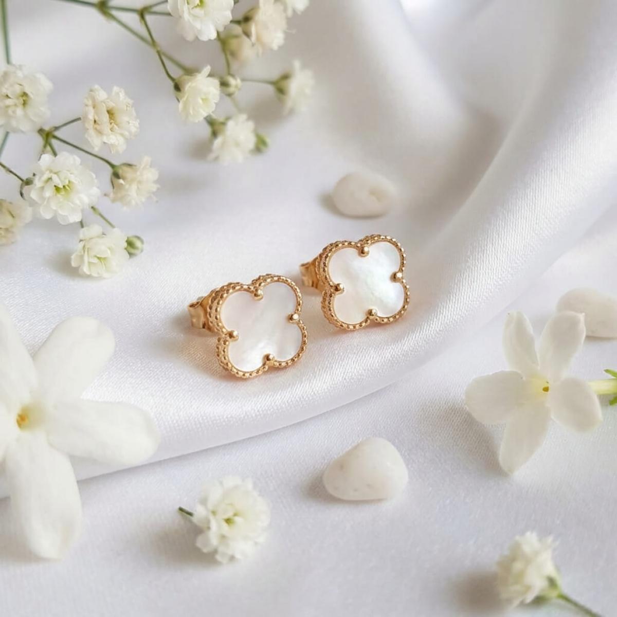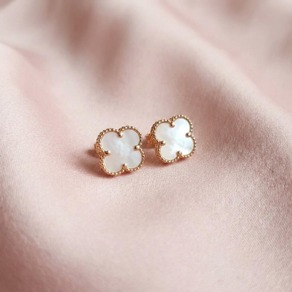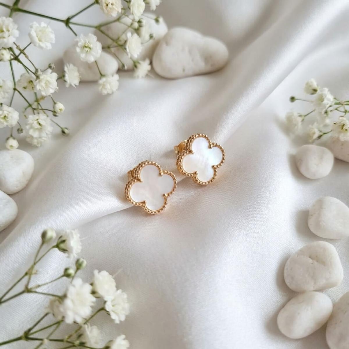 - Златни обеци във формата на детелинка с нежен опал