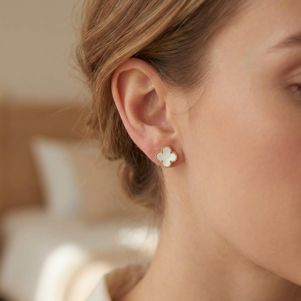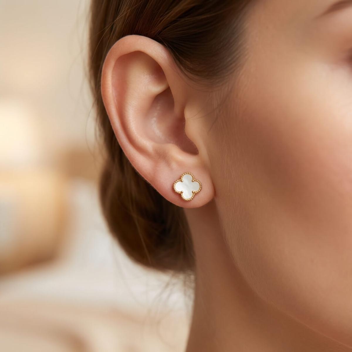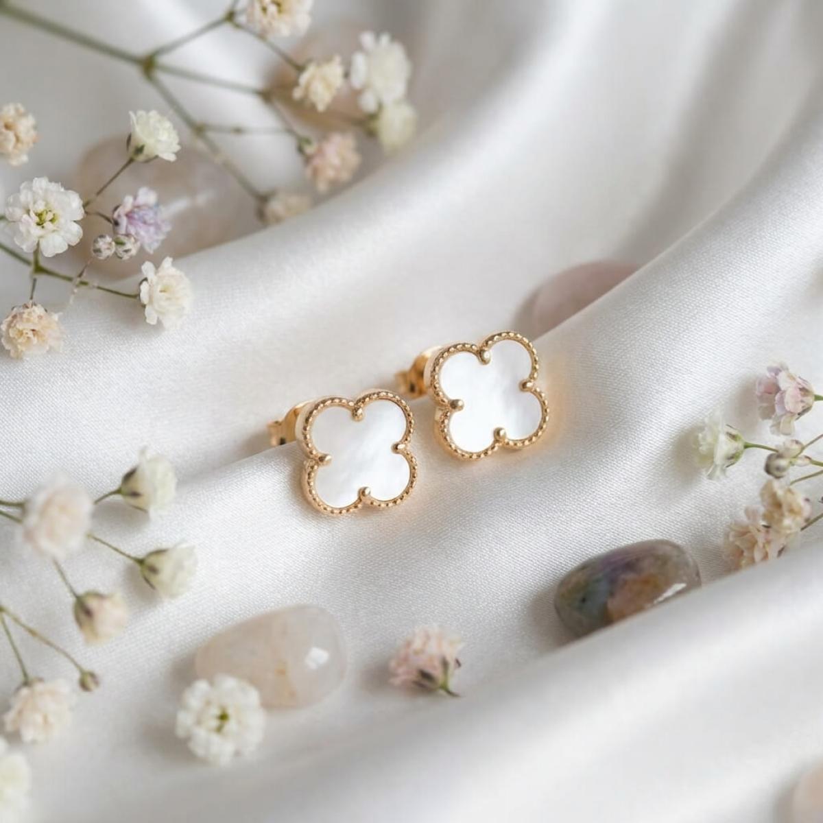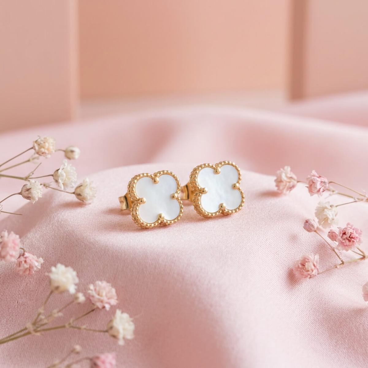 - Златни обеци във формата на детелинка с нежен опал