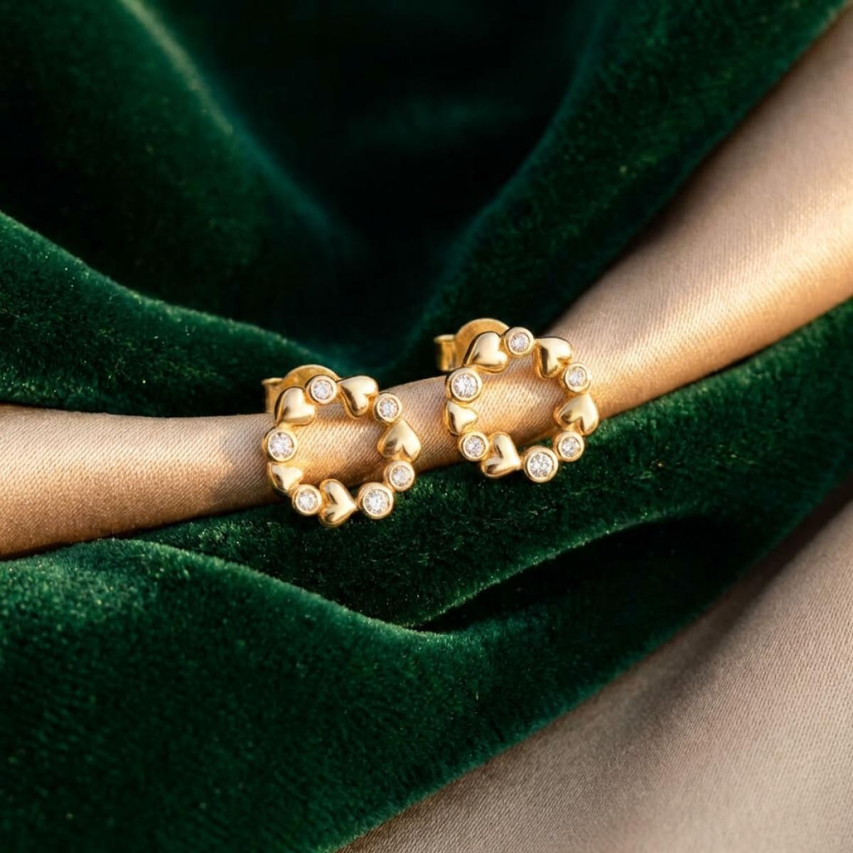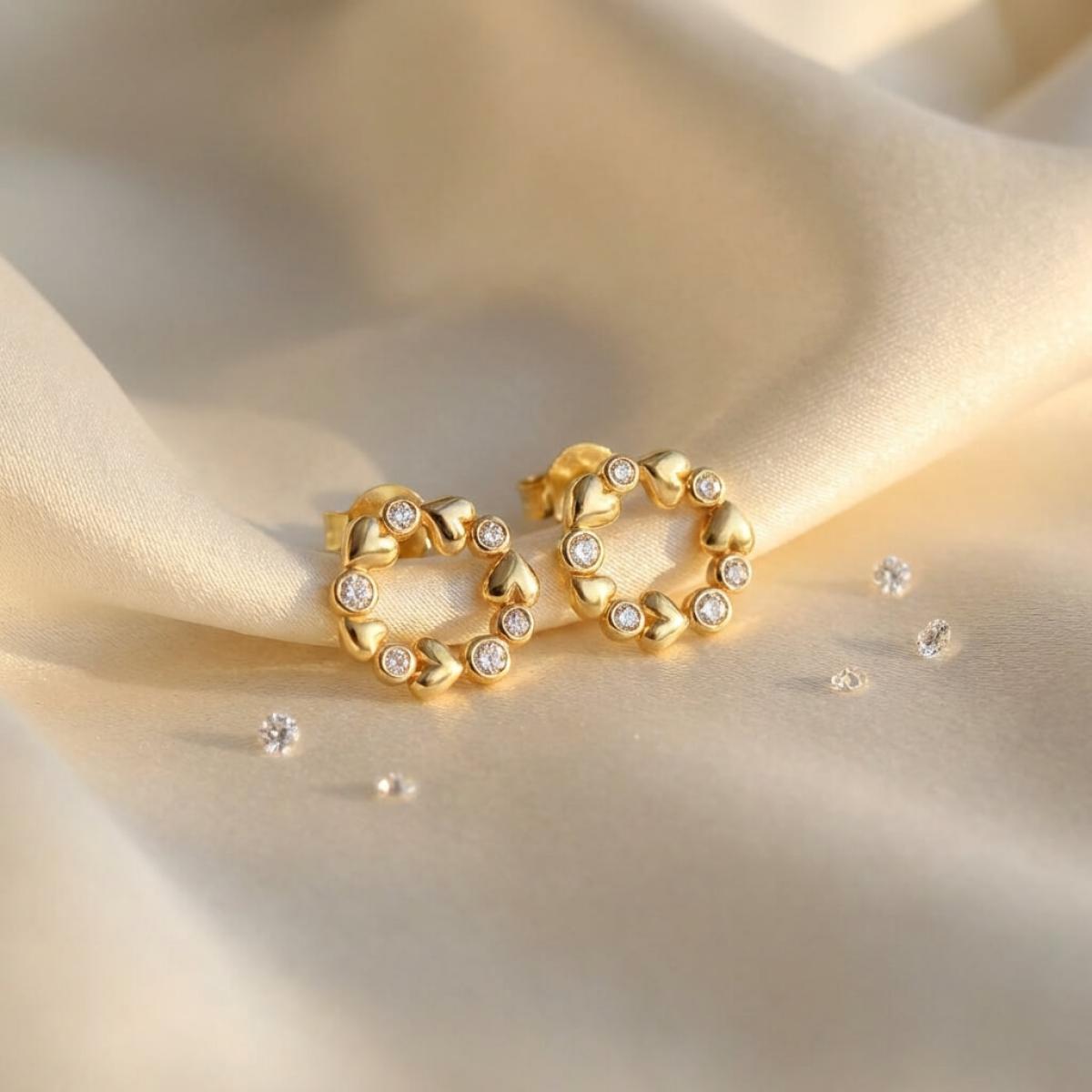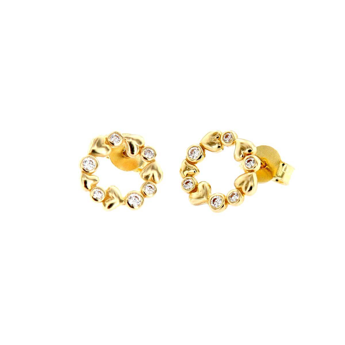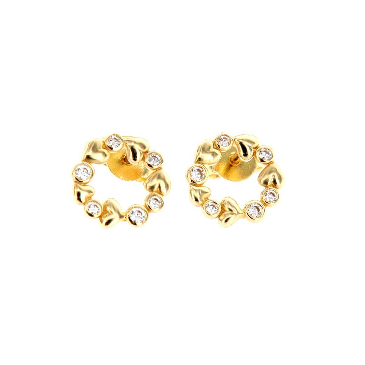Златните дамски обеци "Fantasy Love" са нашето уникално предложение за дамите с изящен вкус и неподражаем стил, които подбират умело както своите тоалети, така и аксесоарите. Този чифт обаятелни накити е подходящ за специални поводи и за ежедневието. Дизайнът на изделието наподобява венец от цветя, в който се редуват елементи с форма на сърца и такива с инкрустирани в тях циркони.