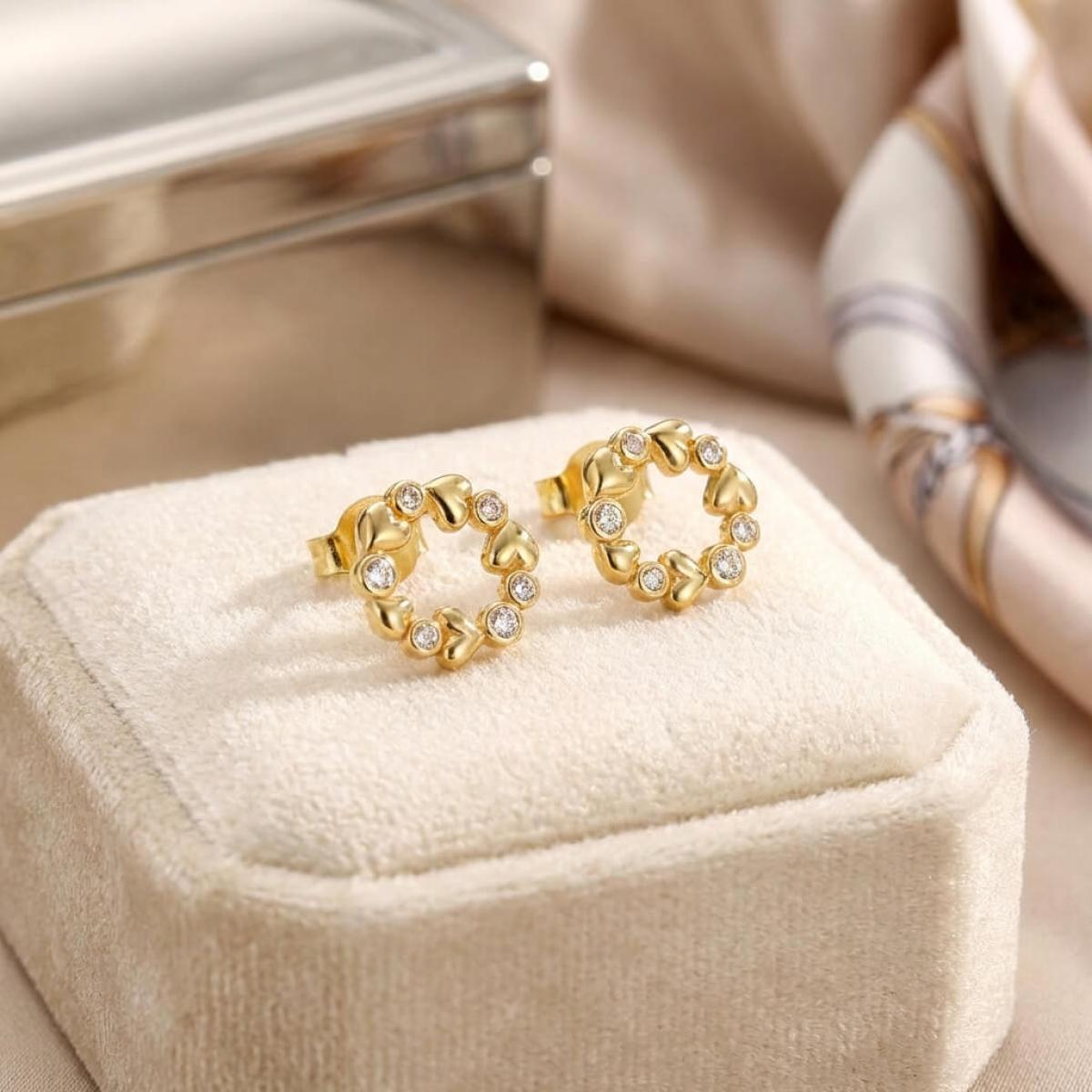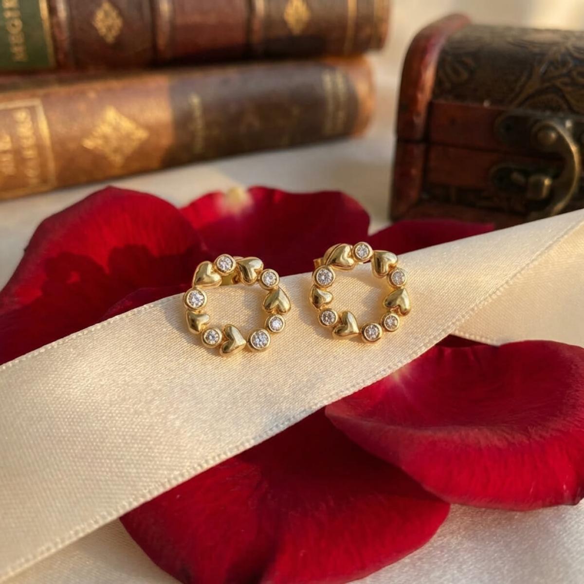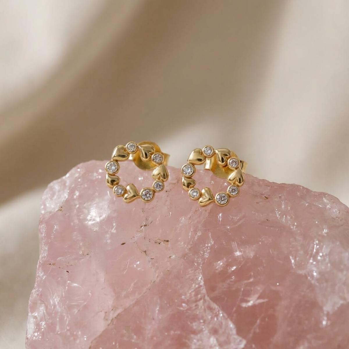 Златните дамски обеци "Fantasy Love" са нашето уникално предложение за дамите с изящен вкус и неподражаем стил, които подбират умело както своите тоалети, така и аксесоарите. Този чифт обаятелни накити е подходящ за специални поводи и за ежедневието. Дизайнът на изделието наподобява венец от цветя, в който се редуват елементи с форма на сърца и такива с инкрустирани в тях циркони.