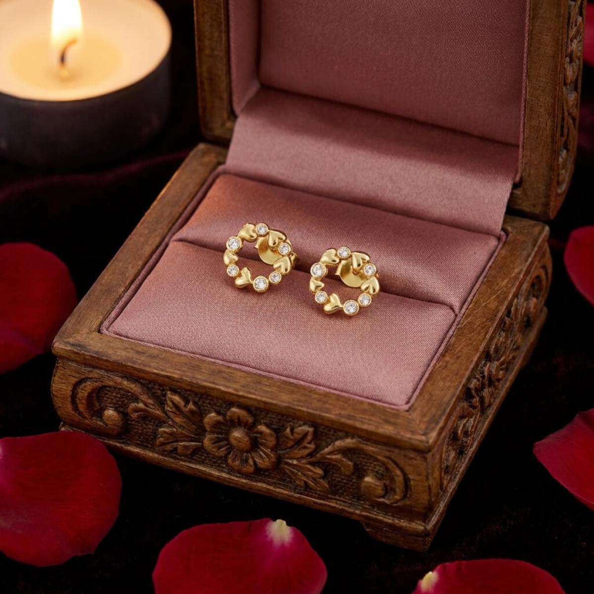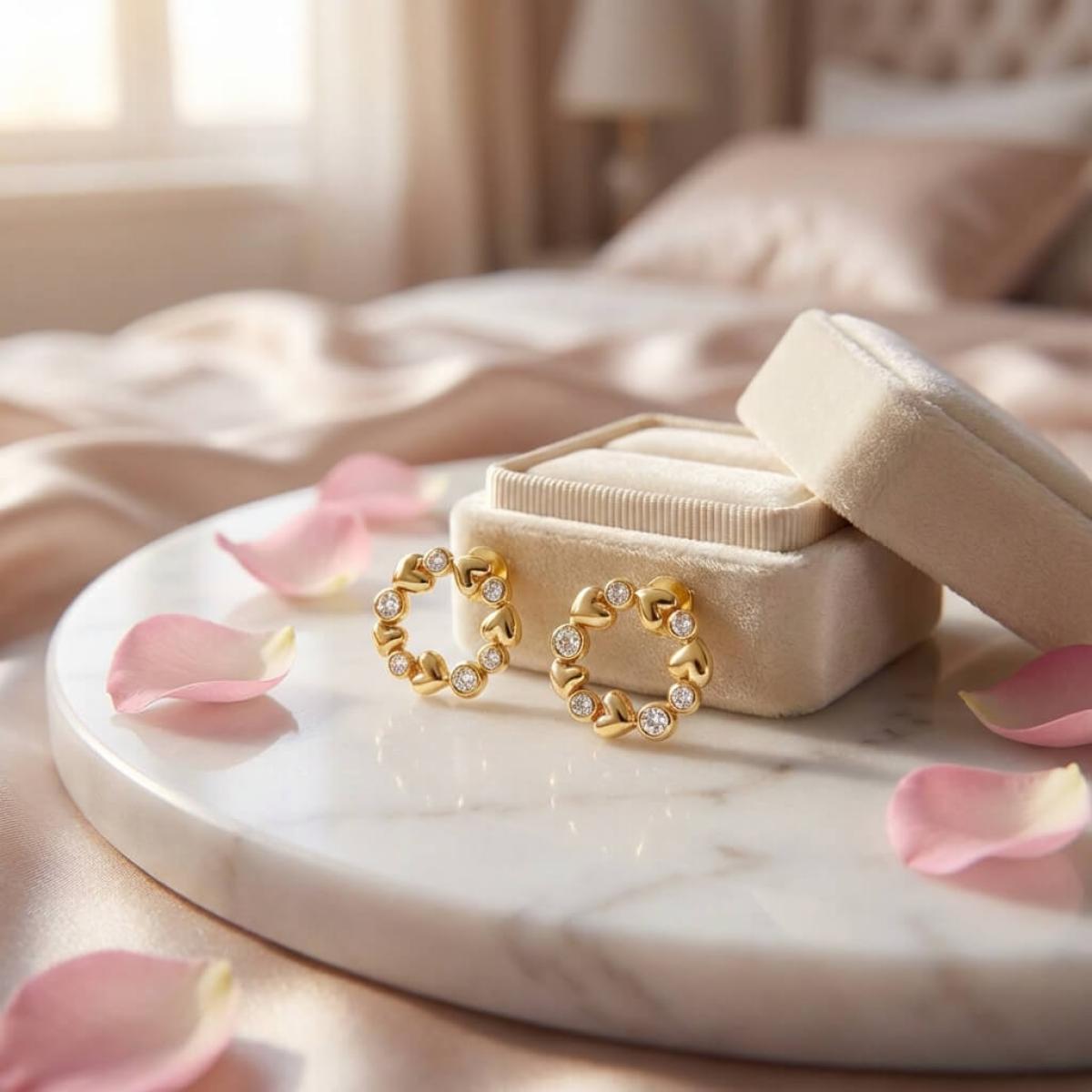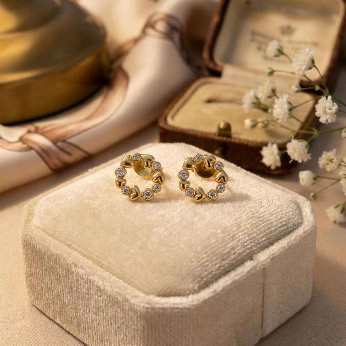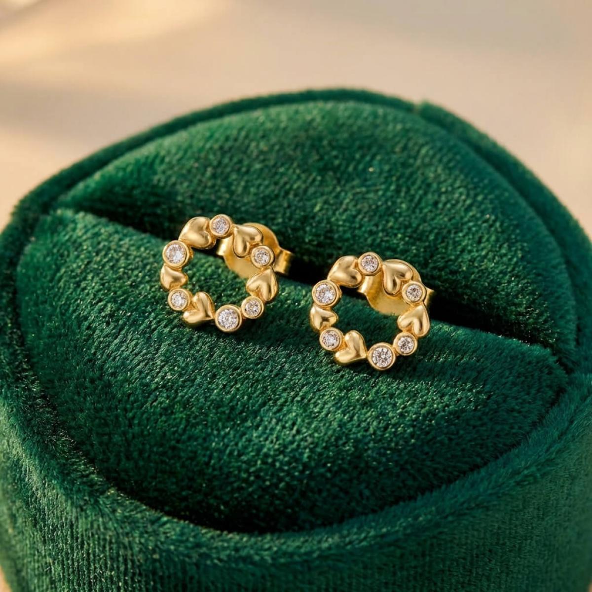 Златните дамски обеци "Fantasy Love" са нашето уникално предложение за дамите с изящен вкус и неподражаем стил, които подбират умело както своите тоалети, така и аксесоарите. Този чифт обаятелни накити е подходящ за специални поводи и за ежедневието. Дизайнът на изделието наподобява венец от цветя, в който се редуват елементи с форма на сърца и такива с инкрустирани в тях циркони.