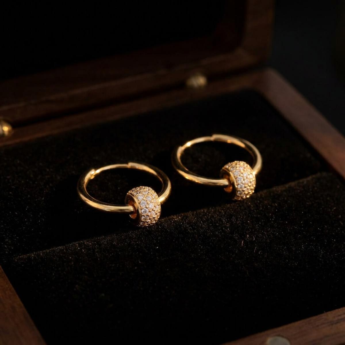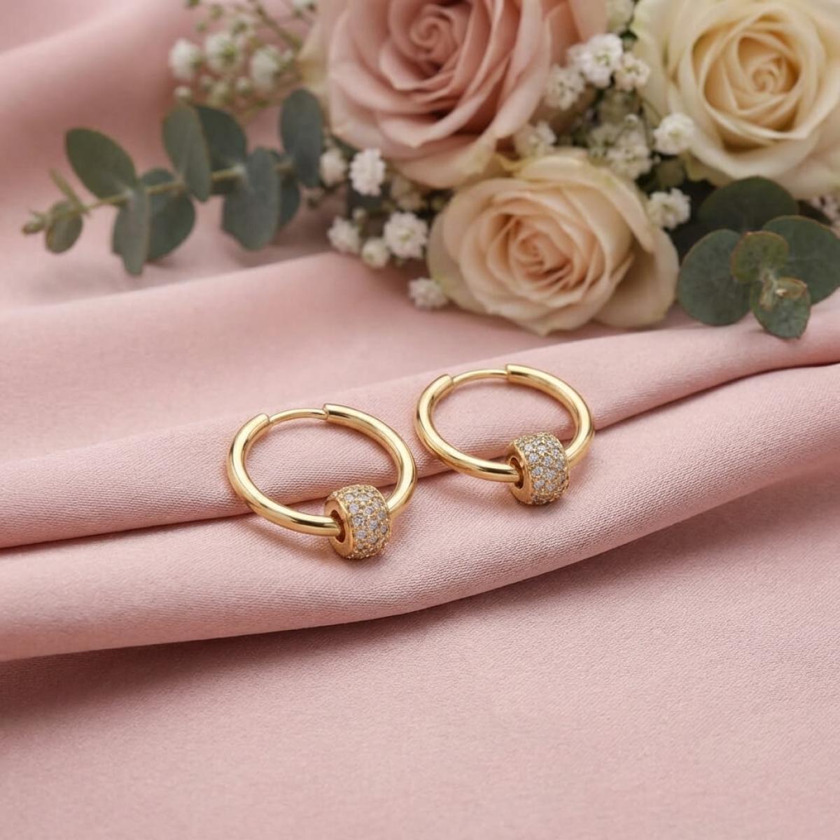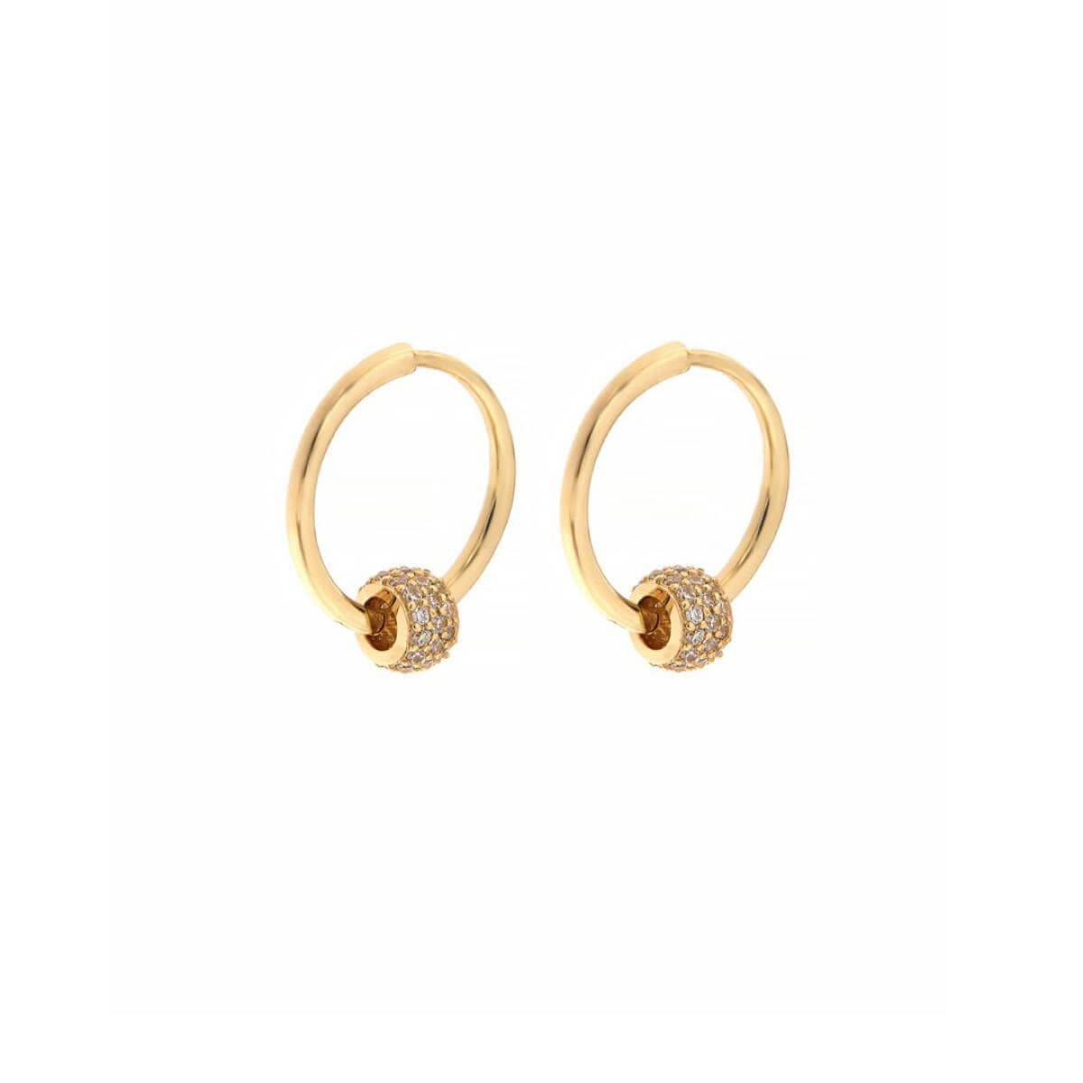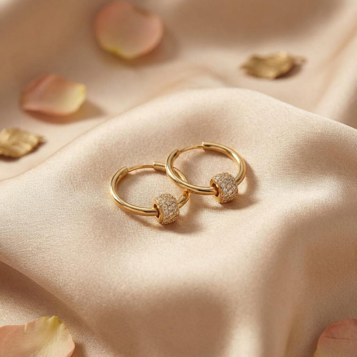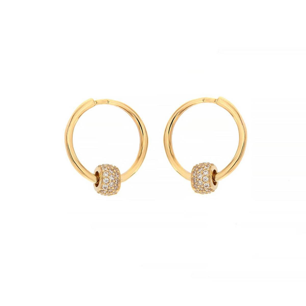 В предната част на всяка обеца са инкрустирани бели циркони. Камъните се комбинират чудесно с класическия жълт цвят на златото. Цирконите са бюджетният аналог на диаманта, доближавайки се до неговата способност за светлопречупване.