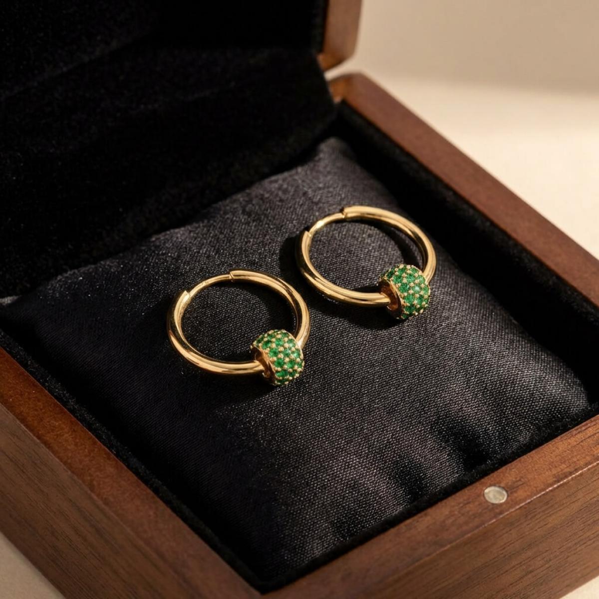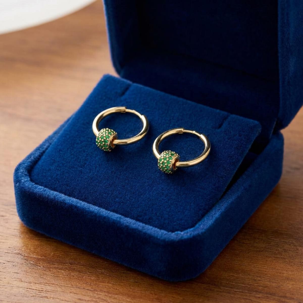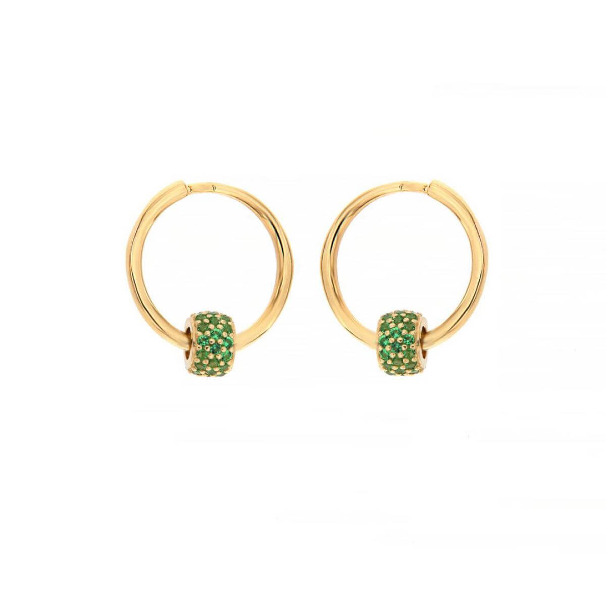 В предната част на всяка обеца са инкрустирани цветни циркони. Камъните се комбинират чудесно с класическия жълт цвят на златото. Цирконите са бюджетният аналог на диаманта, доближавайки се до неговата способност за светлопречупване.