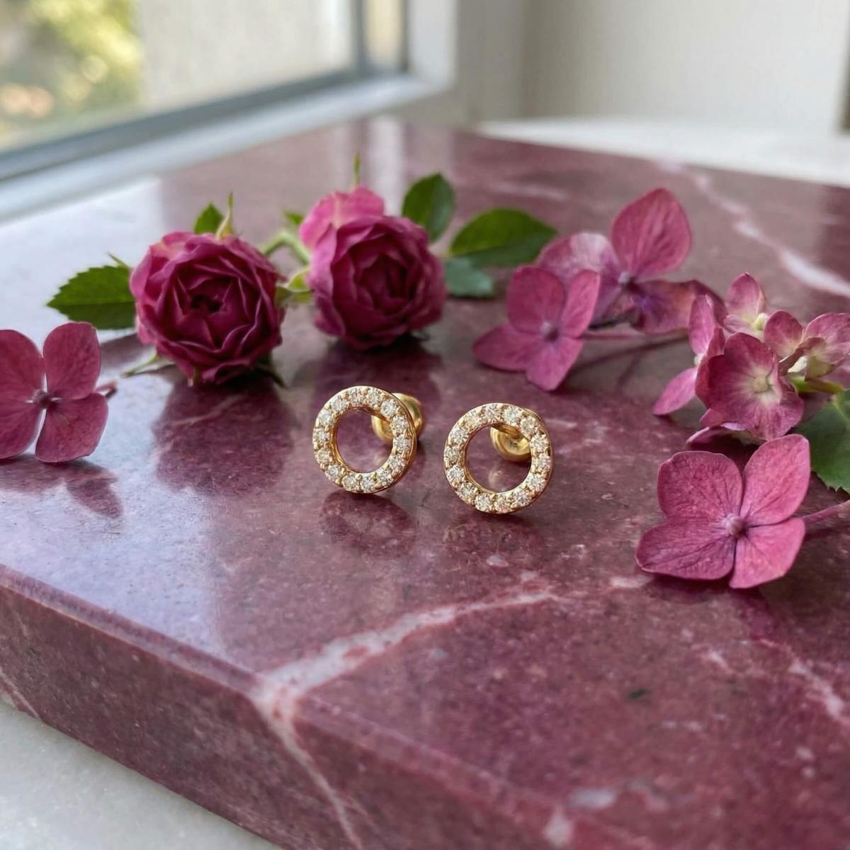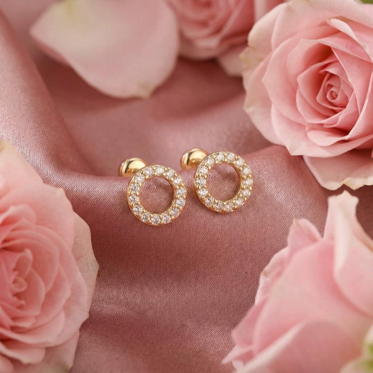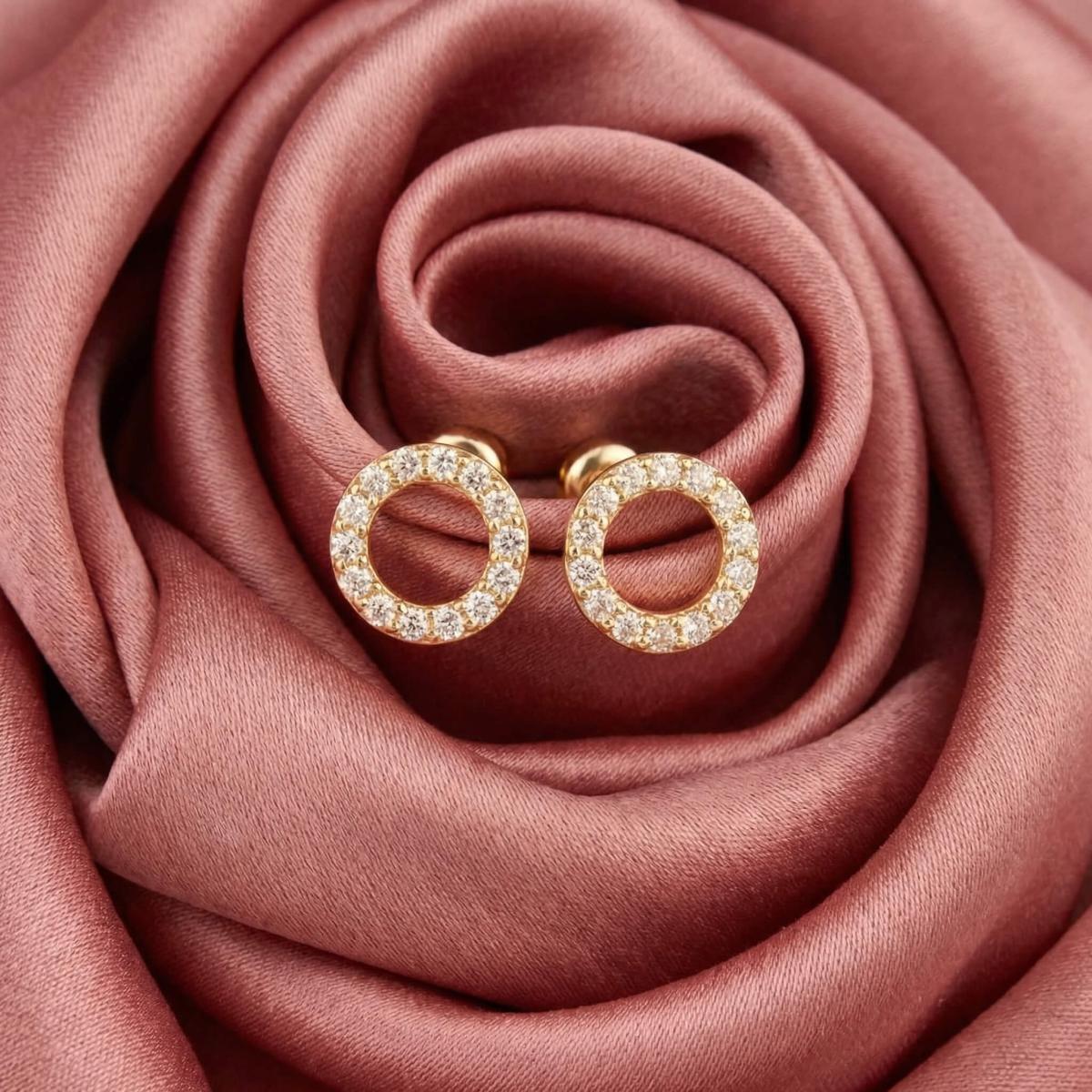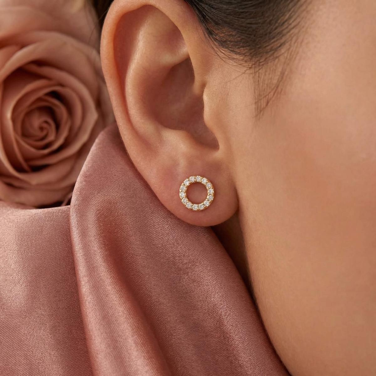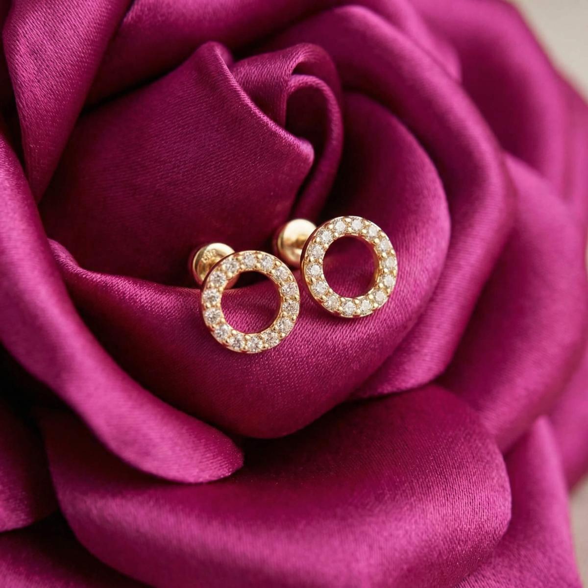 Обеците са изработени от злато и са украсени с бели циркони, които придават блясък и елегантност на бижуто. Дизайнът във формата на кръг е символ на хармония и пълнота, като обобщава символиката на кармата - вярата в доброто и красивото в живота.