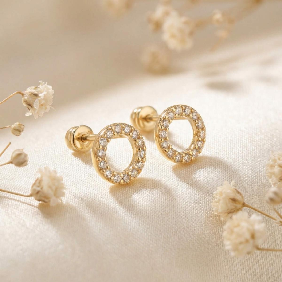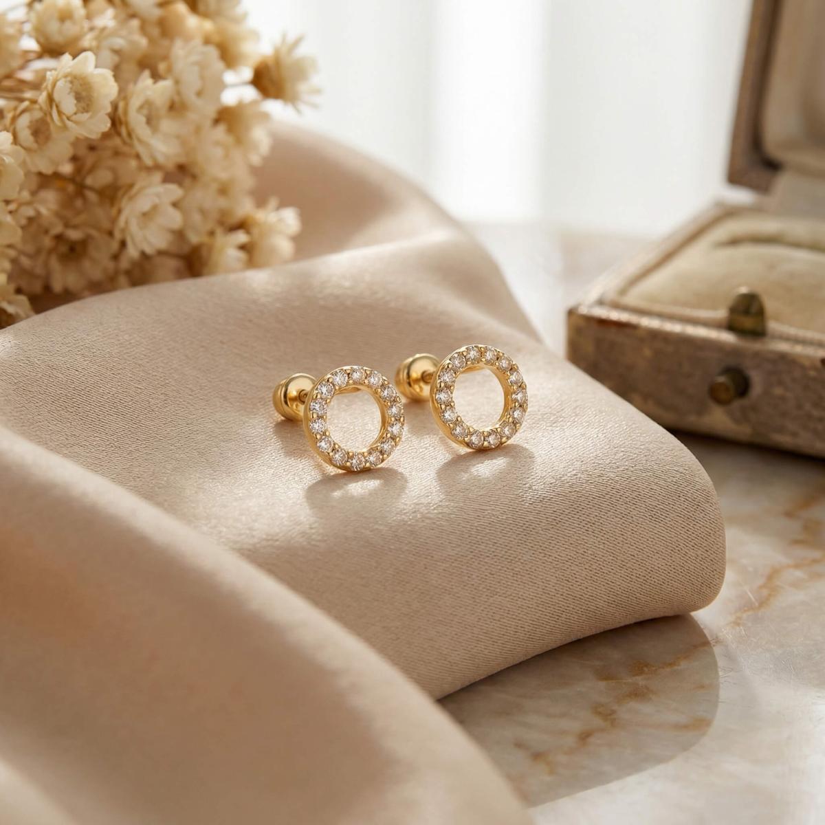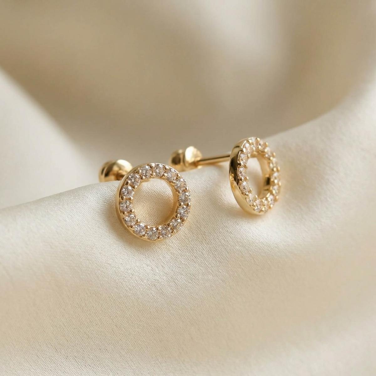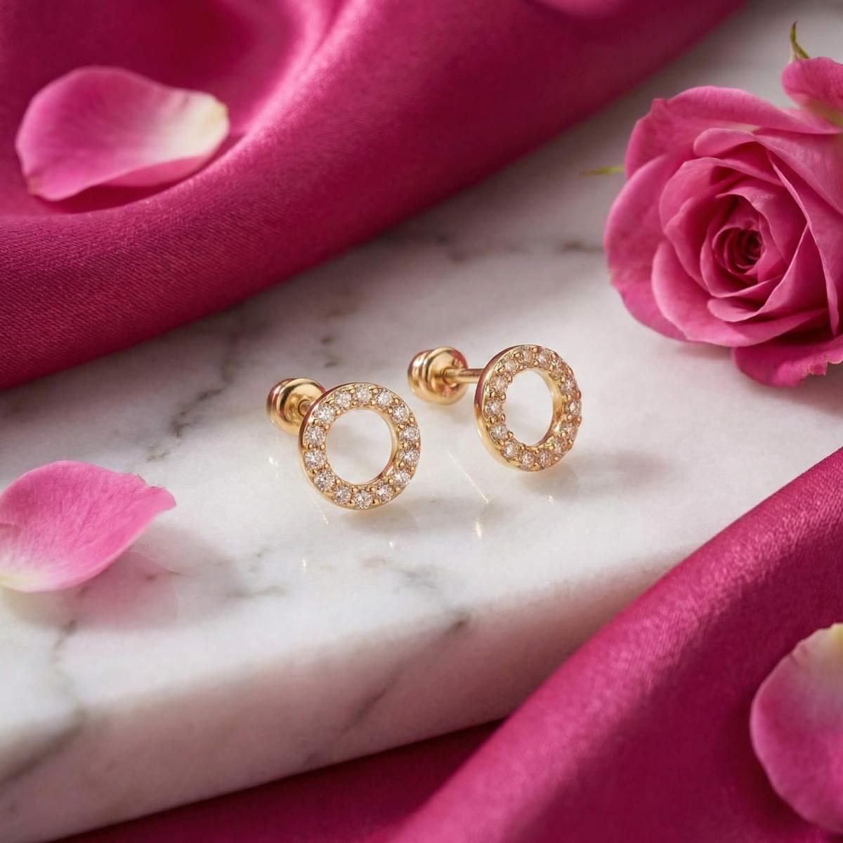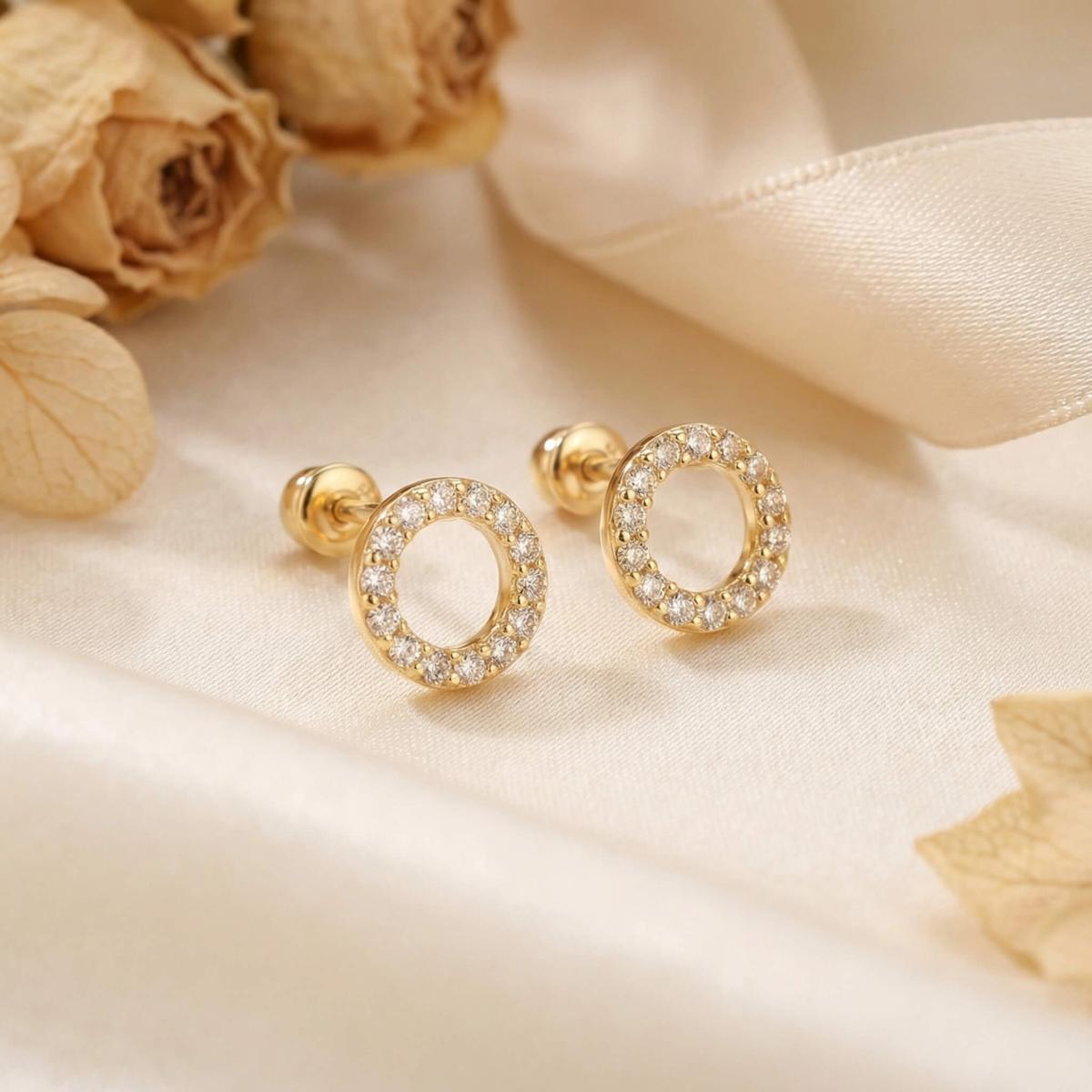 Обеците са изработени от злато и са украсени с бели циркони, които придават блясък и елегантност на бижуто. Дизайнът във формата на кръг е символ на хармония и пълнота, като обобщава символиката на кармата - вярата в доброто и красивото в живота.