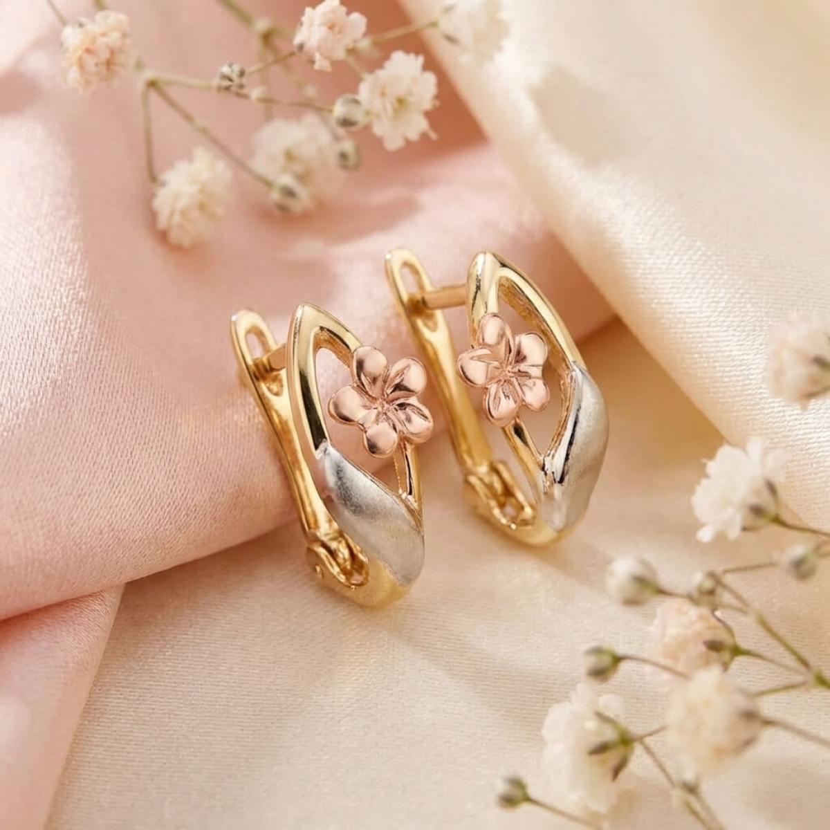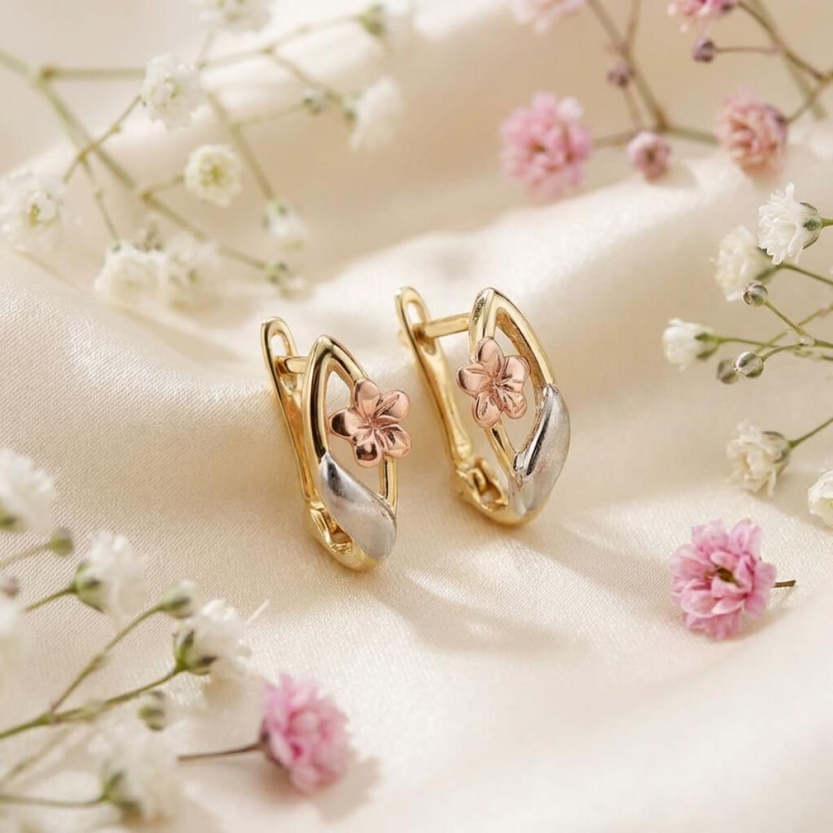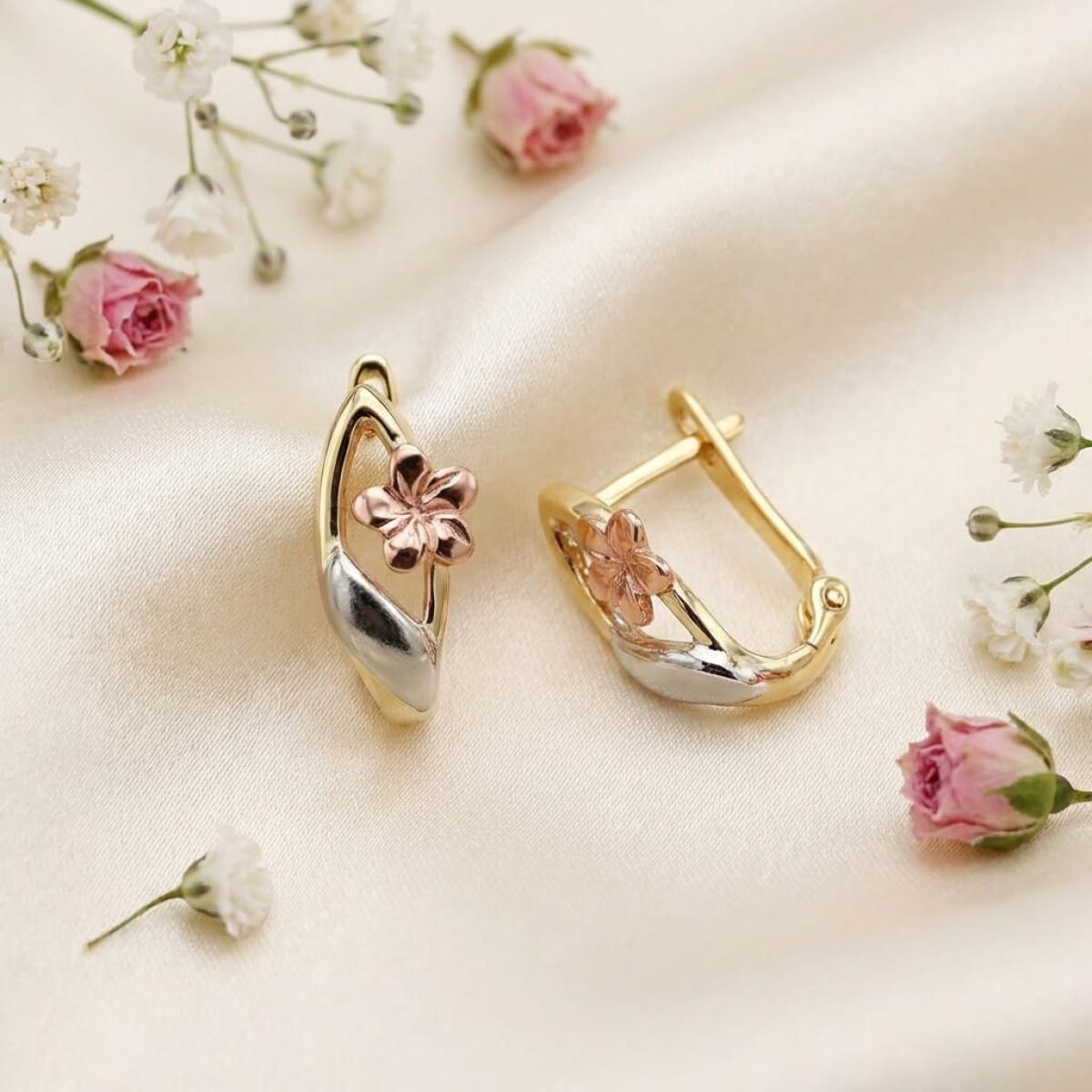Основата е съставена от класическа жълта златна сплав, а лицевата част, оформена като цвете, е изработена от бяло и розово злато. Крайният резултат е едно брилянтно украшение, подходящо както за специални поводи, така и за ежедневието. Липсата на масивна структура и висящи елементи ги прави подходящи дори за ученички и студентки.