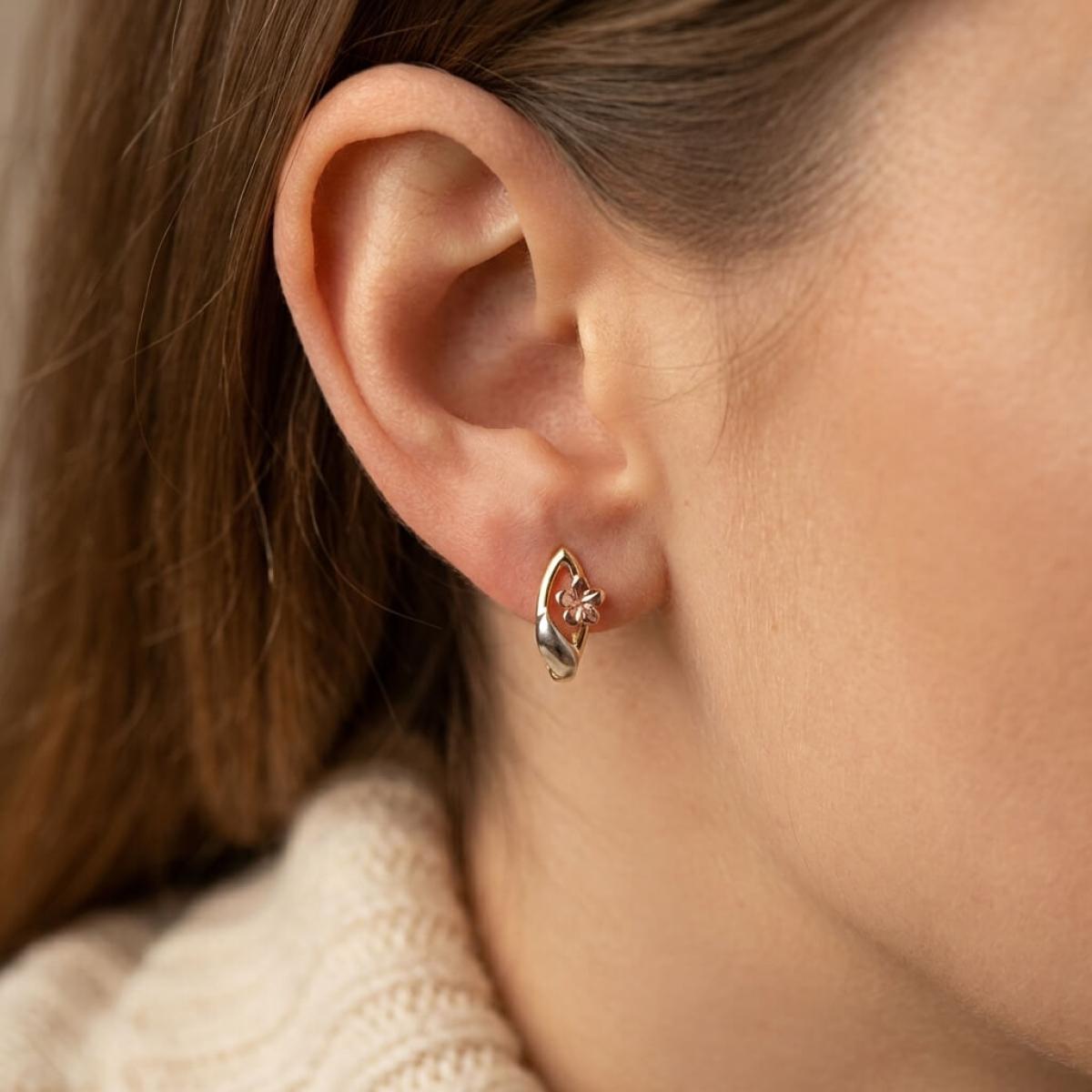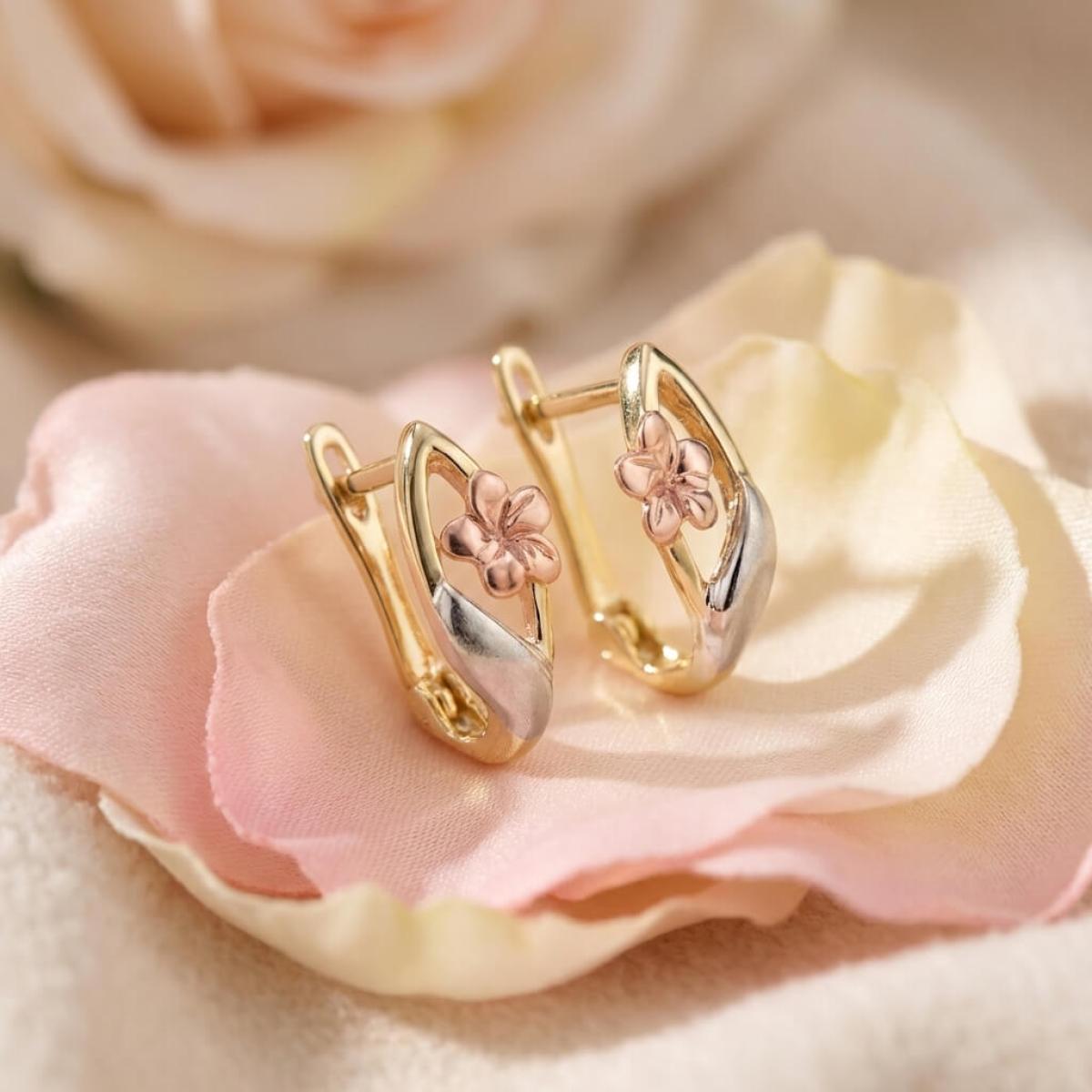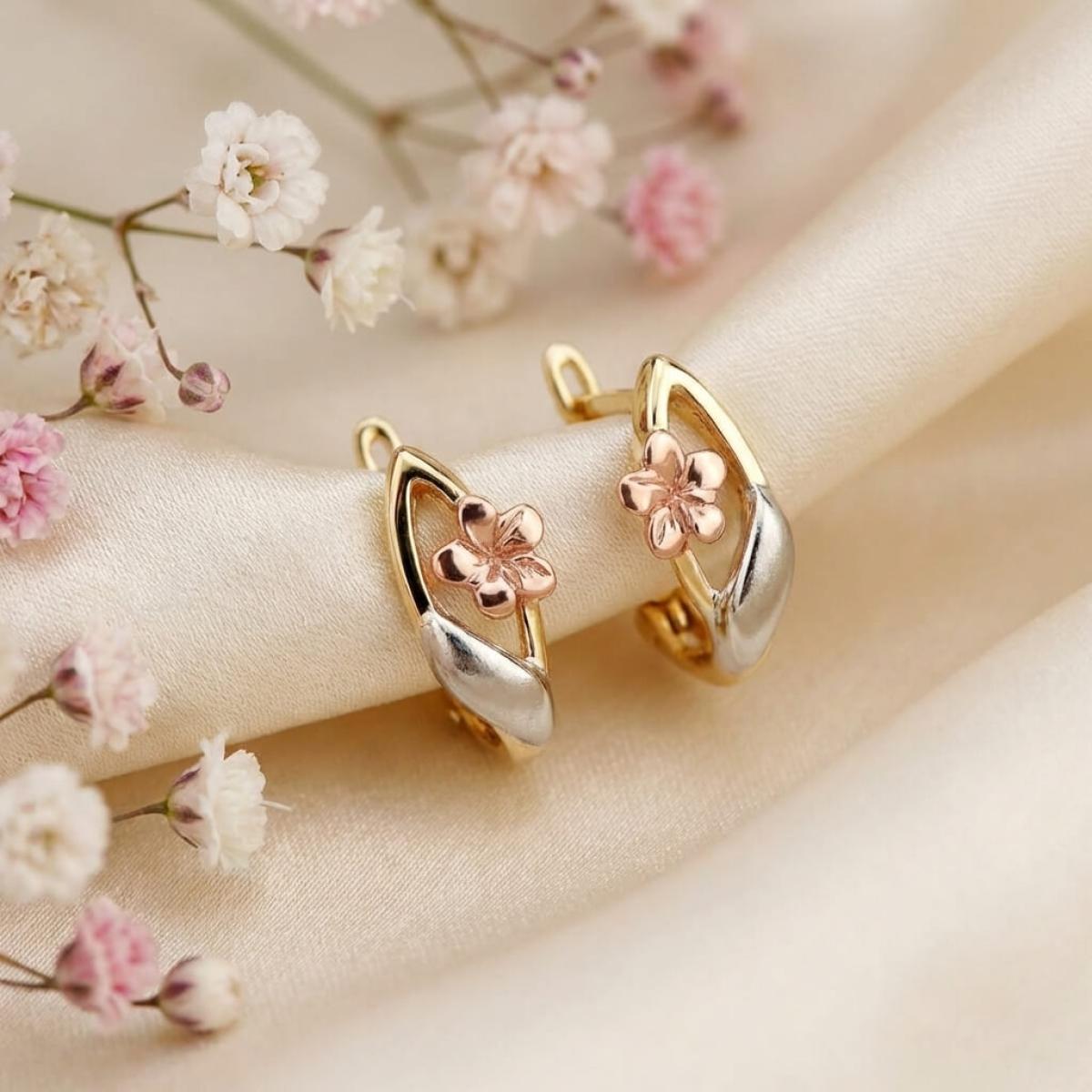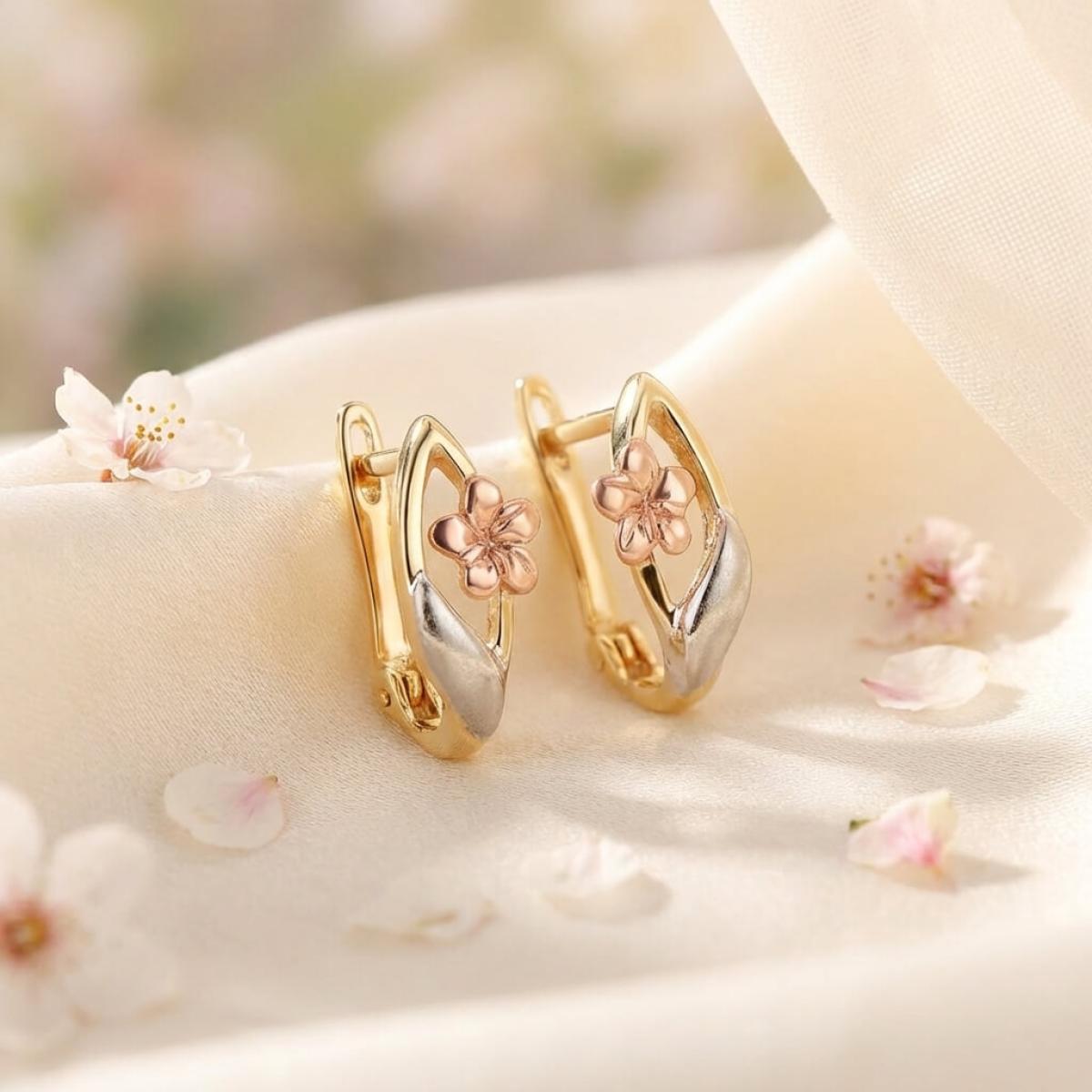 Основата е съставена от класическа жълта златна сплав, а лицевата част, оформена като цвете, е изработена от бяло и розово злато. Крайният резултат е едно брилянтно украшение, подходящо както за специални поводи, така и за ежедневието. Липсата на масивна структура и висящи елементи ги прави подходящи дори за ученички и студентки.