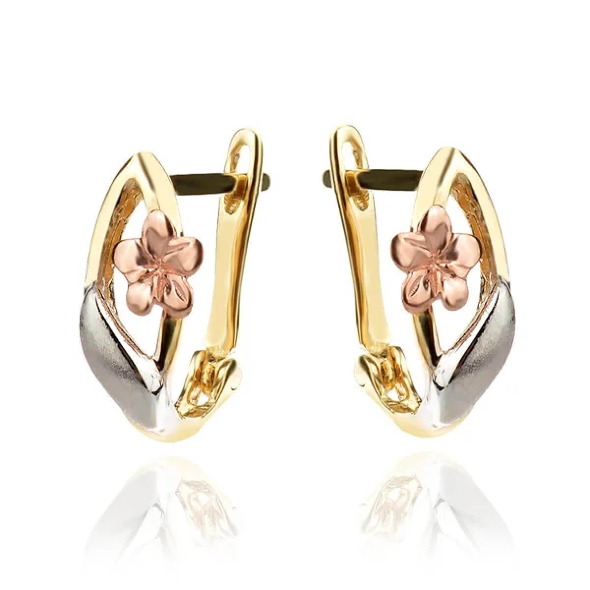 Едновременно елегантни и нежни, тези обеци, внимателно изработени от злато 14 К, излъчват усещане за съвършенство. Акцентът тук е умелото съчетание на 3 цвята злато -бяло, жълто и розово, което придава на модела свеж и изискан вид. Уникален дизайн, който с лекота ще допълни вашата визия със стил и грация.