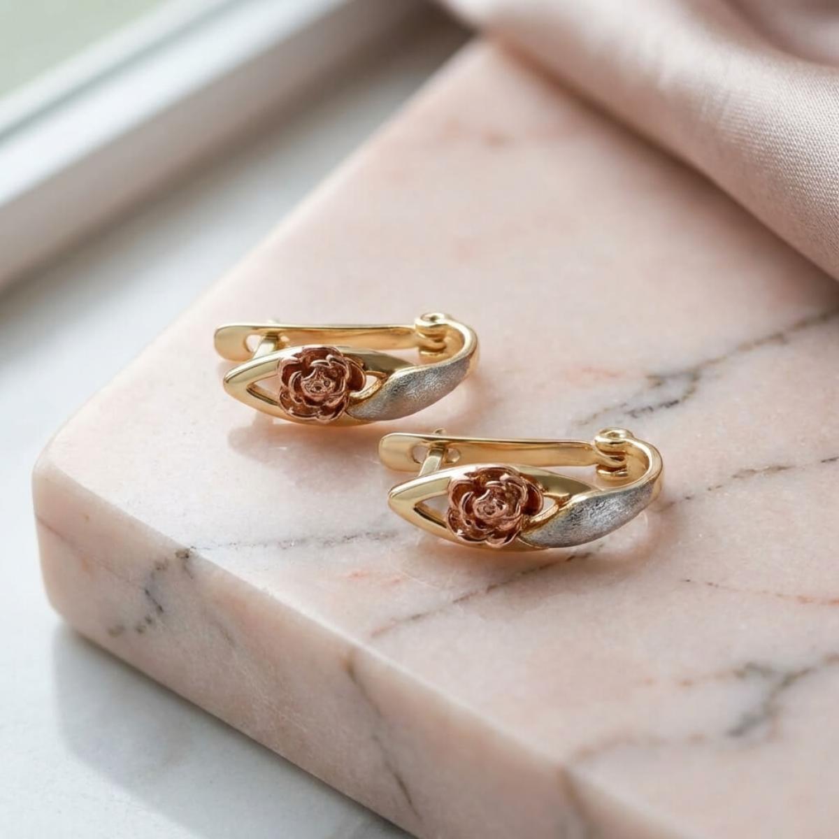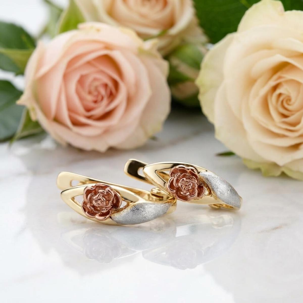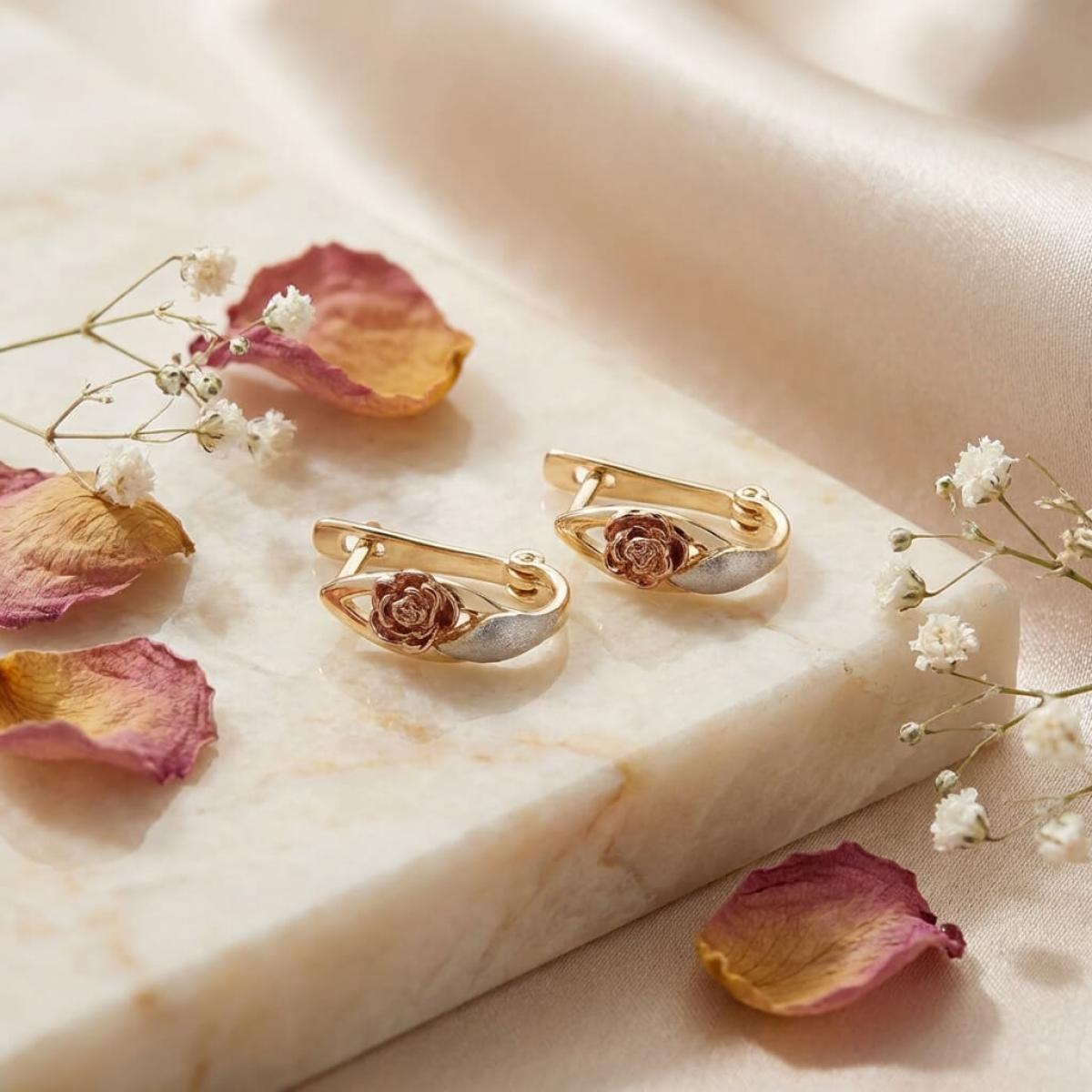 Основата е съставена от класическа жълта златна сплав, а лицевата част, оформена като цвете, е изработена от бяло и розово злато. Крайният резултат е едно брилянтно украшение, подходящо както за специални поводи, така и за ежедневието. Липсата на масивна структура и висящи елементи ги прави подходящи дори за ученички и студентки.